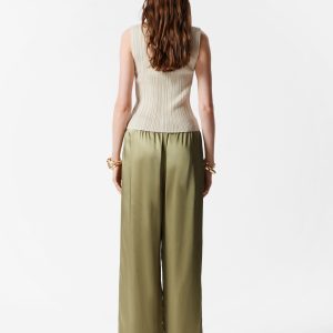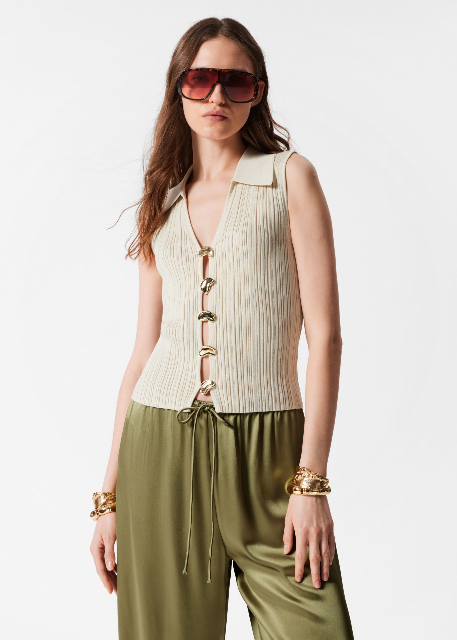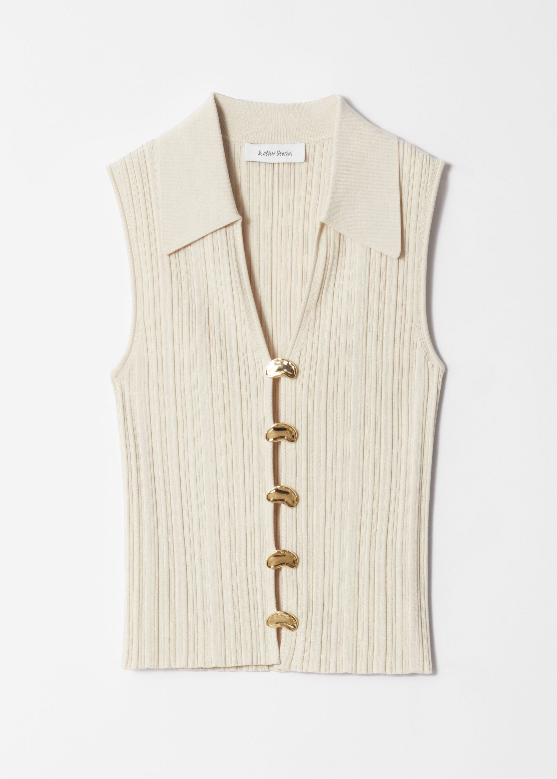 This sleeveless tank top is crafted from a soft and stretchy rib-knit fabric. Designed in a fitted silhouette, it features a pointed collar and a deep v-neckline, accented by bold statement metallic buttons down the front.