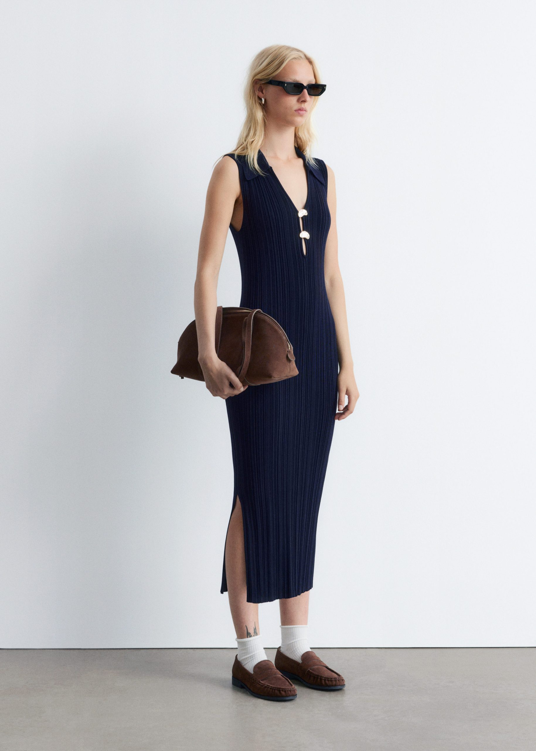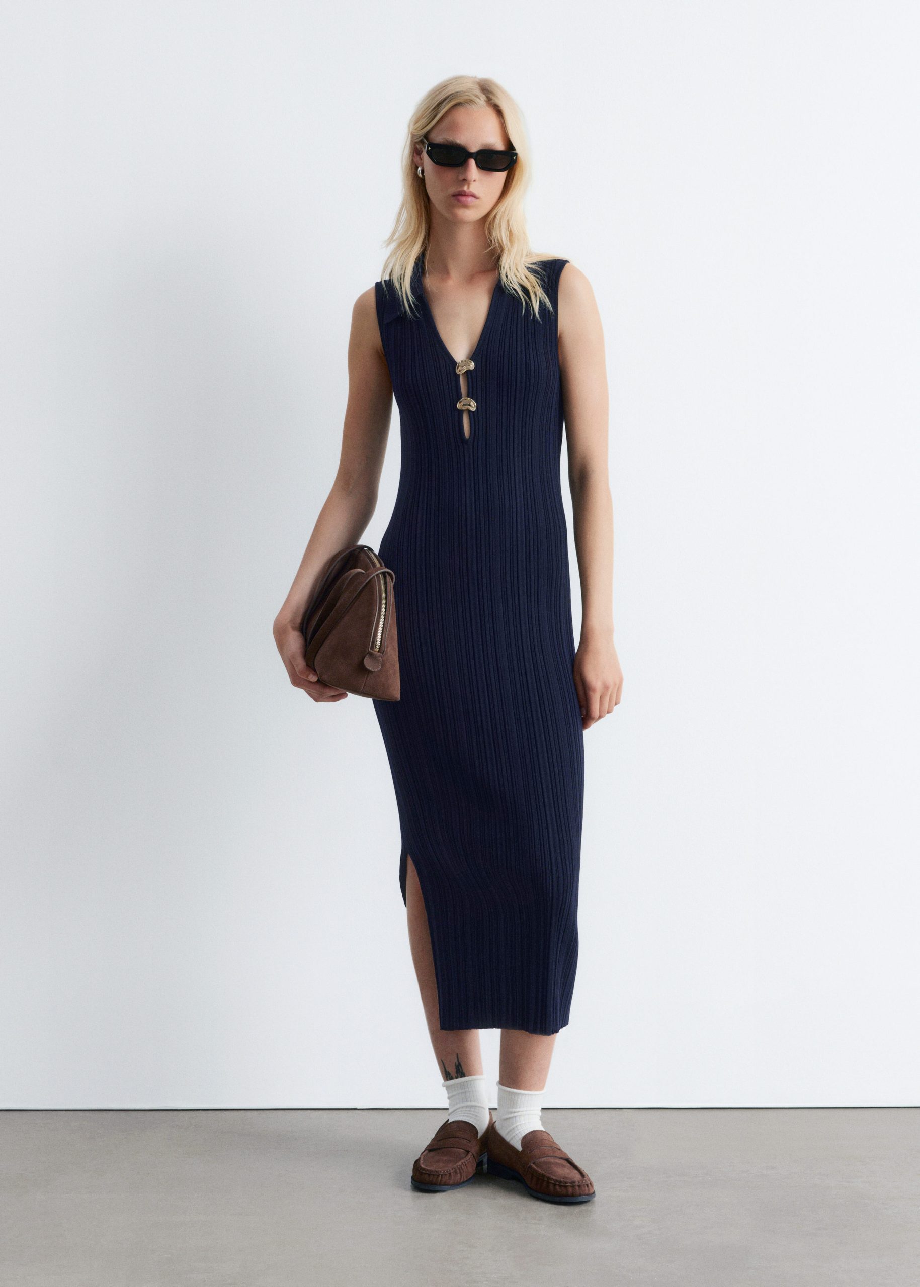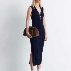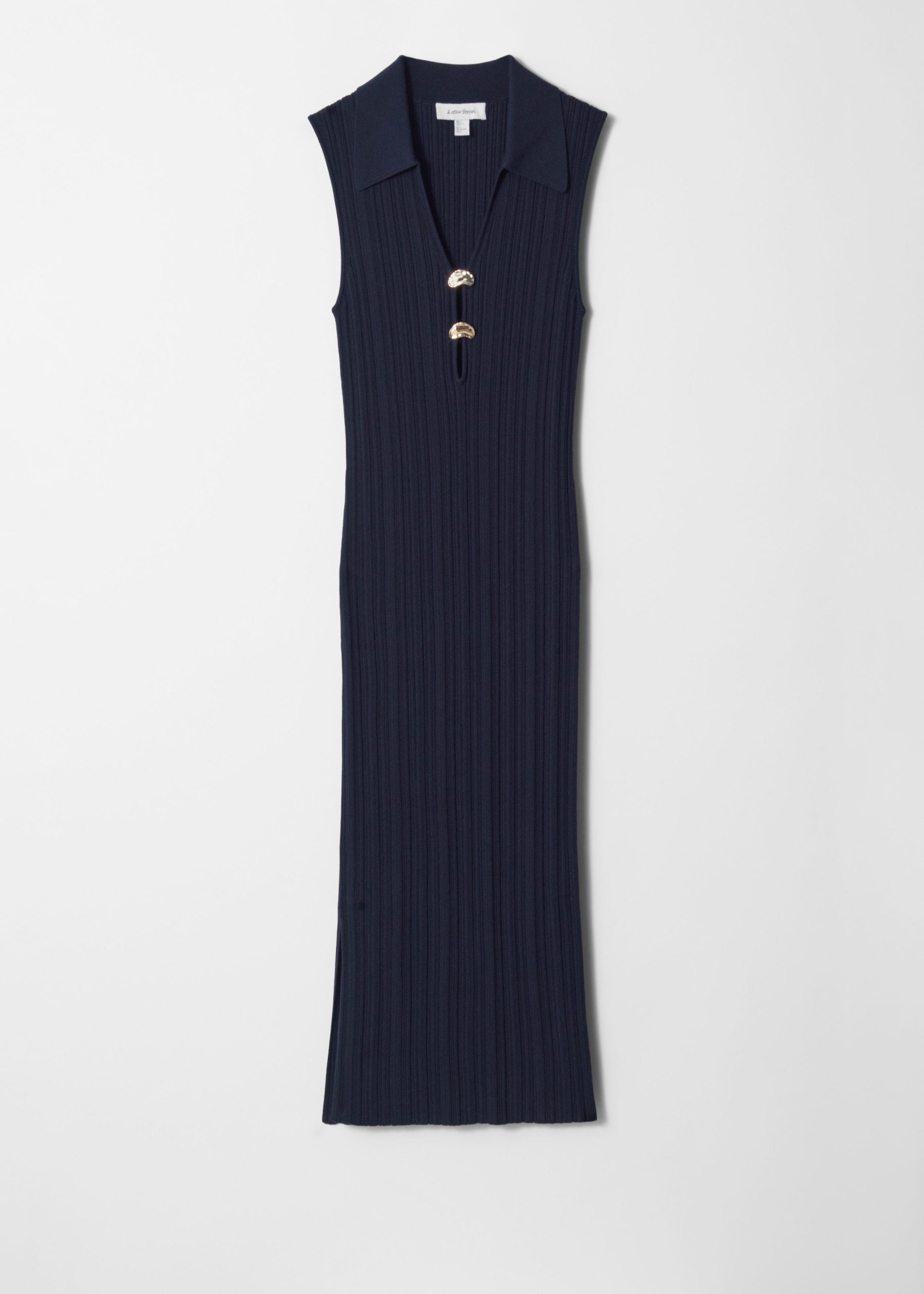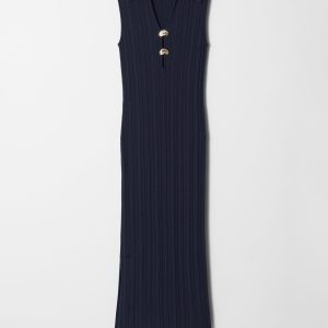 This midi dress is crafted from a stretchy rib-knit fabric that hugs the body in a slim-fitting silhouette. Cut in a sleeveless design, it features a classic collar, a deep V-neckline accented by two sculptural gold-tone buttons, and a high side slit for ease of movement. Pair with strappy sandals or kitten heels.