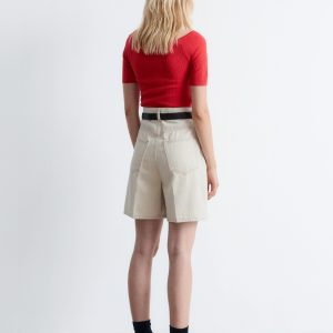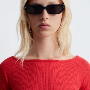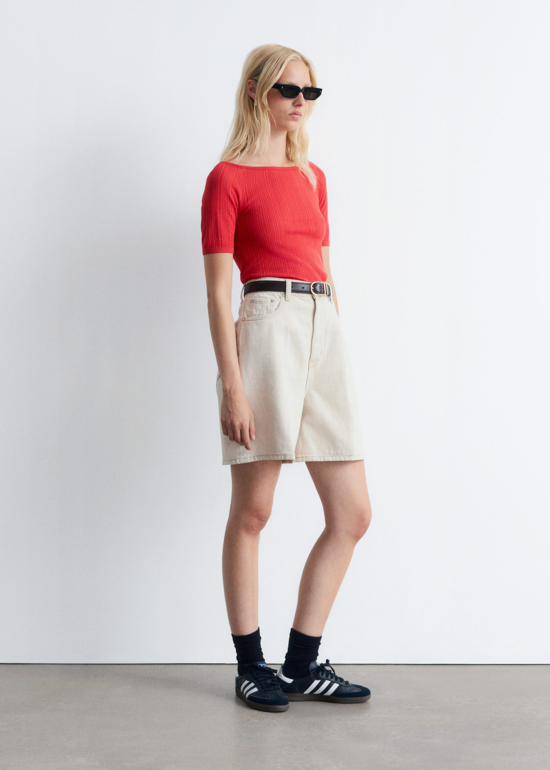This off-shoulder top is crafted from a soft cotton blend with a rib knit pointelle finish. Cut in a slim fit silhouette, it features a straight neckline and short, fitted sleeves. Style it with jeans or a mini skirt.