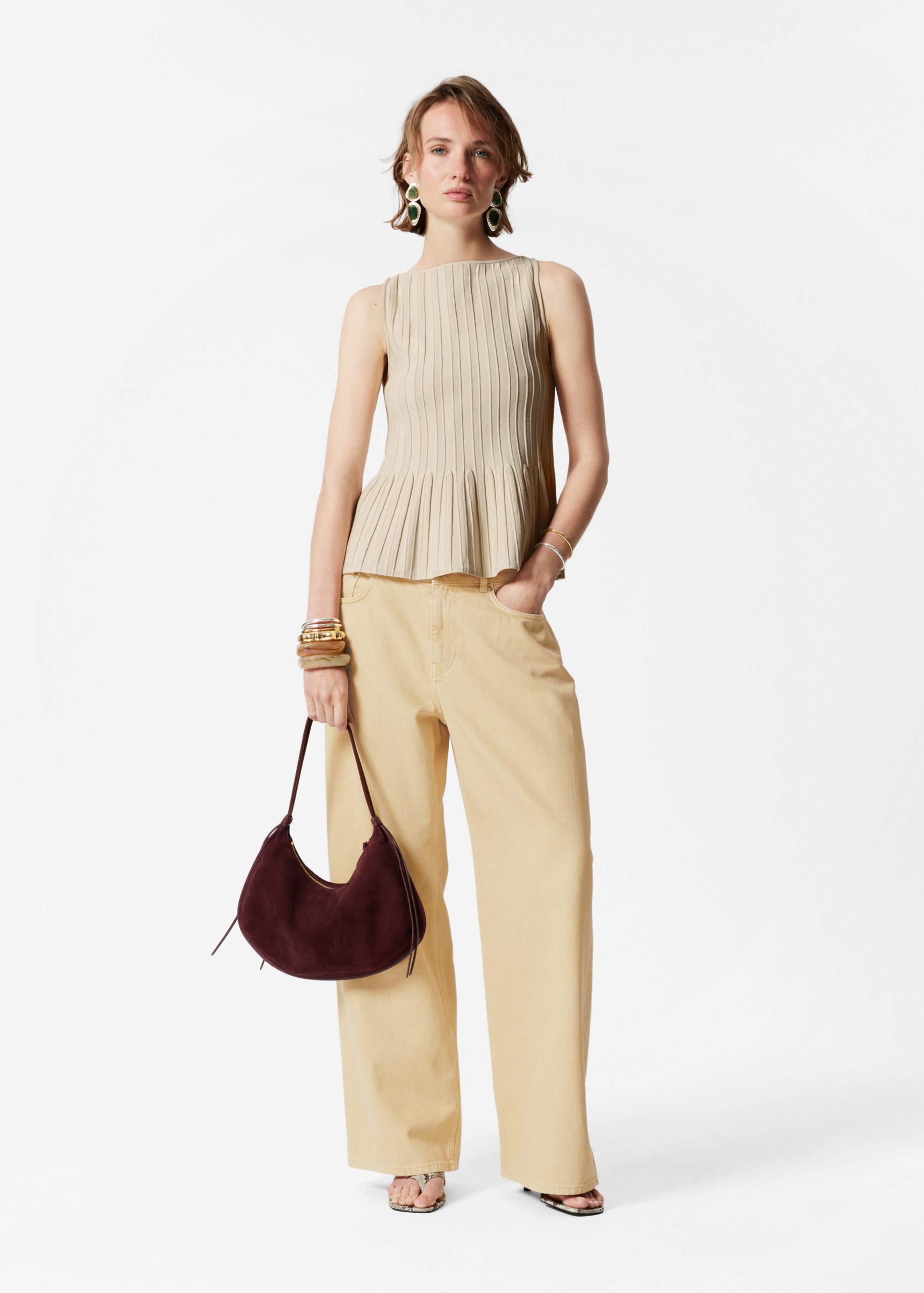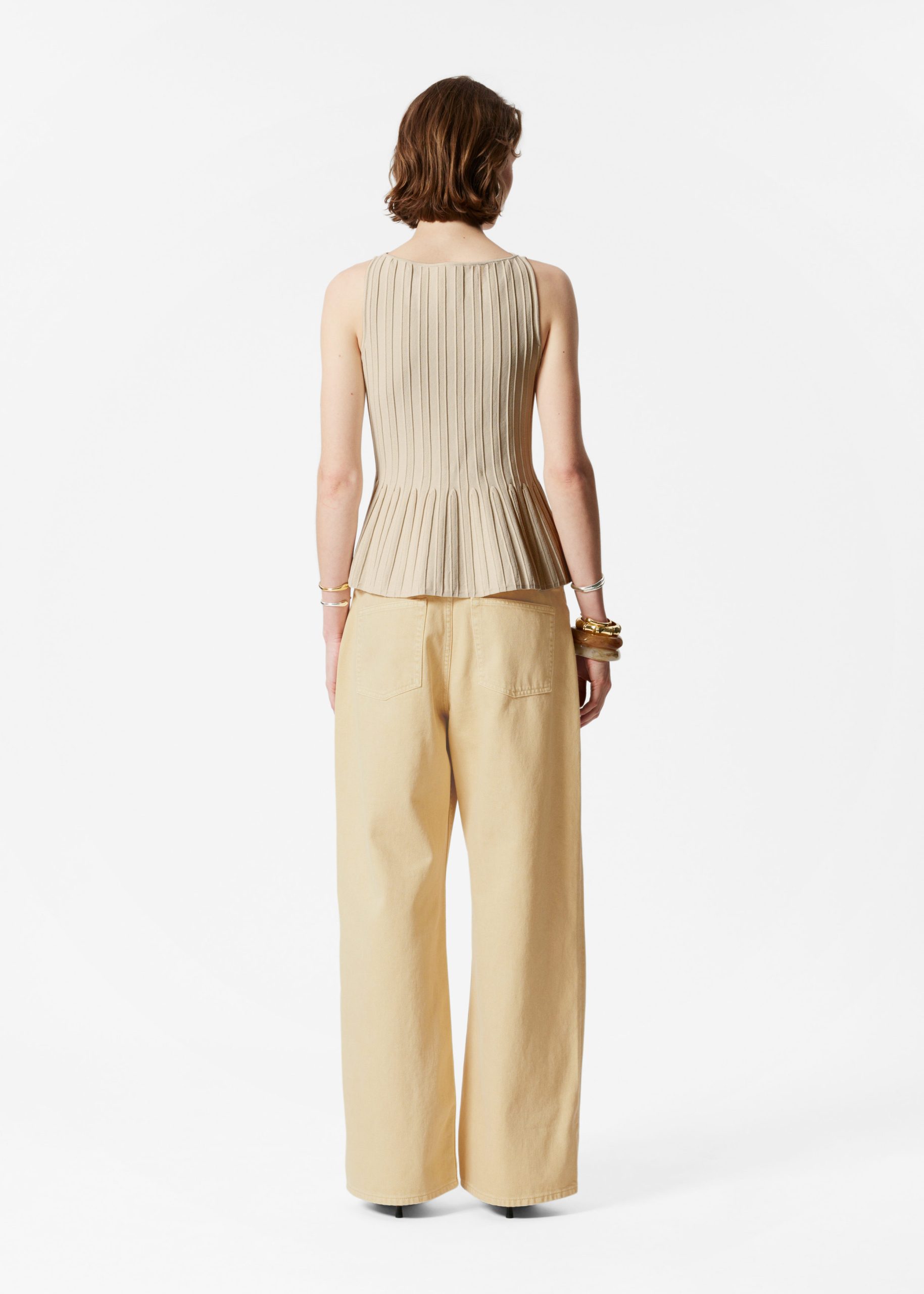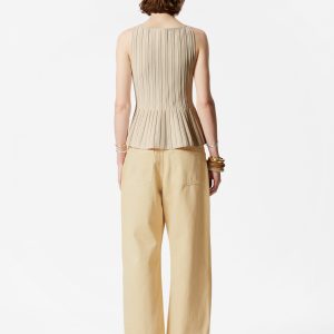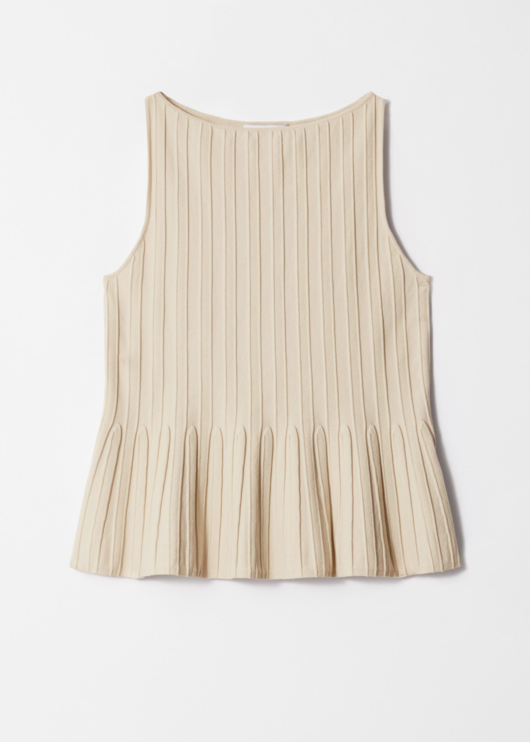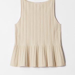 This tank top is a standout piece in your wardrobe, offering minimalism with an edge. Designed in a sculptural silhouette, it features a classic boatneck and a fitted bodice that shapes to a peplum hem, while vertical rib-knit detailing adds texture and dimension.