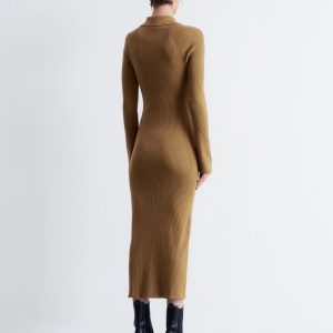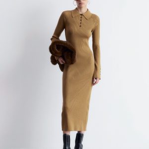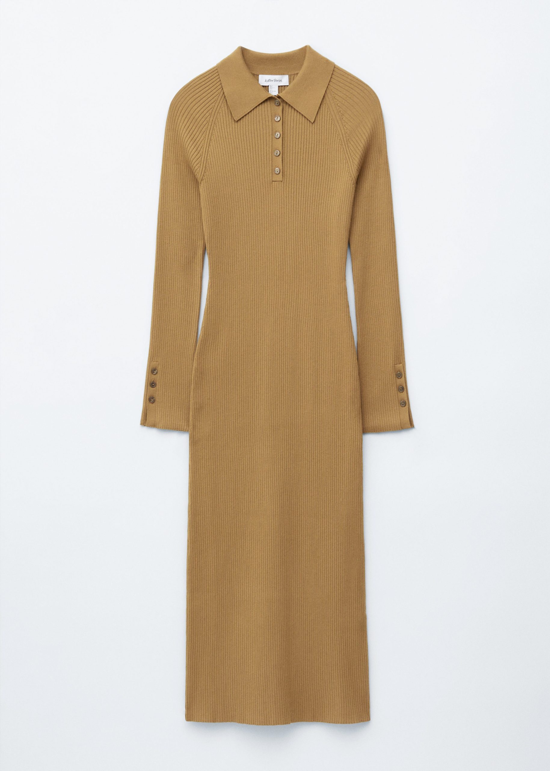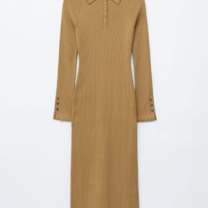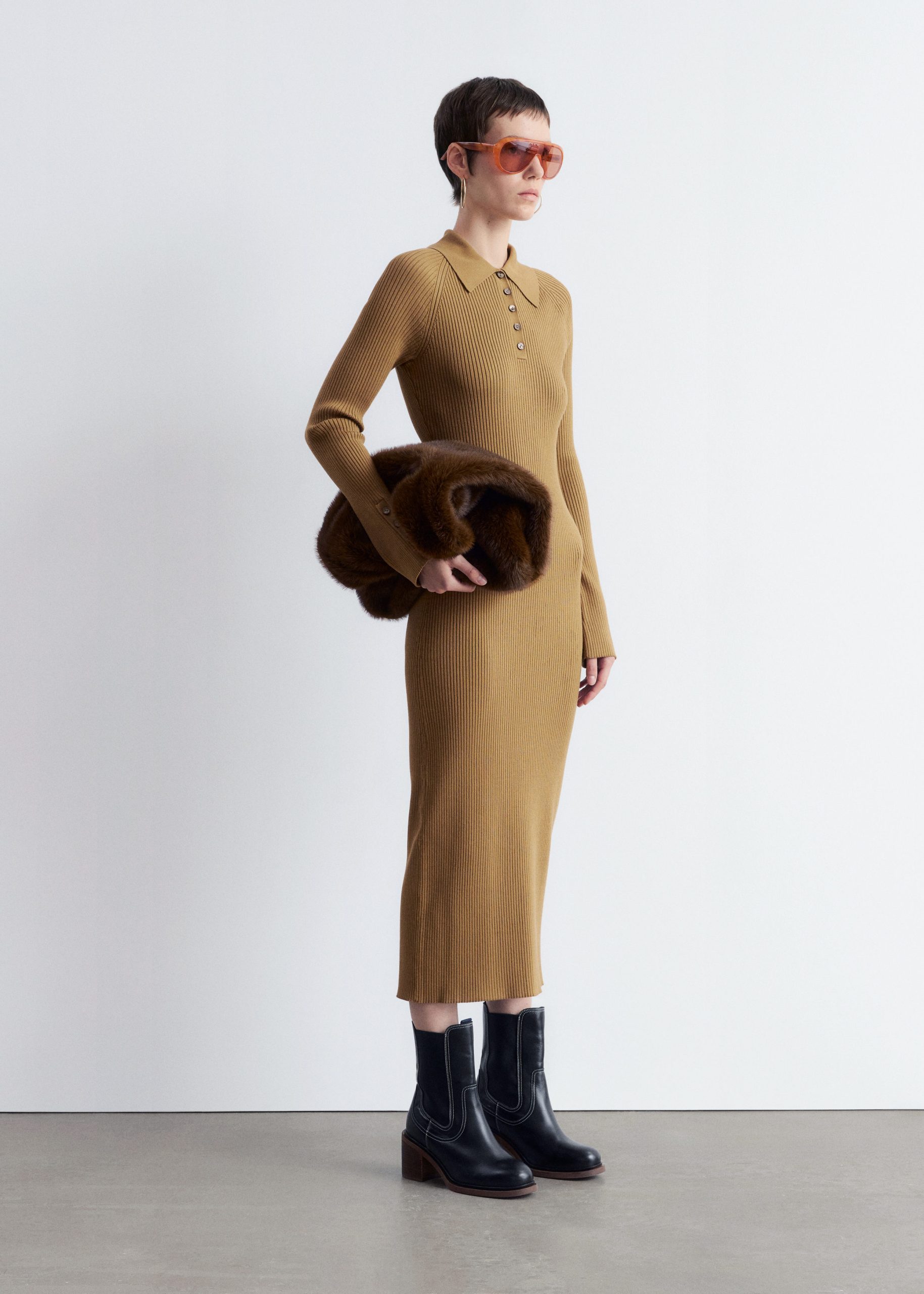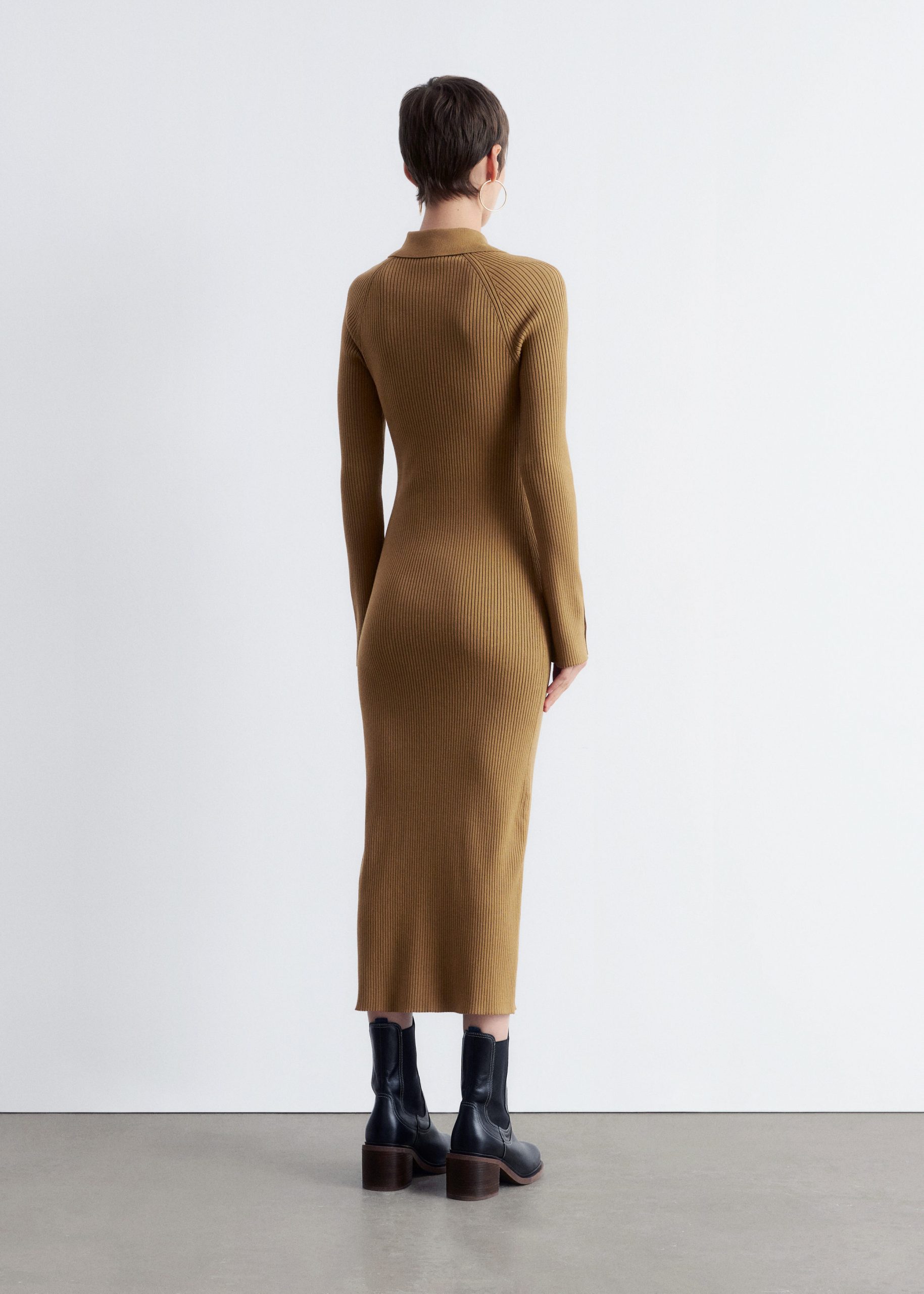 This midi dress is crafted from a lightweight and stretchy rib-knit fabric. Cut in a slim fit silhouette, it features a classic collar with a buttoned half-placket, and long fluted sleeves traced with buttons.