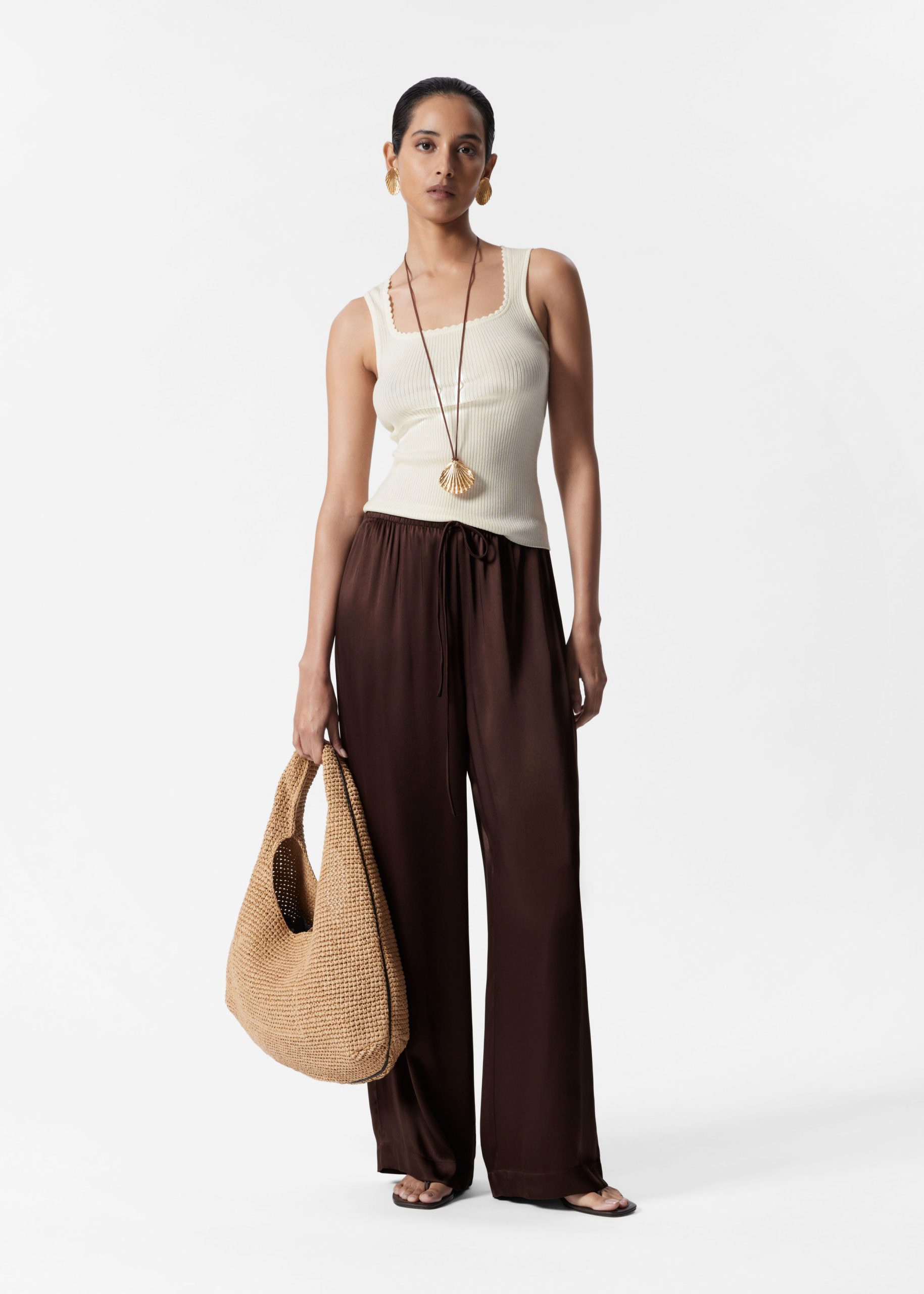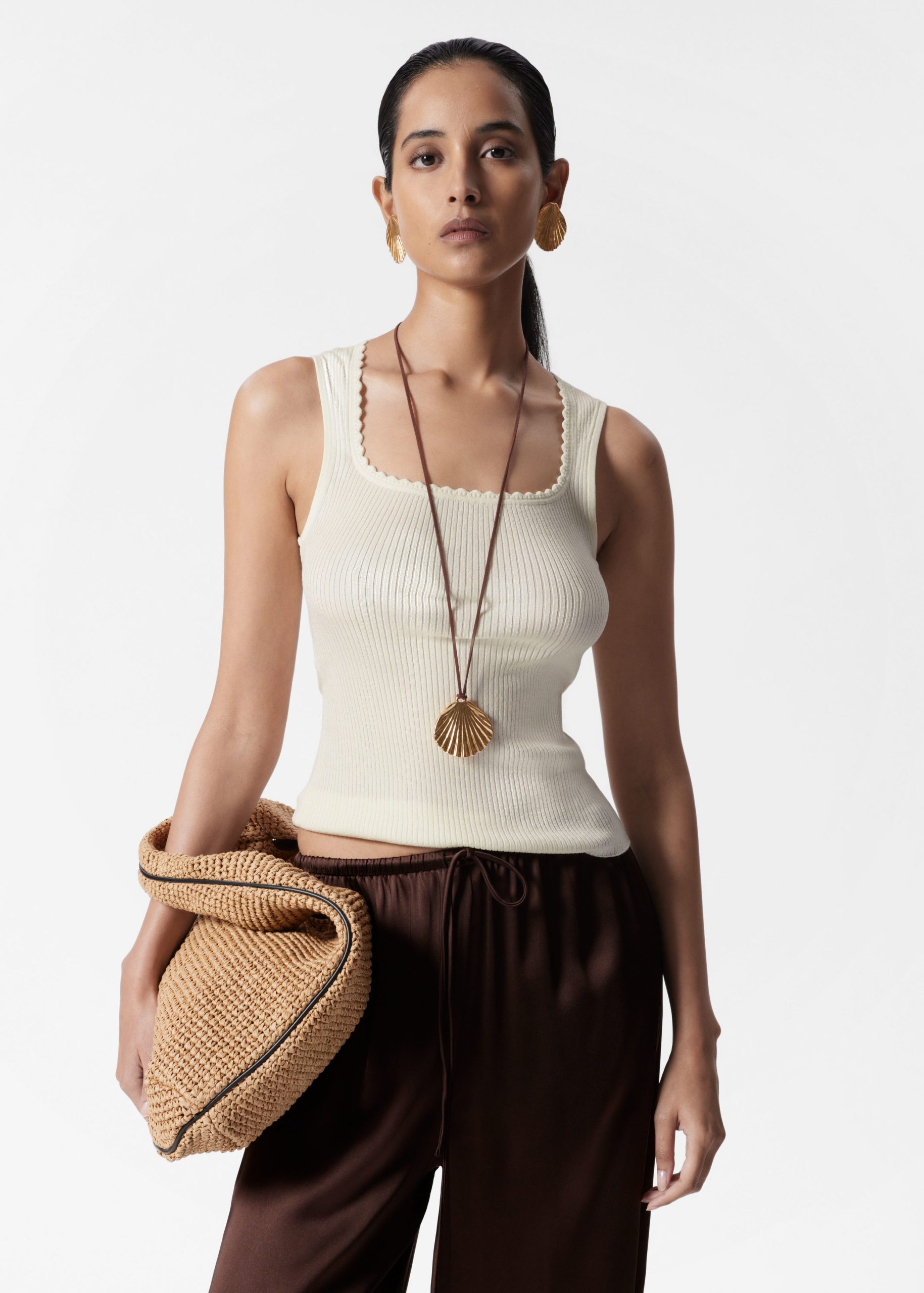 Tank top crafted from a rib-knit finish. Designed with a fitted silhouette and a square neckline accented by scalloped edges.