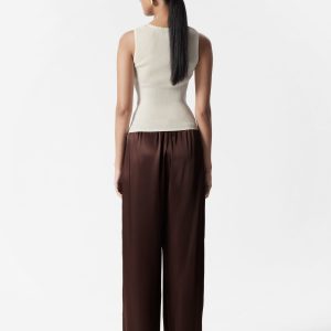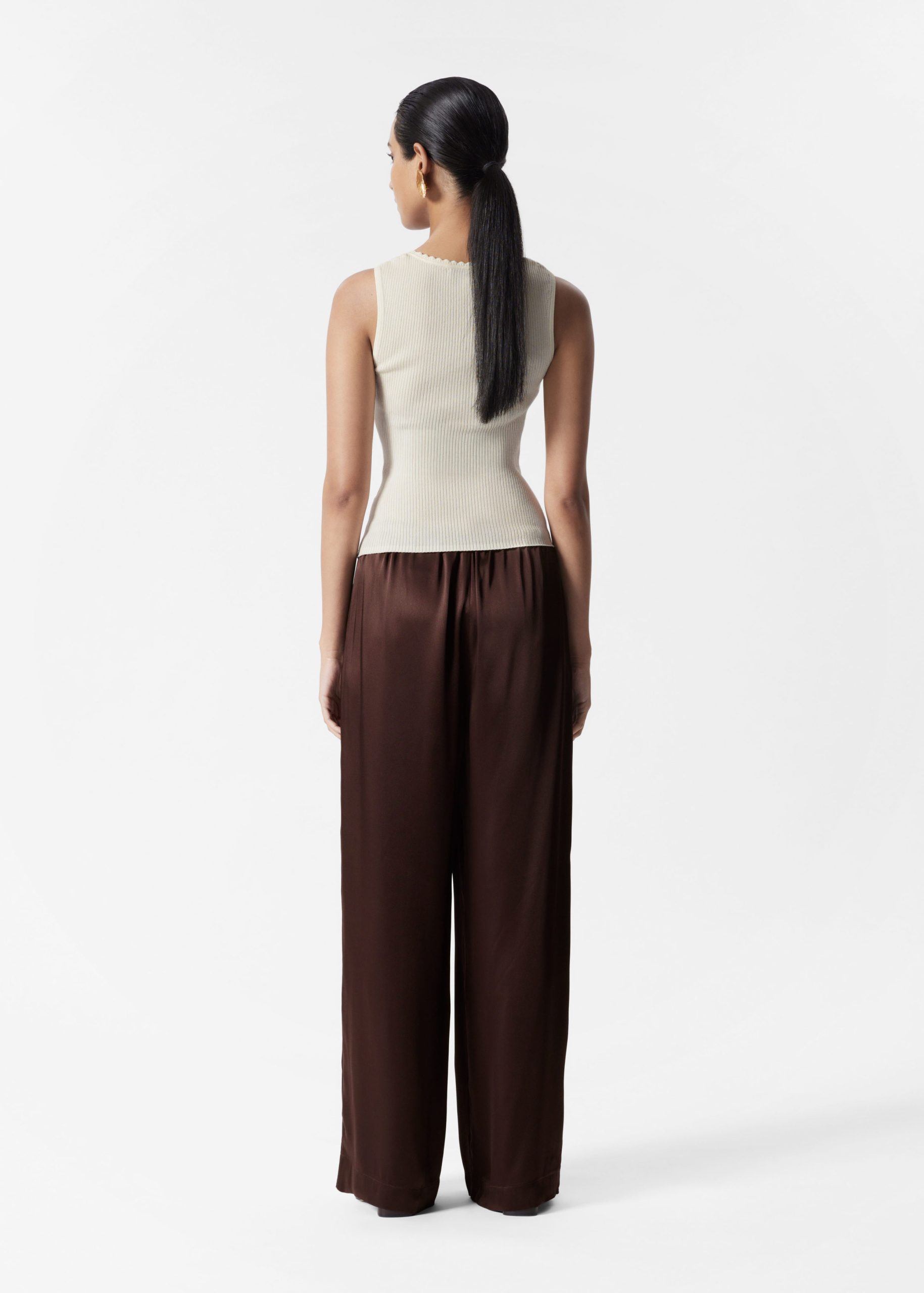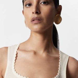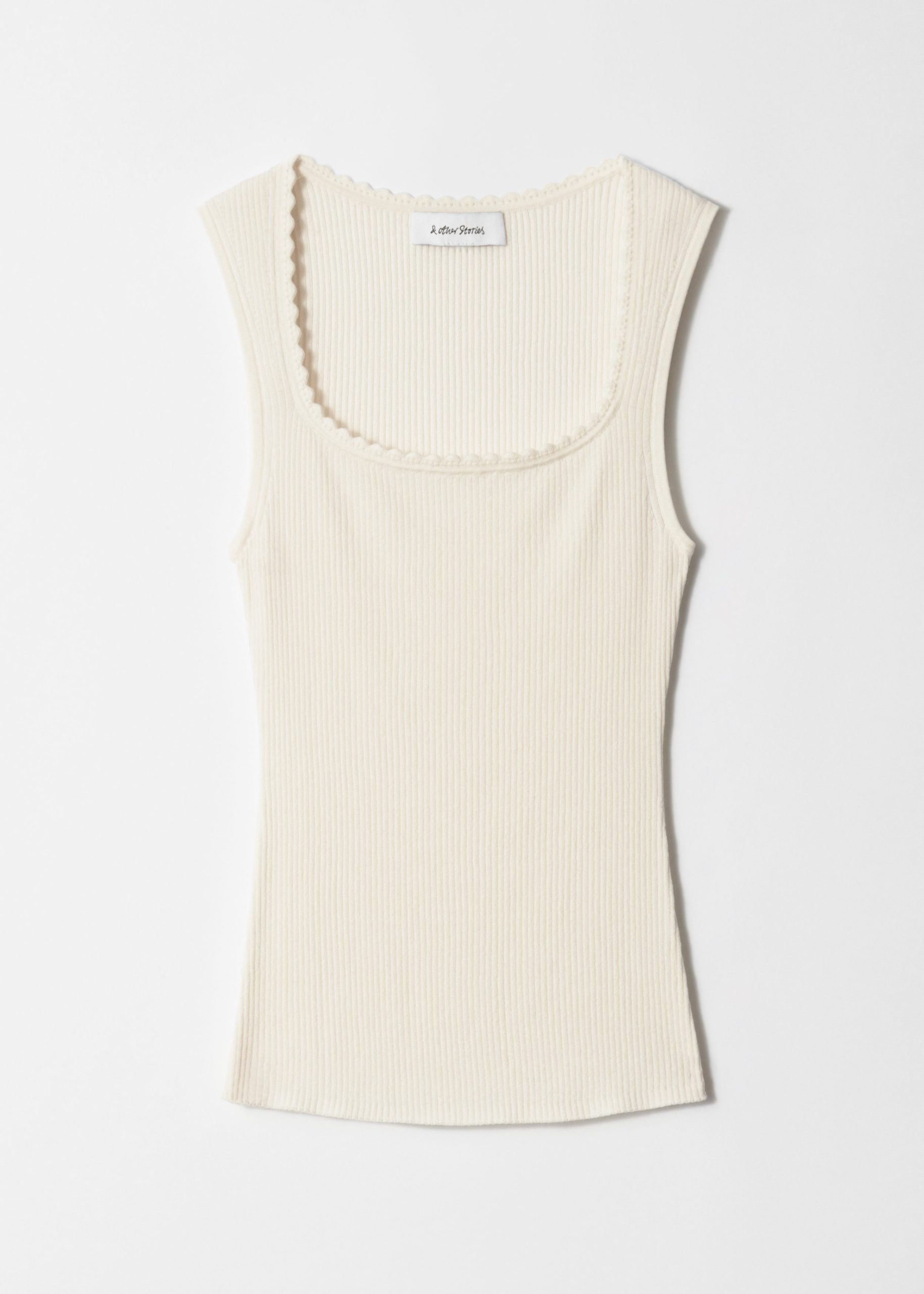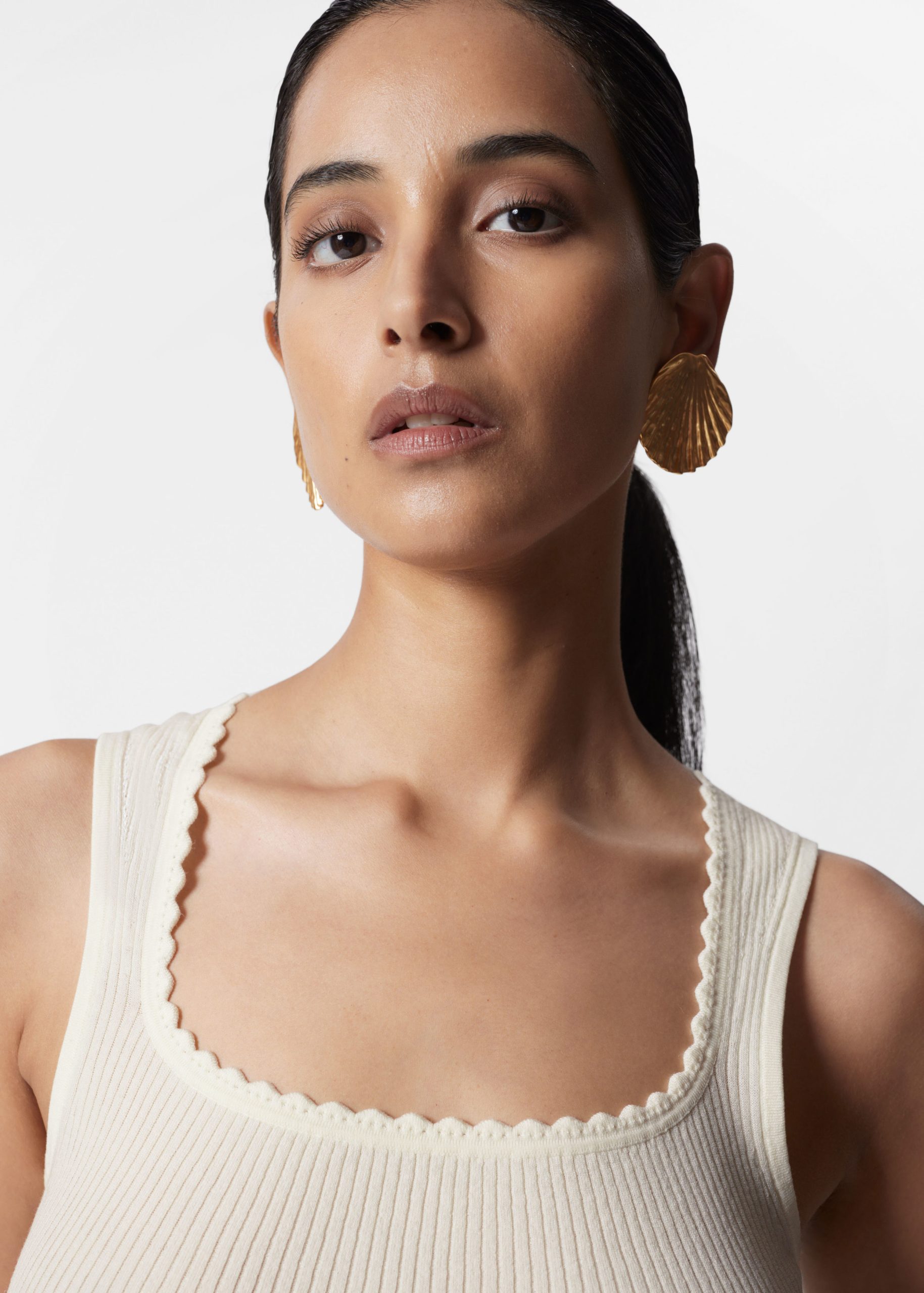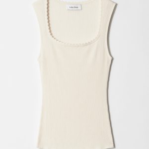 Tank top crafted from a rib-knit finish. Designed with a fitted silhouette and a square neckline accented by scalloped edges.