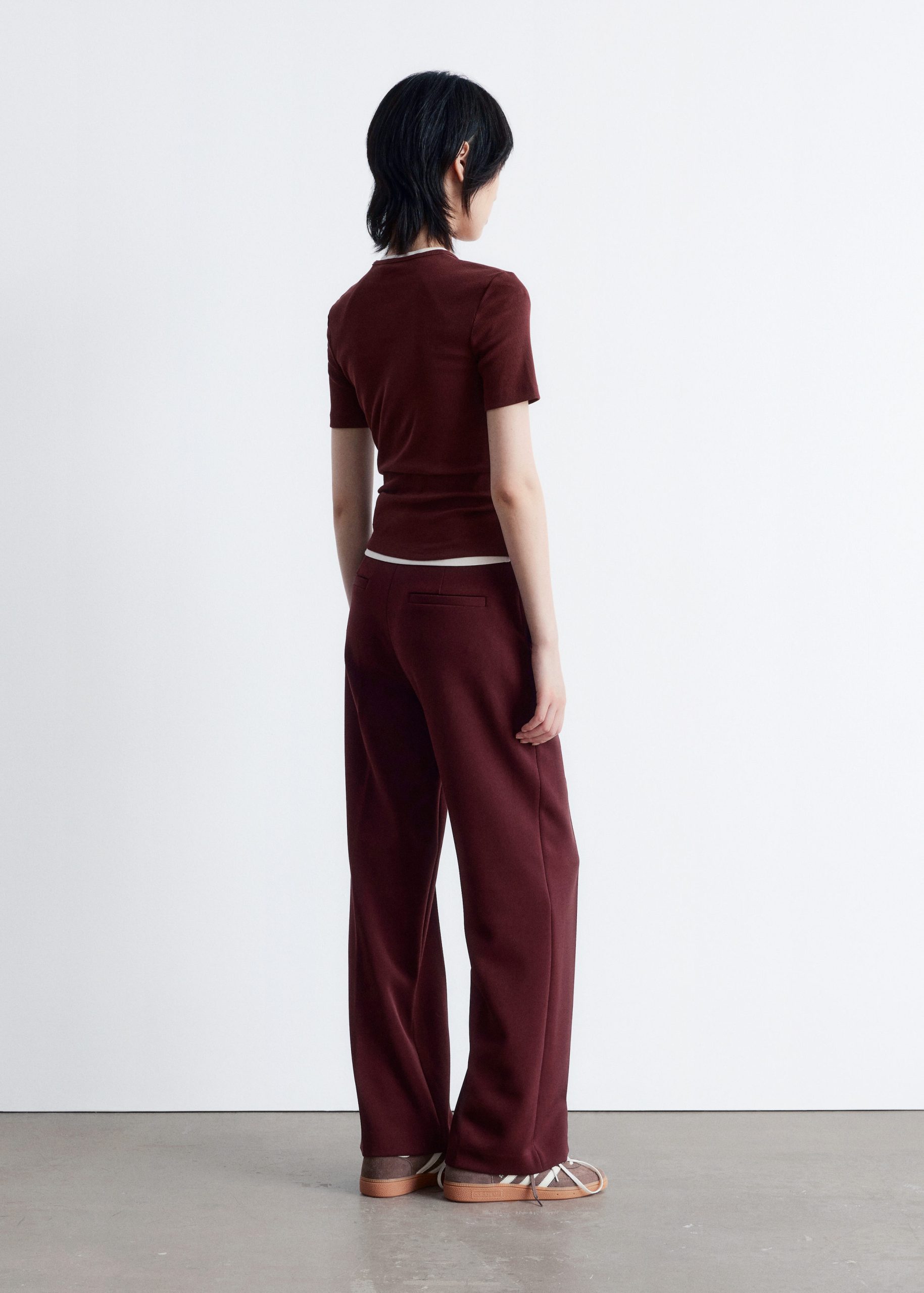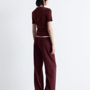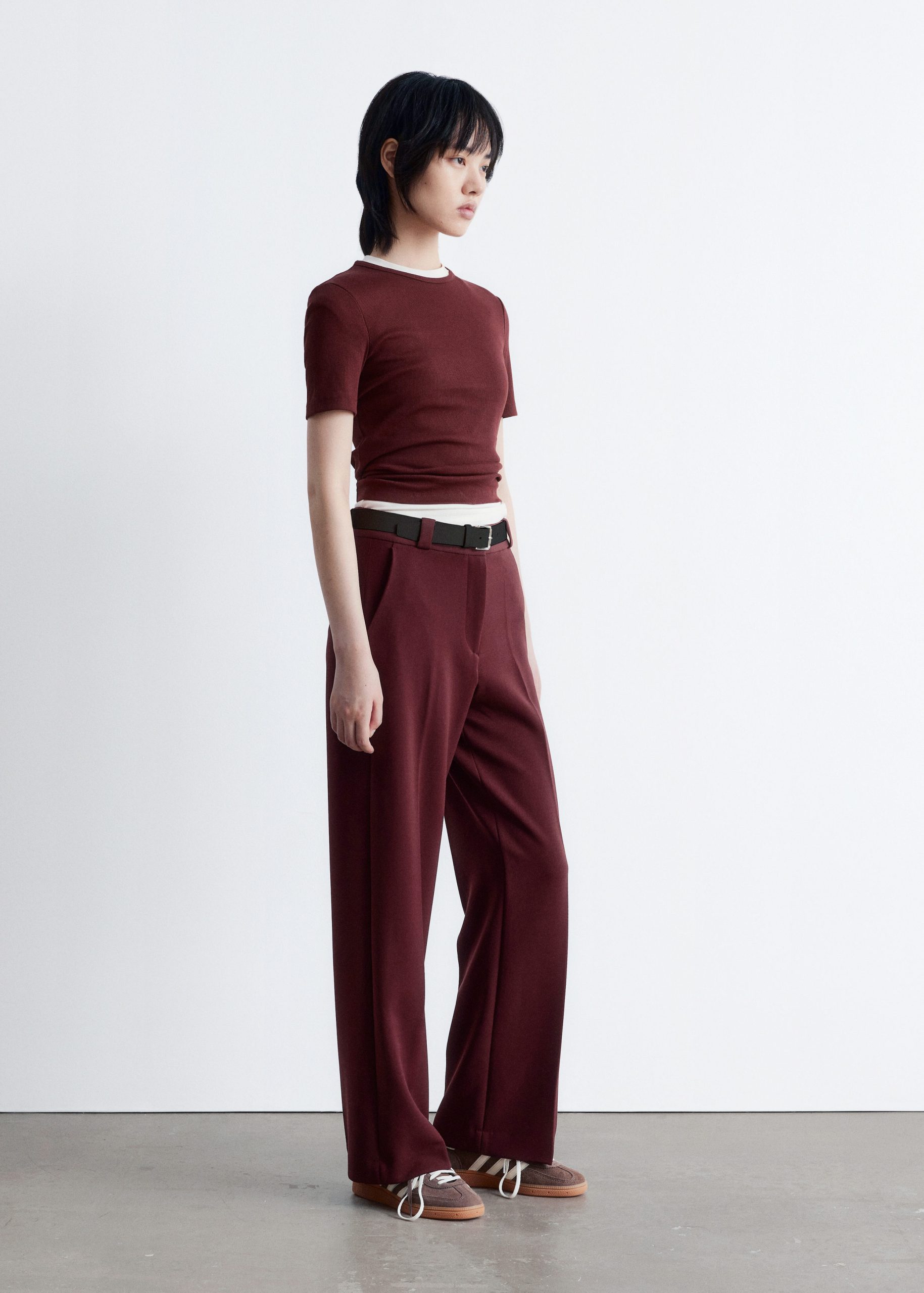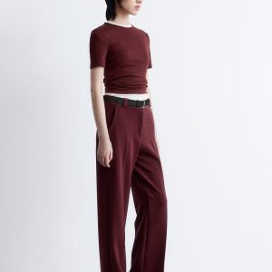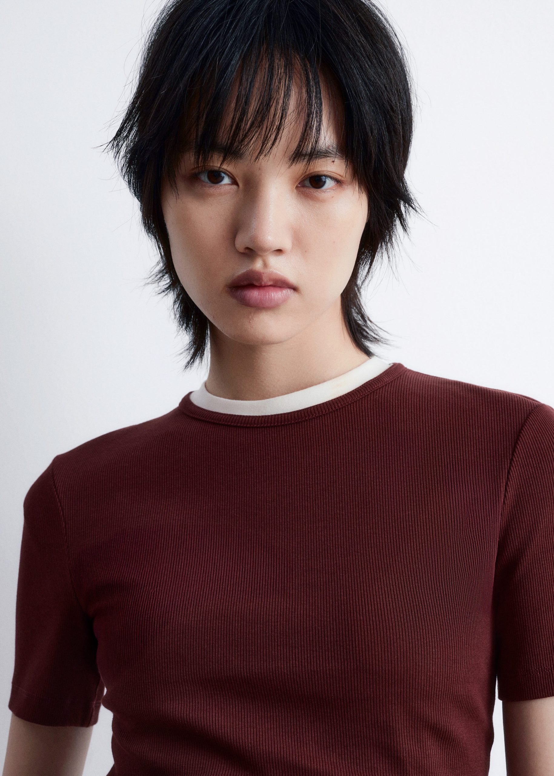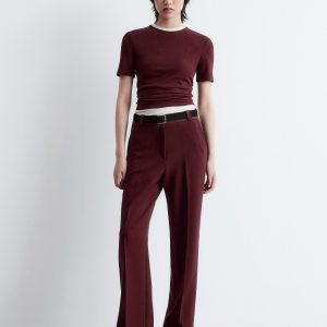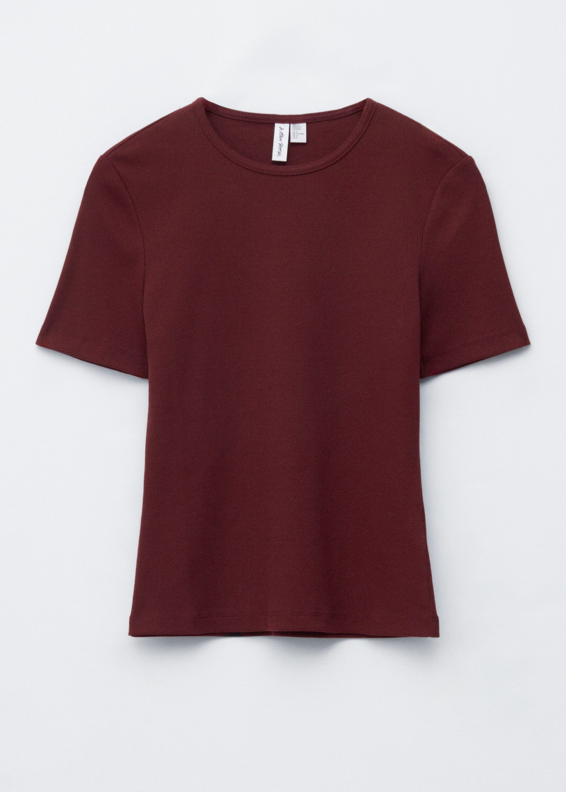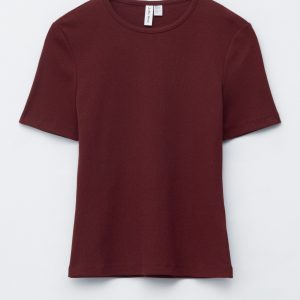 This T-shirt is crafted from a soft, stretchy cotton-blend in a ribbed finish. Cut in a slim fit silhouette, it features a round neck and short sleeves. Pair with jeans or a mini skirt.