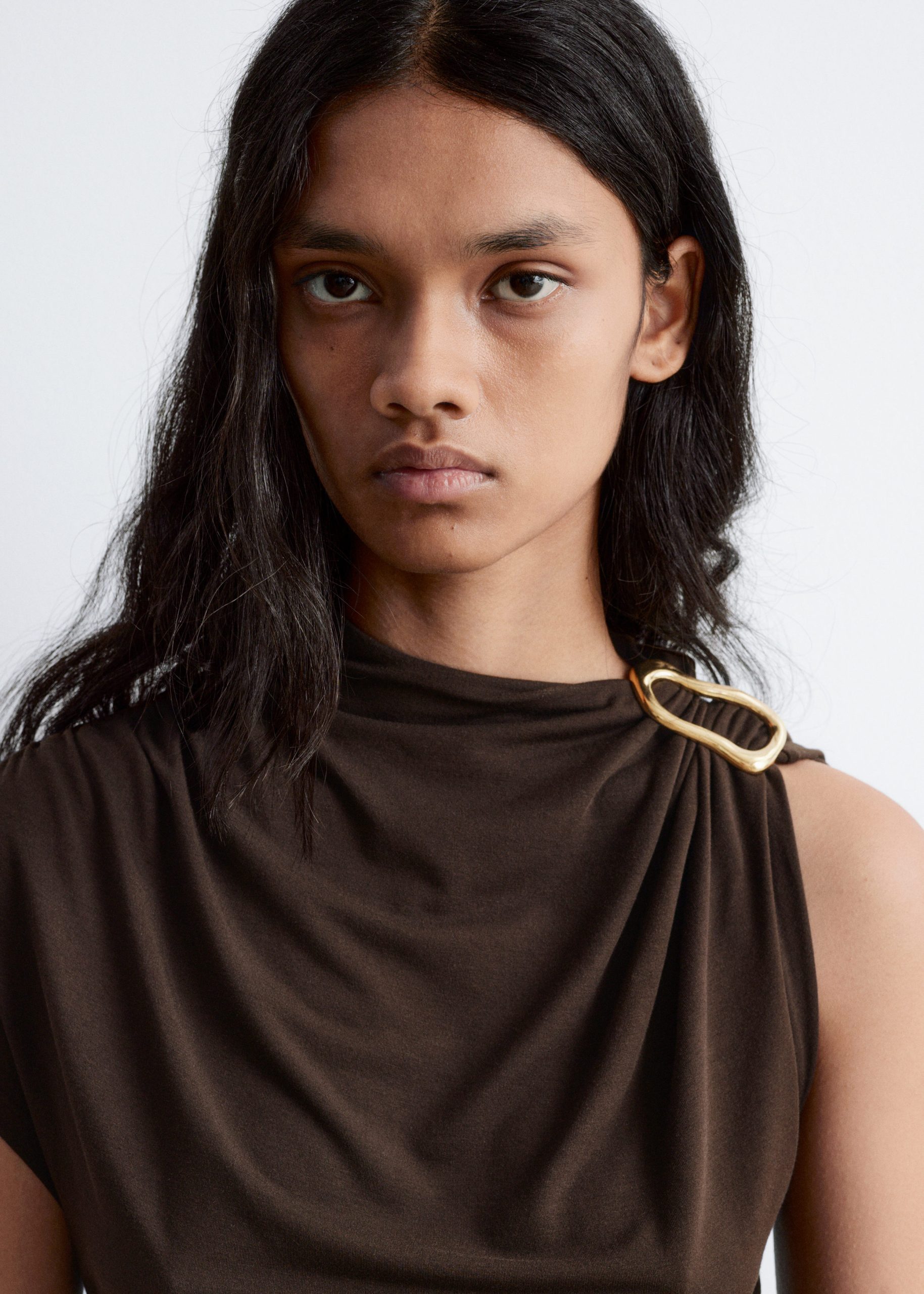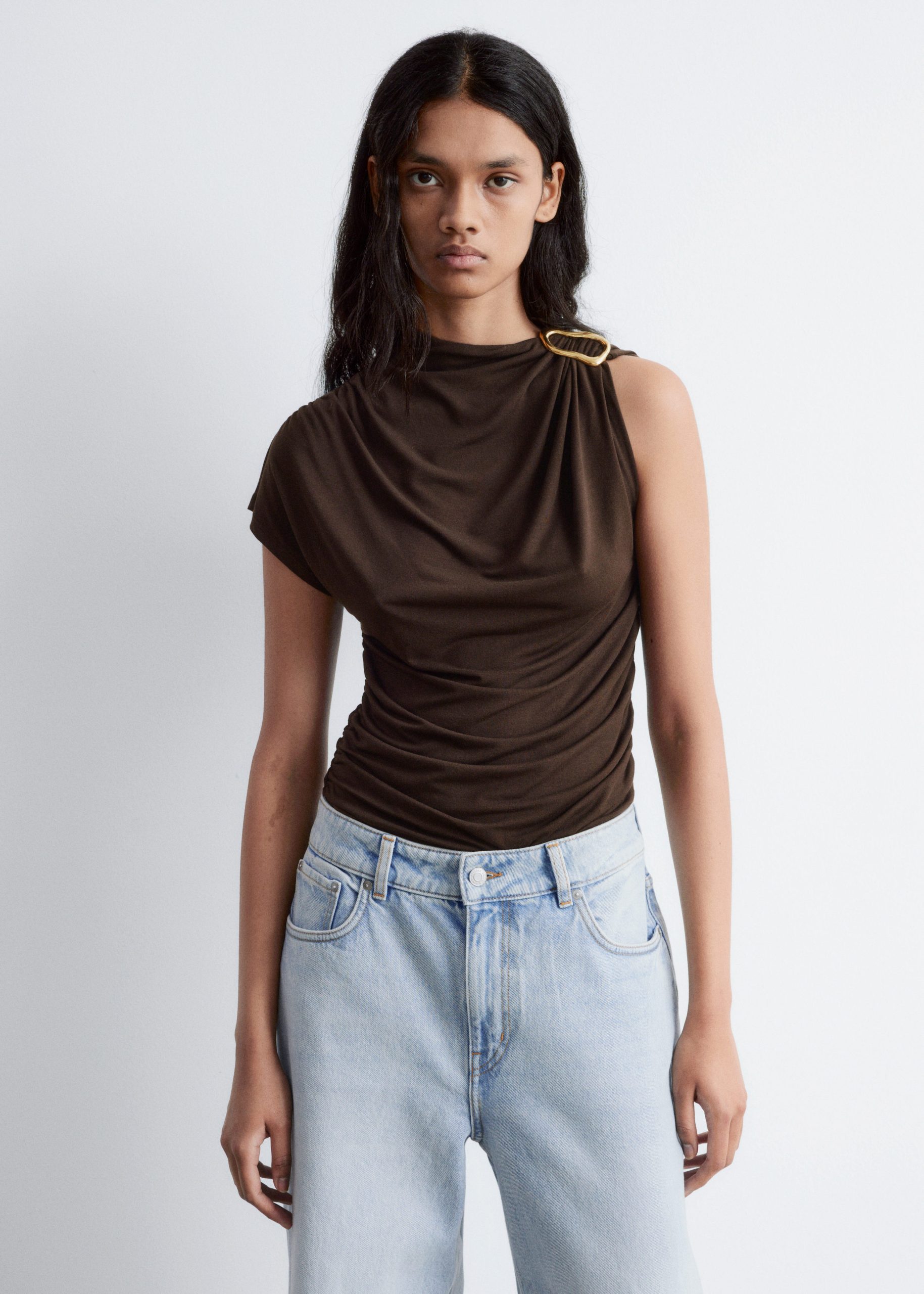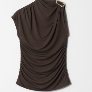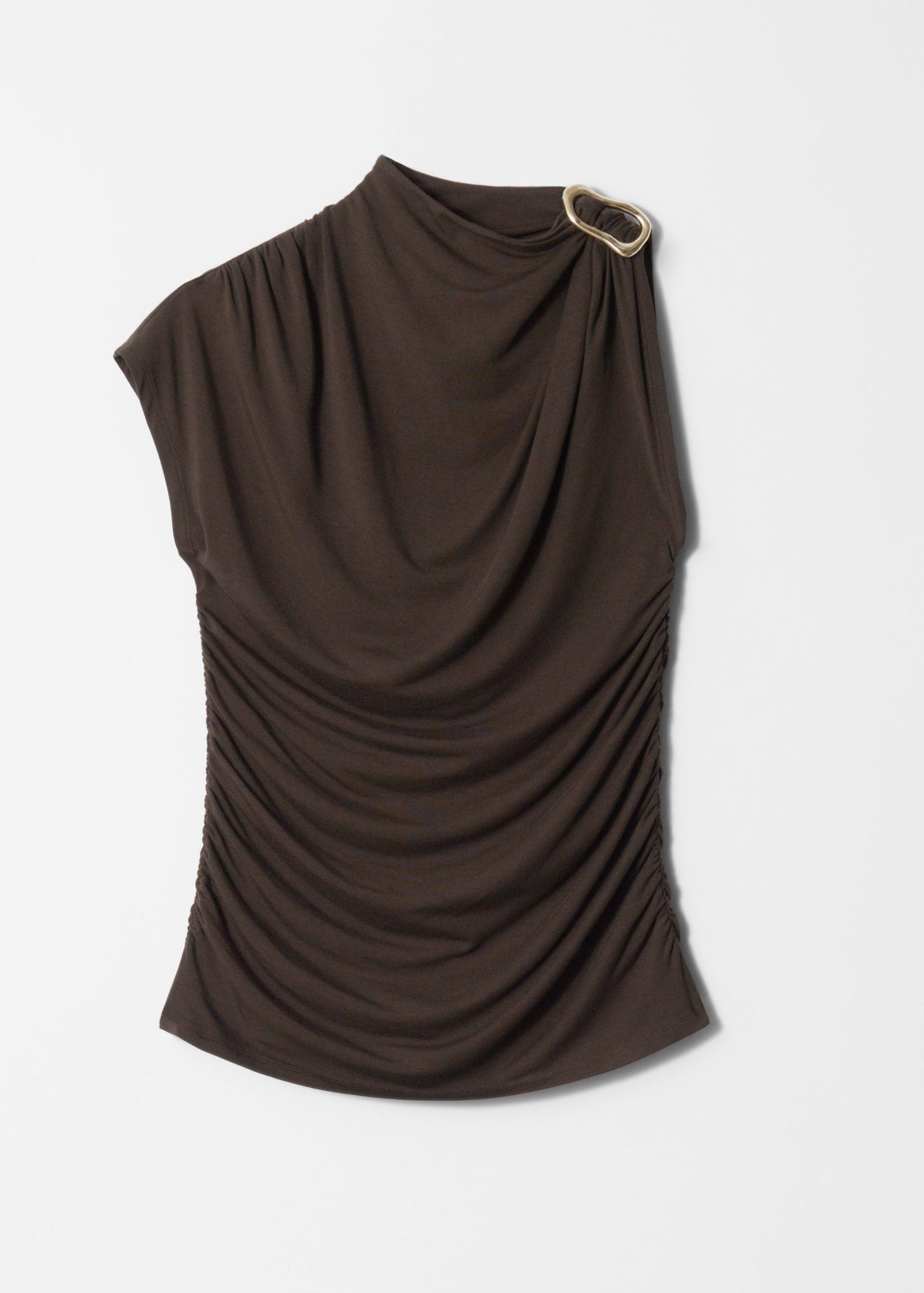 This top features an asymmetric one-shoulder design, with a cap sleeve on one side and a sculptural gold-plated buckle on the other. Crafted from light, fluid fabric, it’s detailed with all-over ruching and draping, giving it an elevated feel. Style it with jeans and strappy heels.