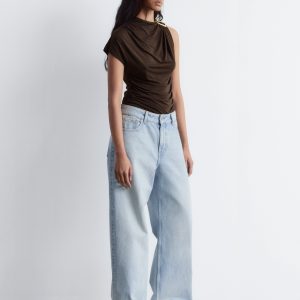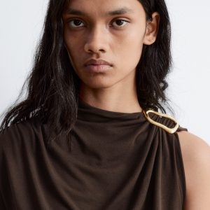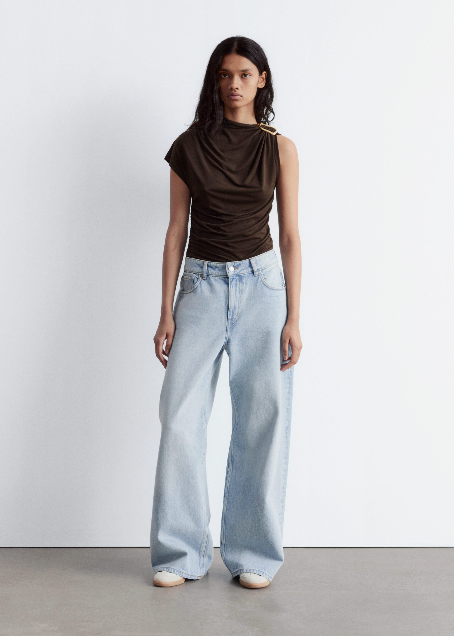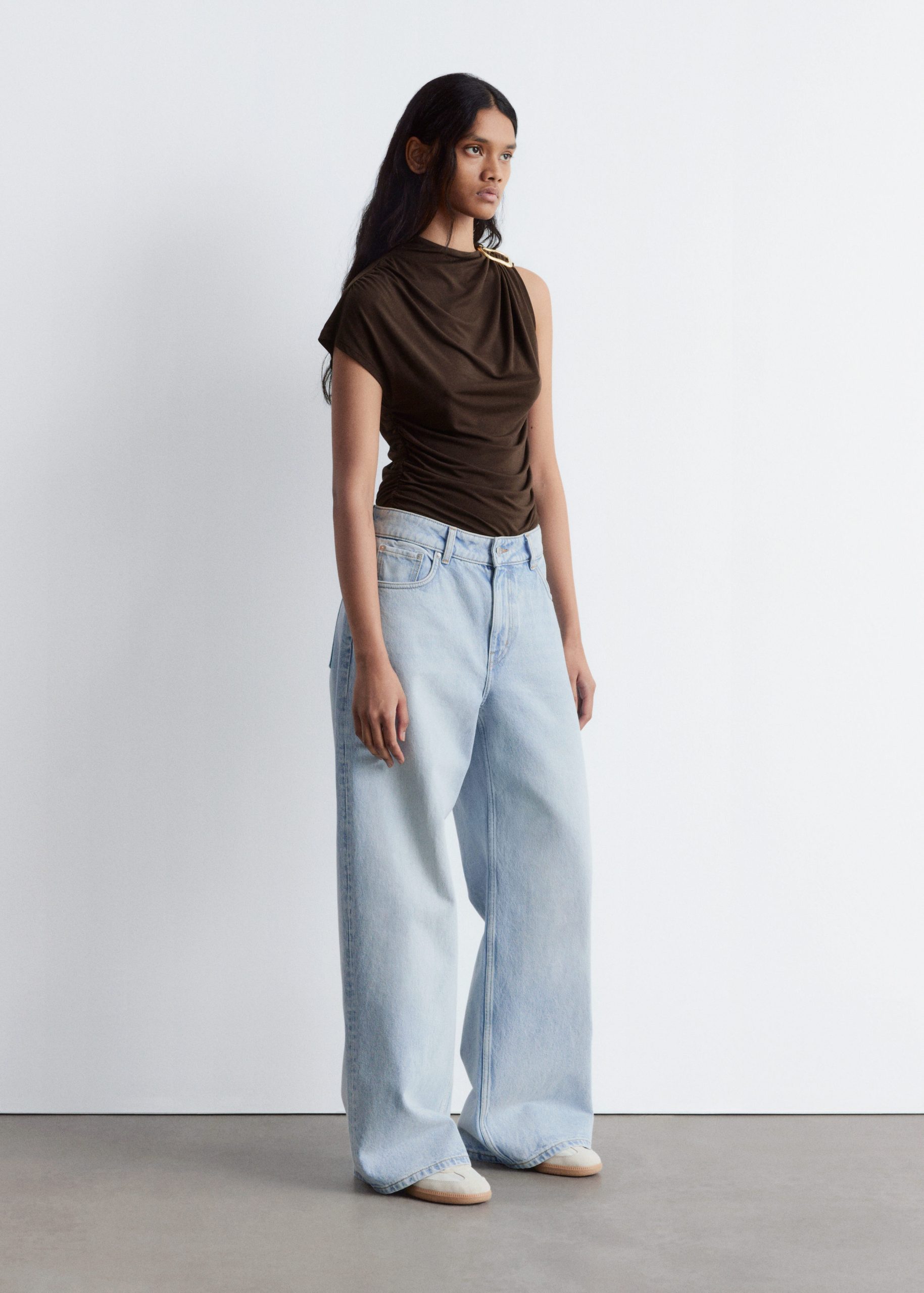 This top features an asymmetric one-shoulder design, with a cap sleeve on one side and a sculptural gold-plated buckle on the other. Crafted from light, fluid fabric, it’s detailed with all-over ruching and draping, giving it an elevated feel. Style it with jeans and strappy heels.