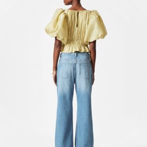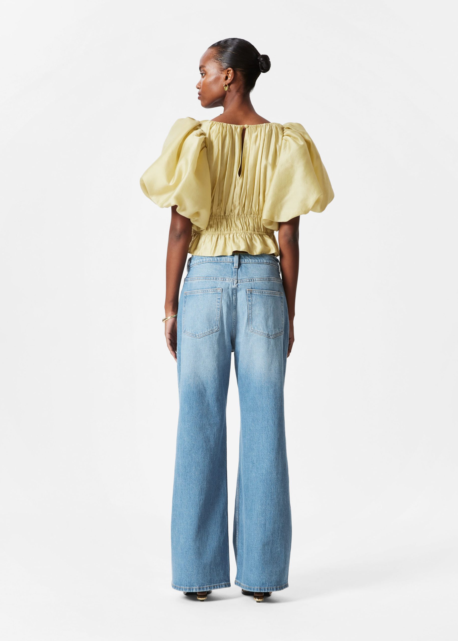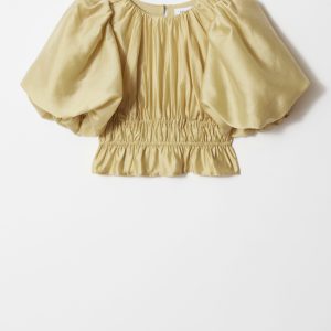 Blouse designed with decorative ruched pleating that falls into a peplum frill hemline. Featuring voluminous balloon-sleeves, and a keyhole closure at the back.