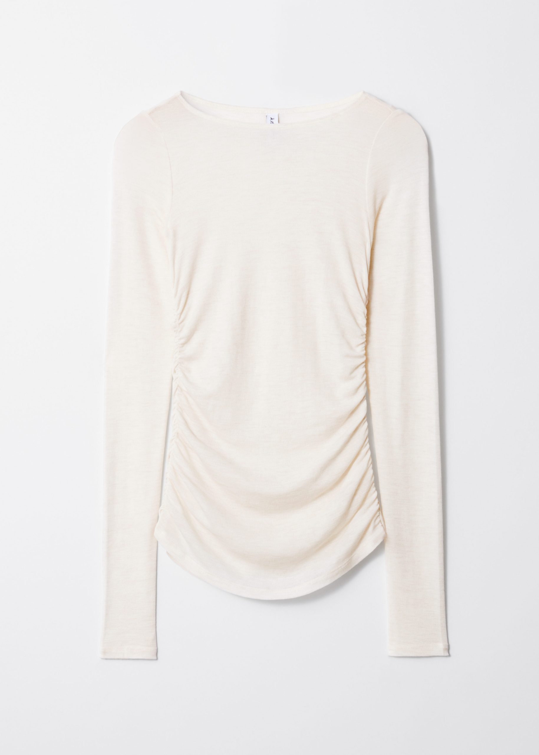 Long-sleeve top designed with a boat neckline and decorative ruching along the sides.