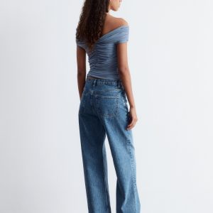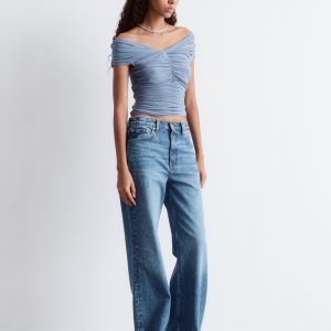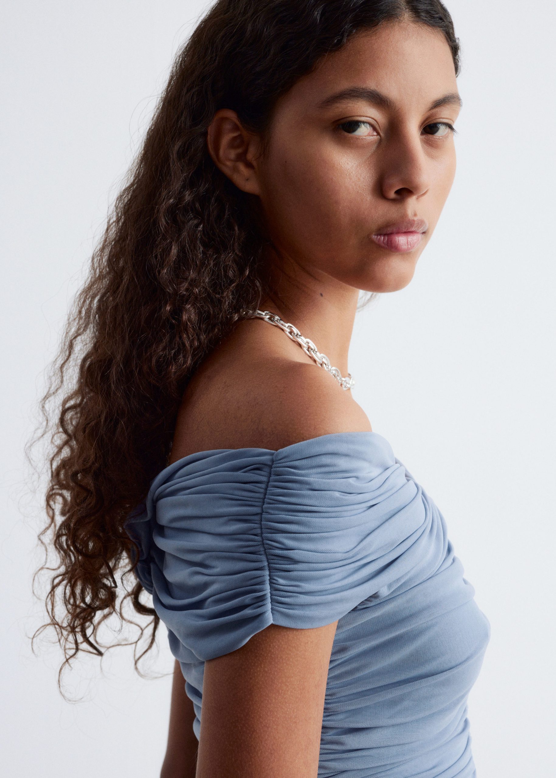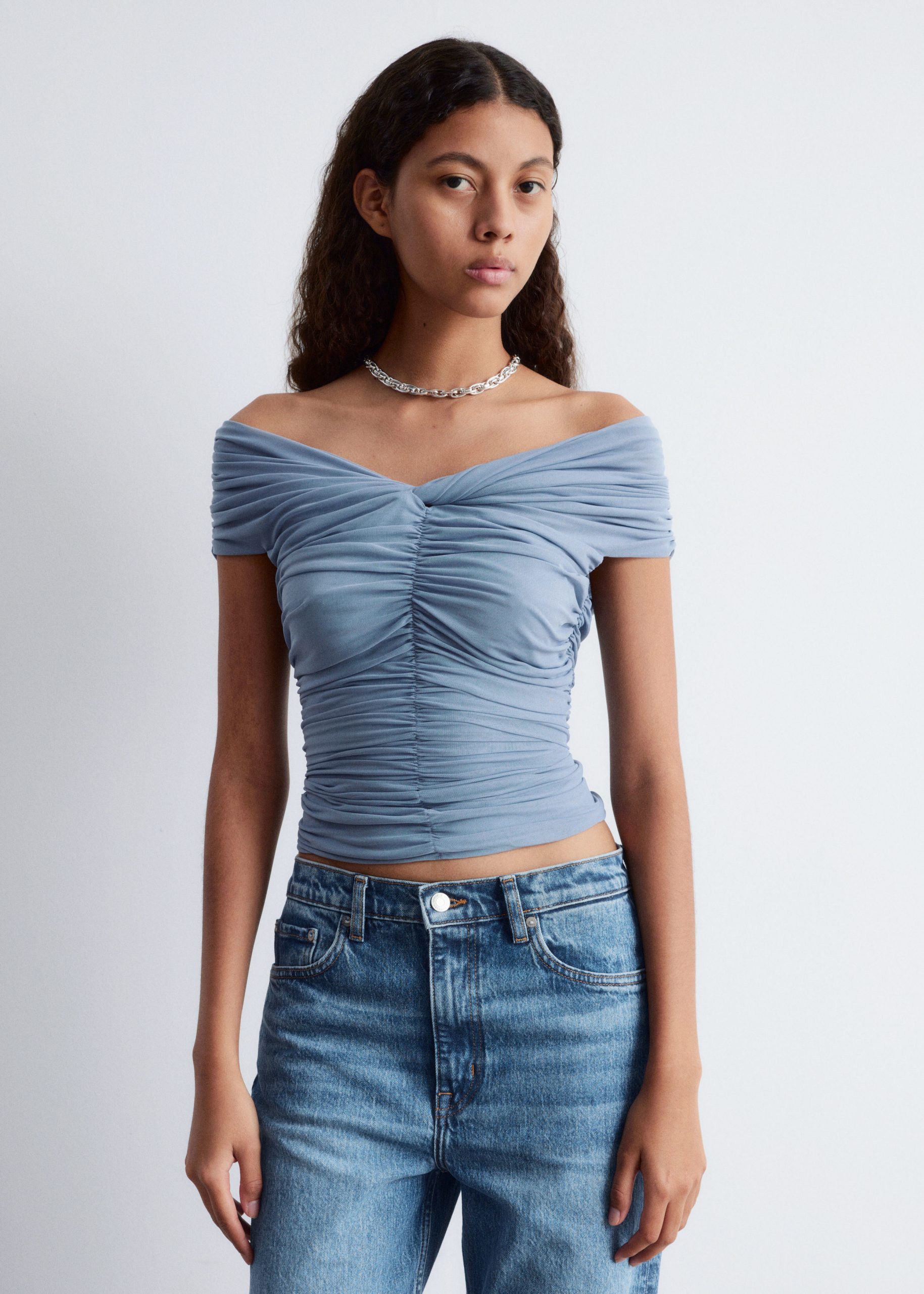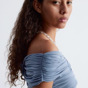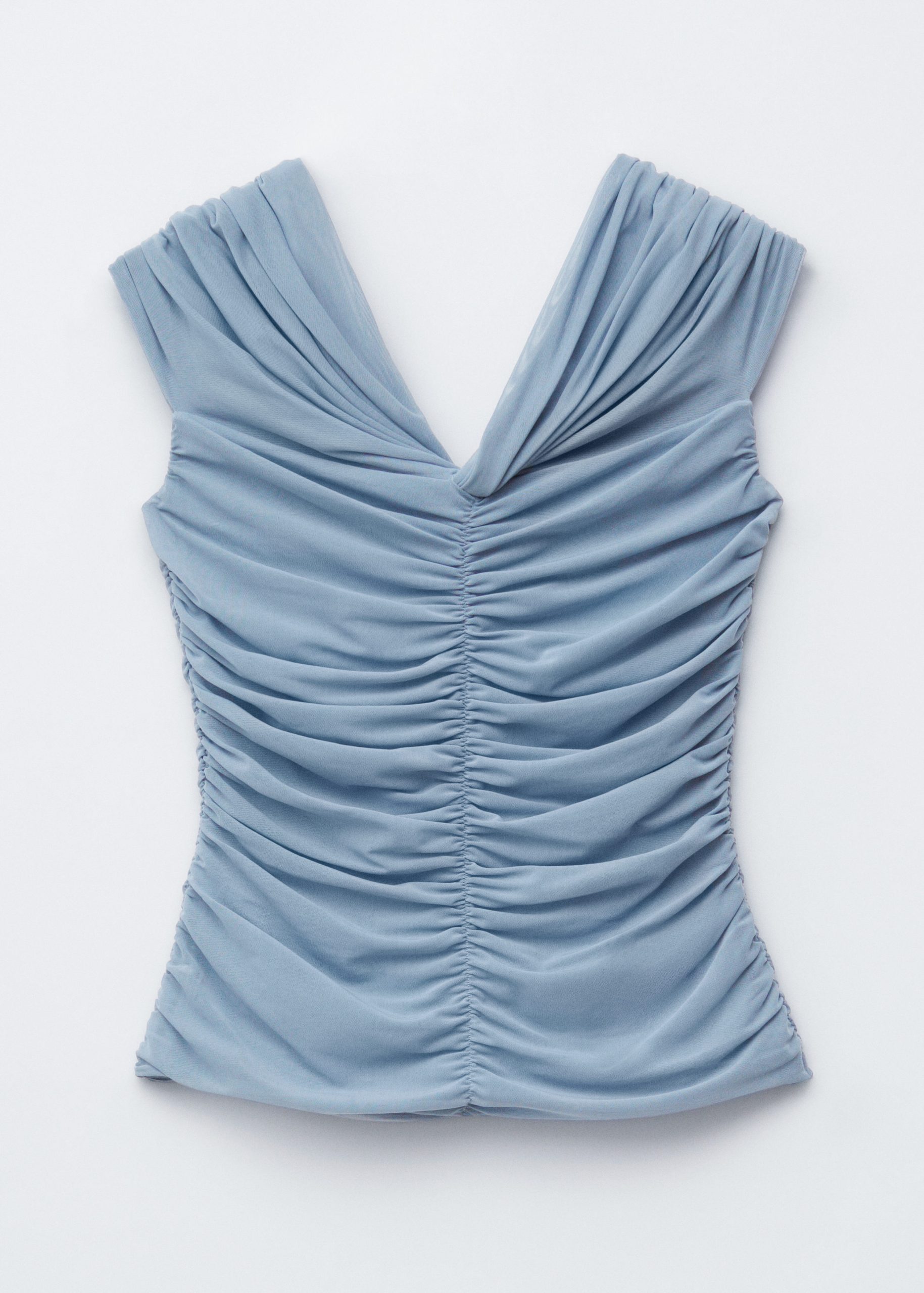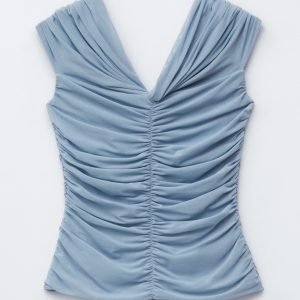 This top is crafted from a soft, stretchy mesh fabric with an all-over ruched effect. Designed in a sleeveless, slim-fit silhouette with a v-neckline and shoulders that can be pulled down for an optional off-shoulder look.