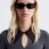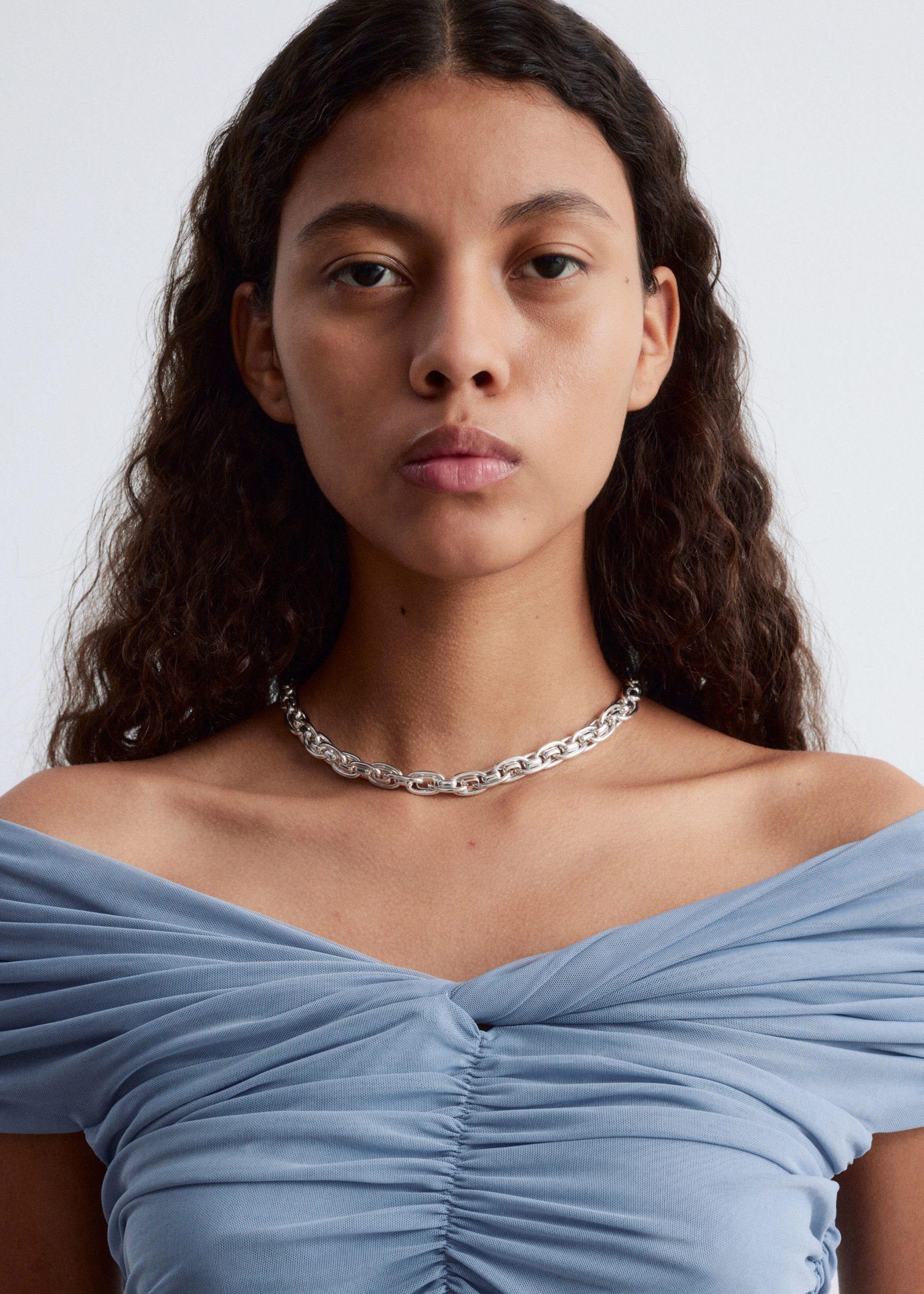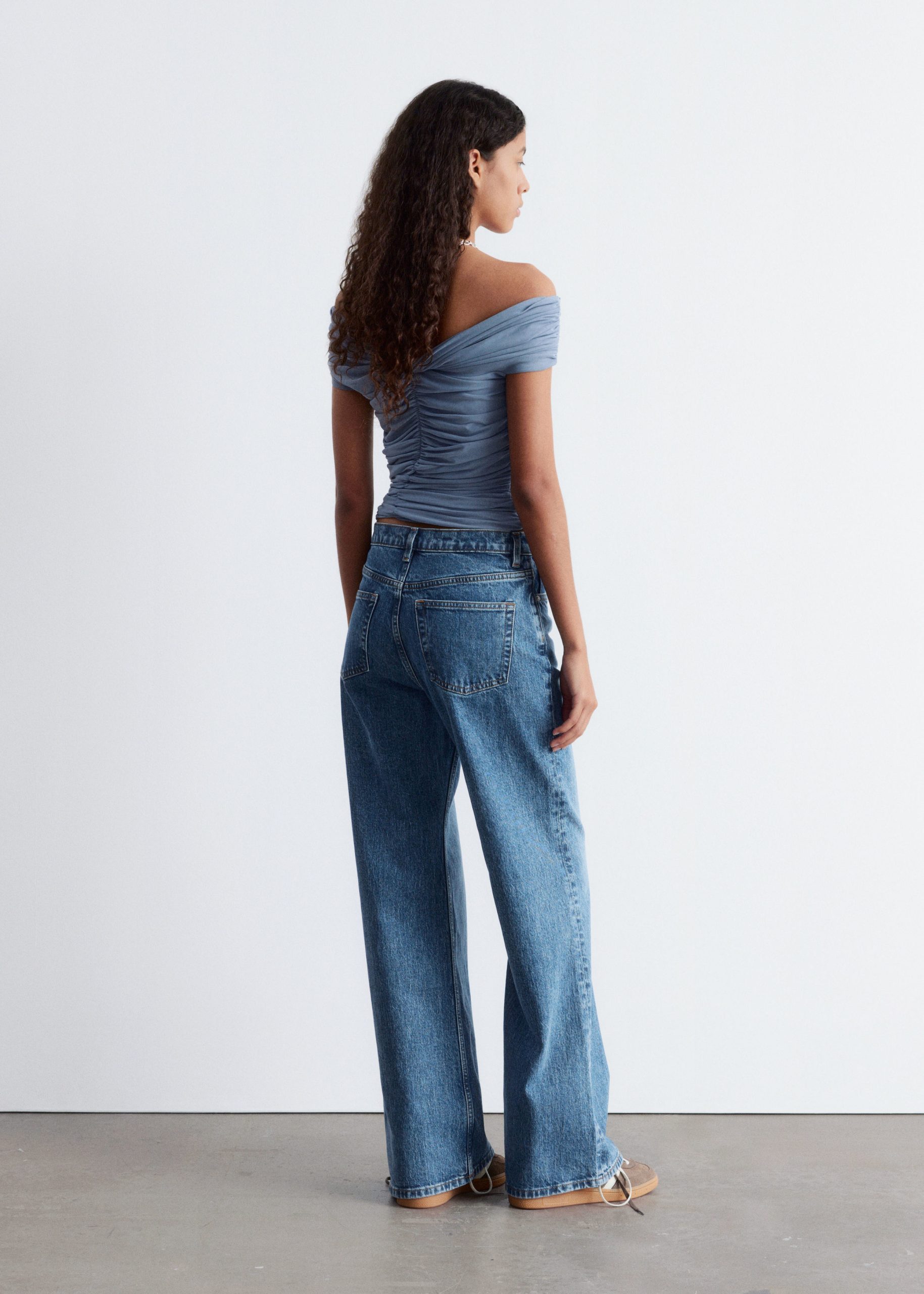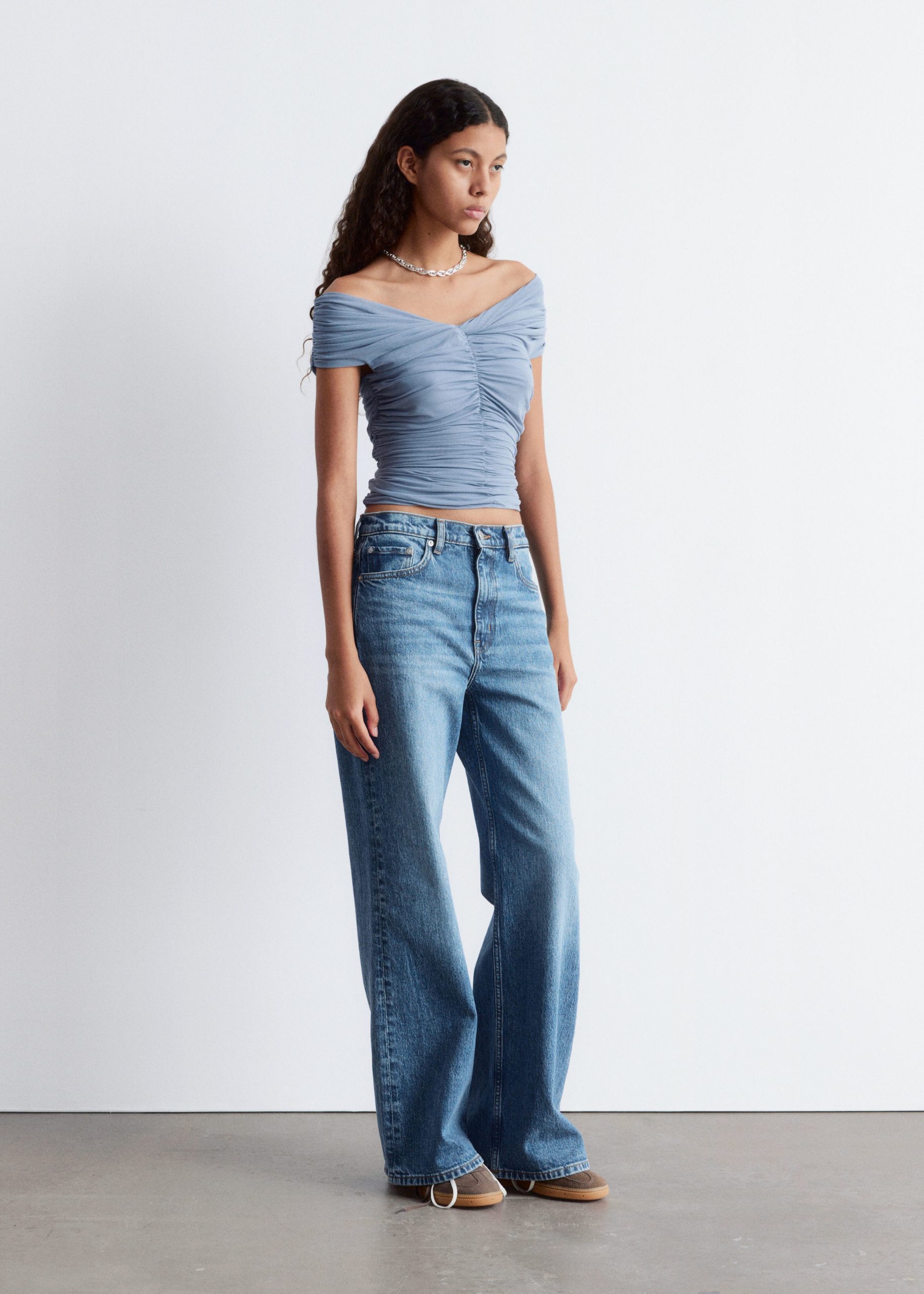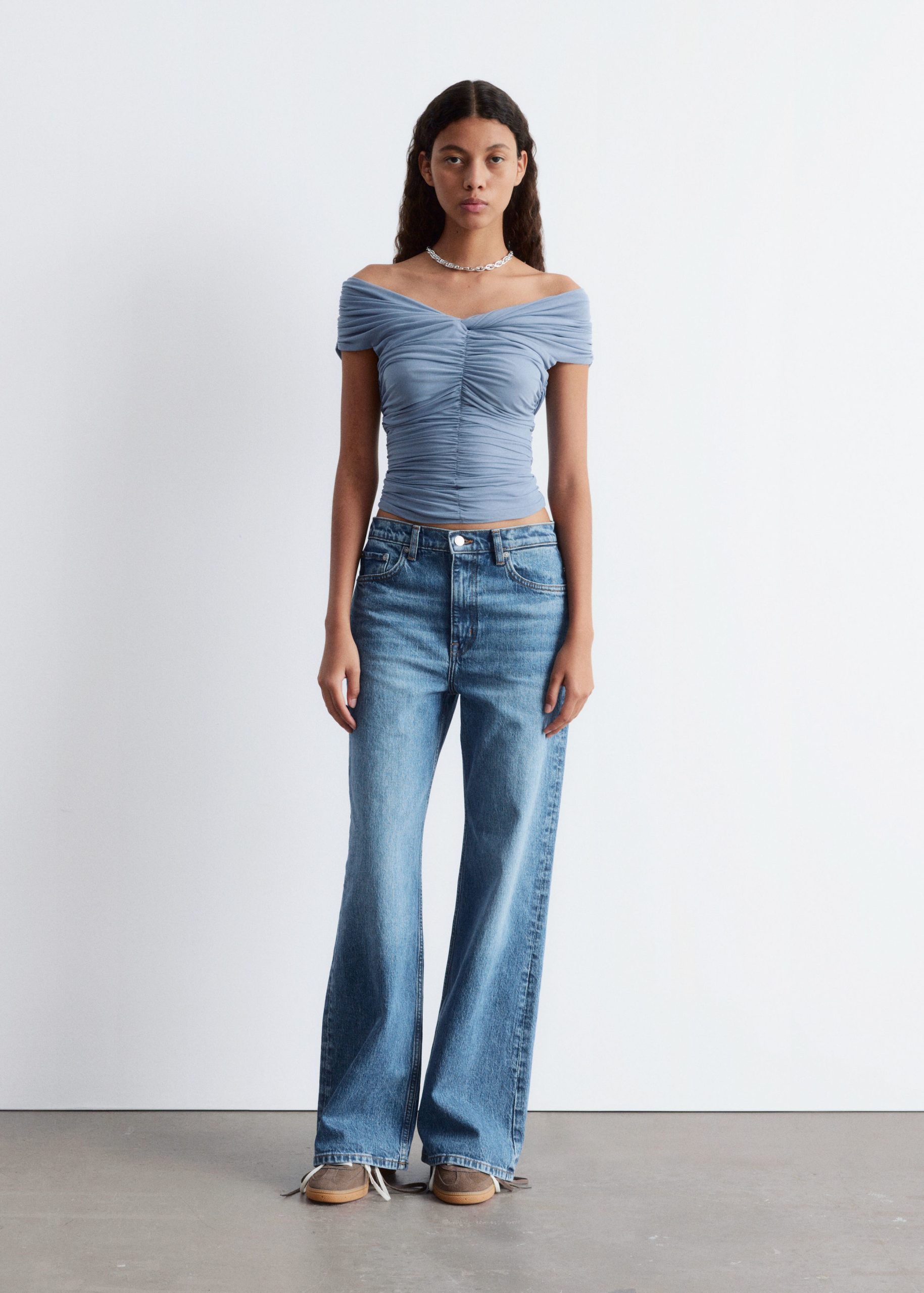 This top is crafted from a soft, stretchy mesh fabric with an all-over ruched effect. Designed in a sleeveless, slim-fit silhouette with a v-neckline and shoulders that can be pulled down for an optional off-shoulder look.