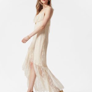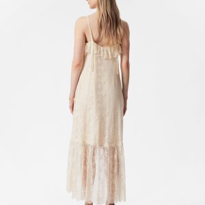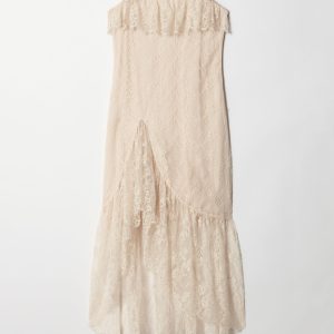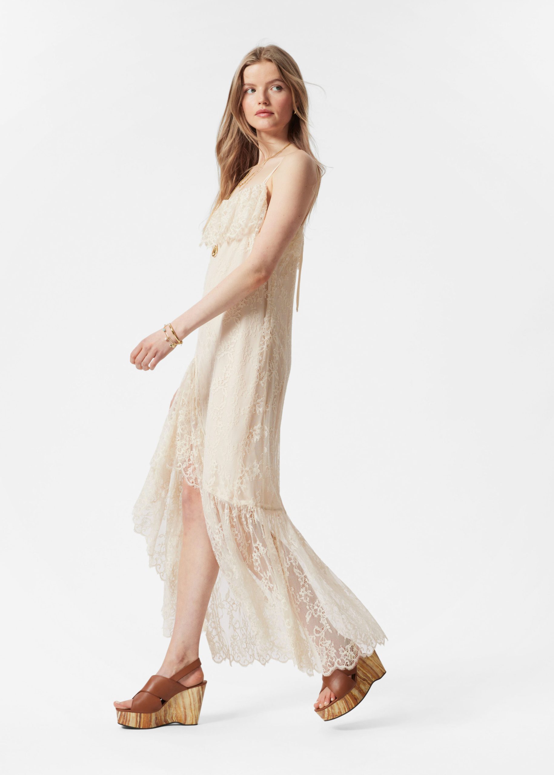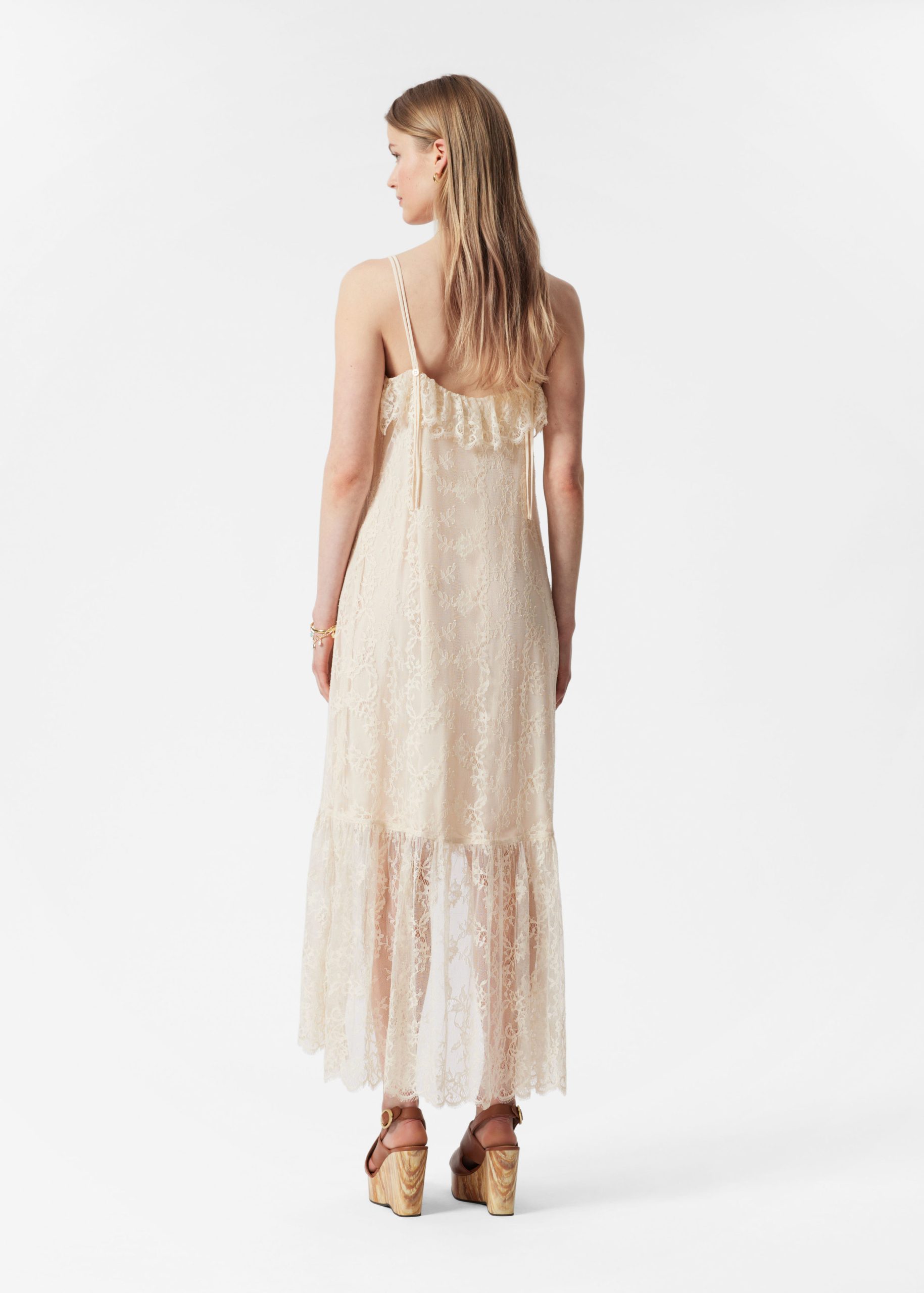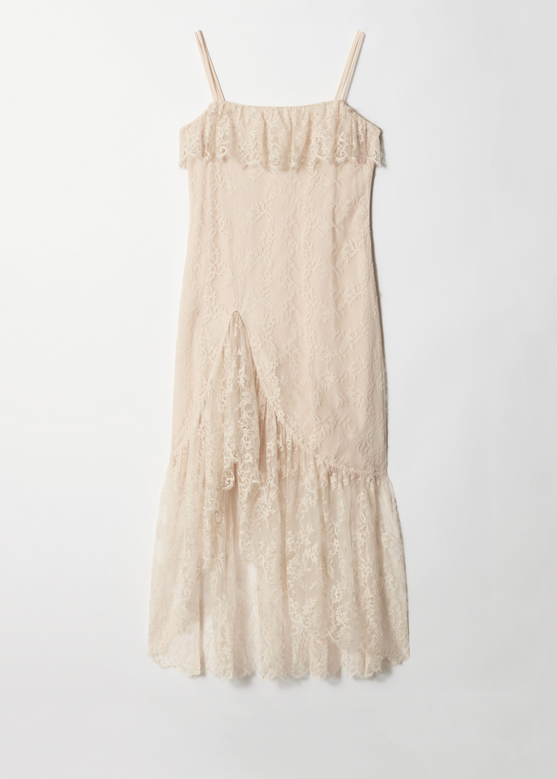 Crafted from delicate lace, this midi dress exudes romantic elegance with a hint of bohemian charm. Designed in a slim silhouette, featuring thin, adjustable shoulder straps, a neckline adorned by a soft curtain frill, and an asymmetrical front slit accented by sheer, gathered lace along the hem. Finished with a concealed zipper at the side seam.Â