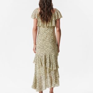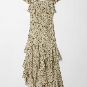Short-sleeve maxi dress featuring a sweetheart neckline, and decorative ruffles across neck and sleeves. Finished with a fitted bodice that shapes into an asymmetric skirt with cross-layered cascading ruffles.