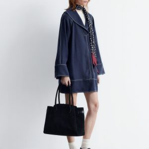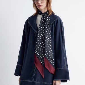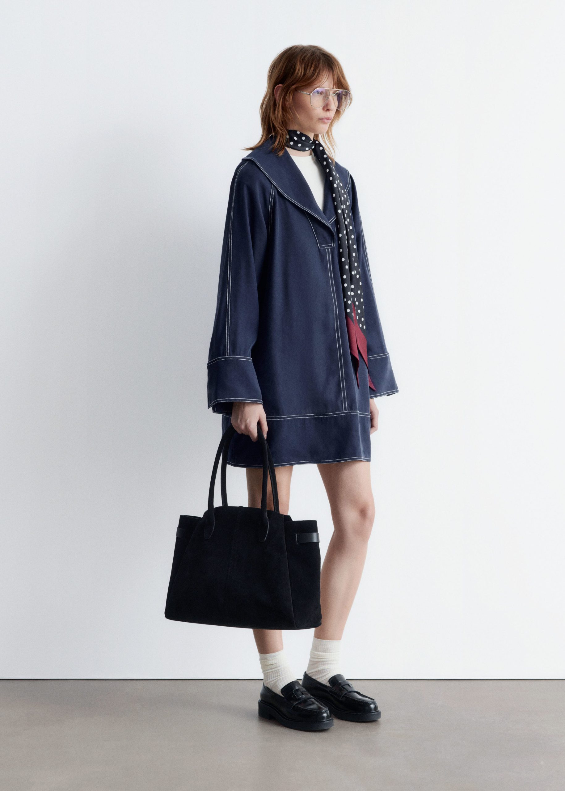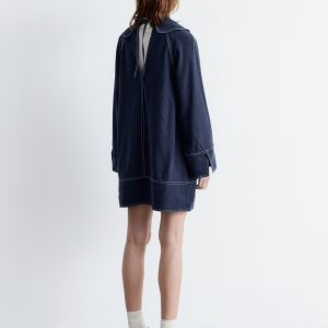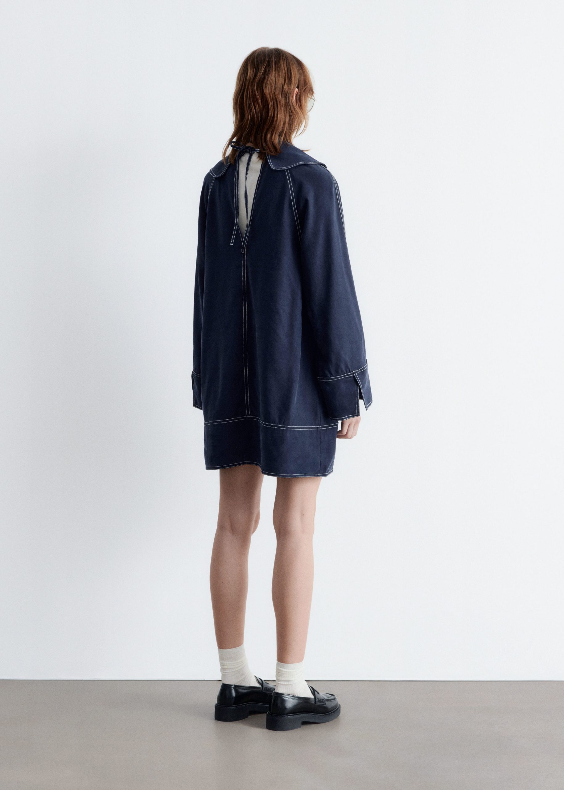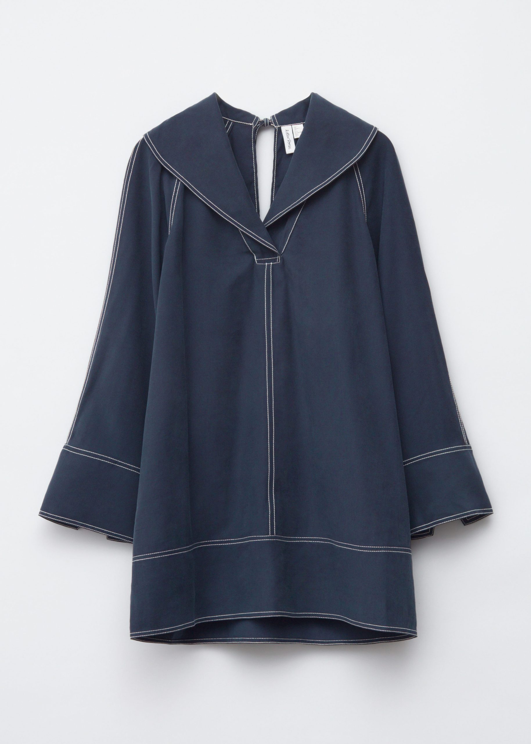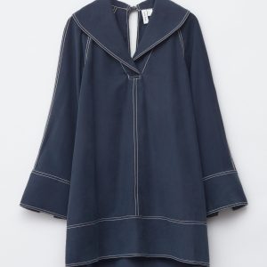 This mini dress is crafted from a mid-weight fabric with a soft, matte finish. It’s cut in an A-line silhouette and features an oversized sailor collar, long wide sleeves with open vents, and contrast topstitched seams. Finished with a v-shaped keyhole opening with tie closures at the neck.