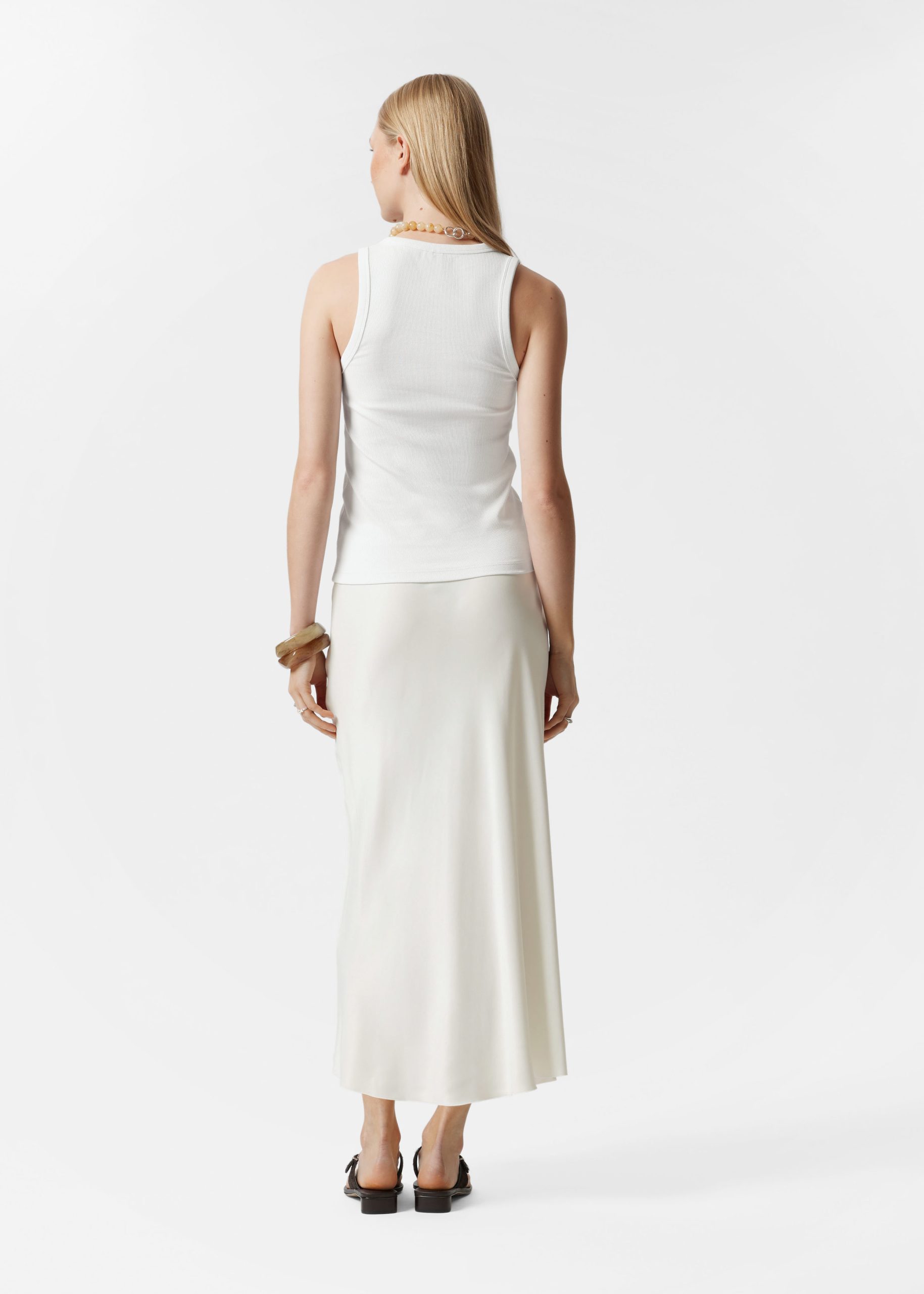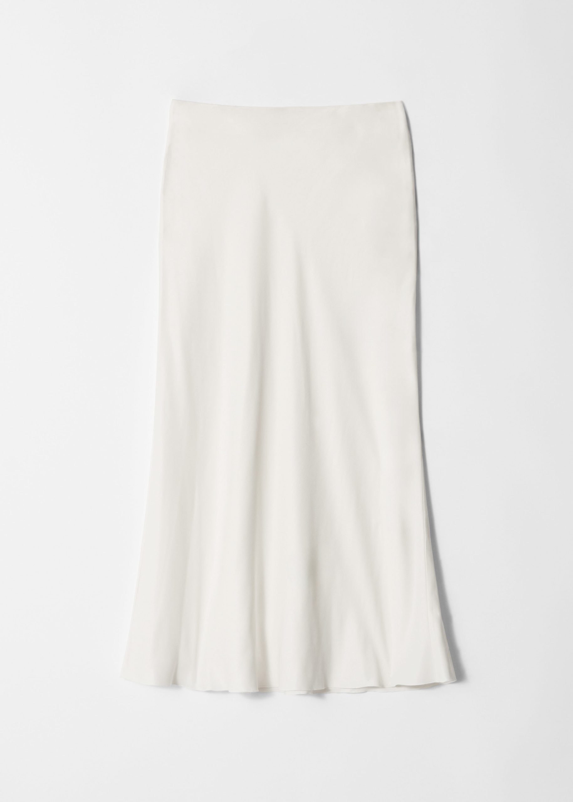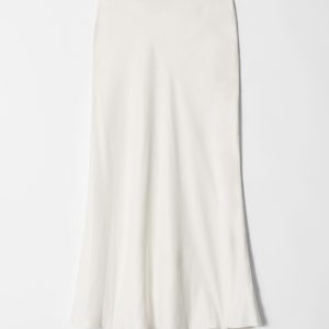 High-waist midi skirt with a glossy satin finish. Secured with a zipper at the side.