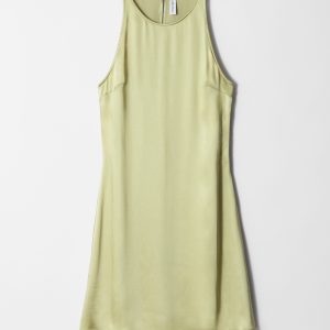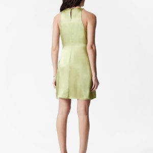 Sleeveless mini dress crafted from a lustrous satin fabric. Featuring a round neckline and a straight A-line silhouette. Finished with a keyhole closure at the back and a concealed zipper at the side.Â