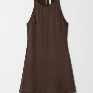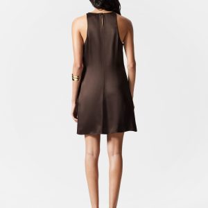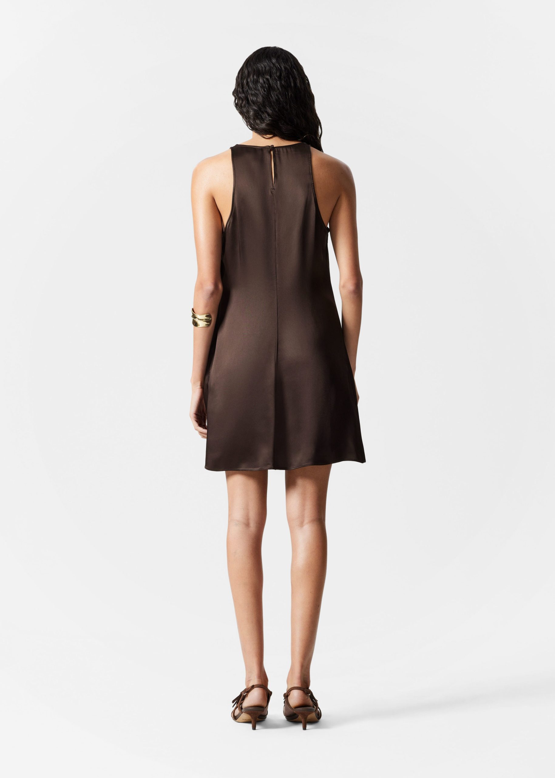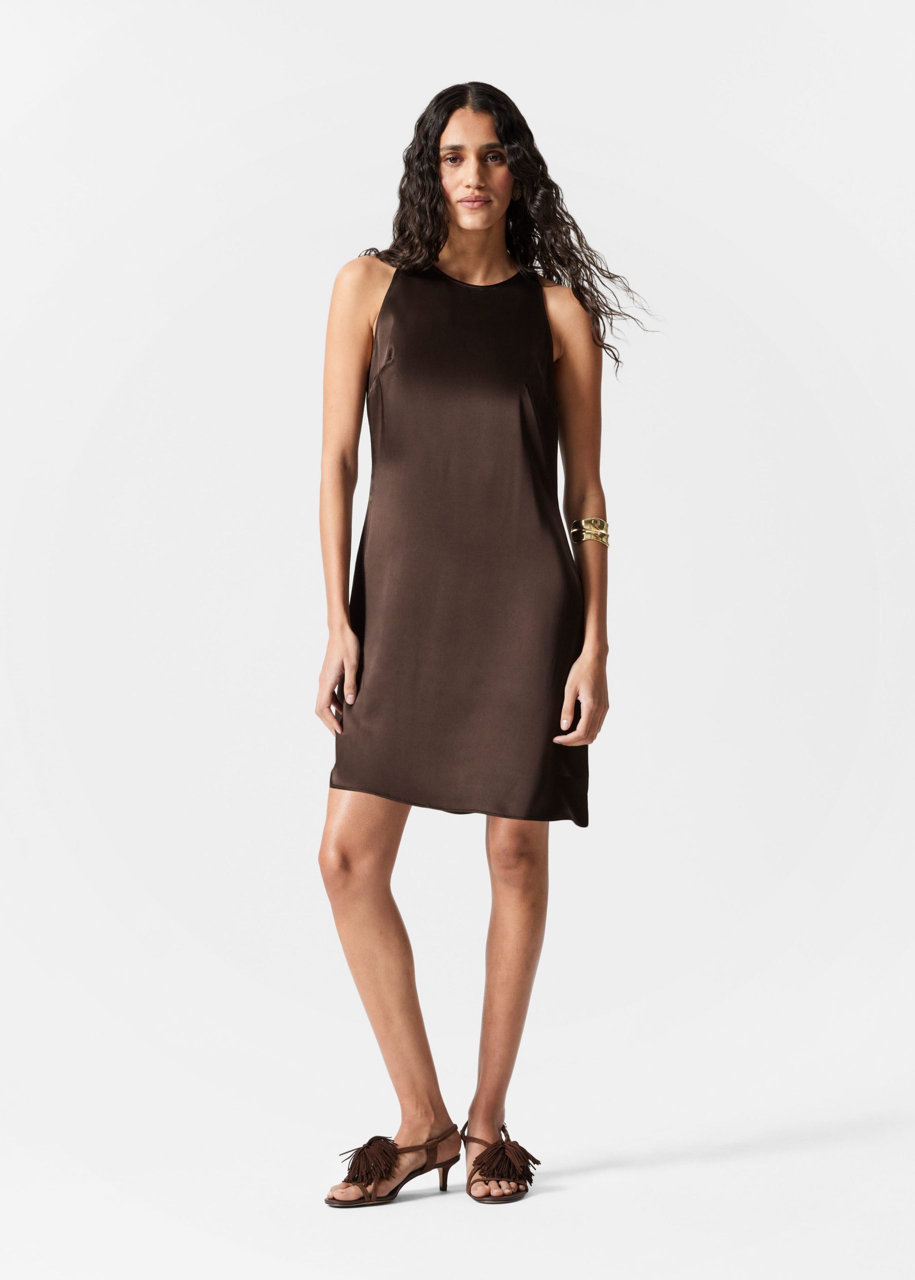 Sleeveless mini dress crafted from a lustrous satin fabric. Featuring a round neckline and a straight A-line silhouette. Finished with a keyhole closure at the back and a concealed zipper at the side.Â