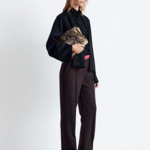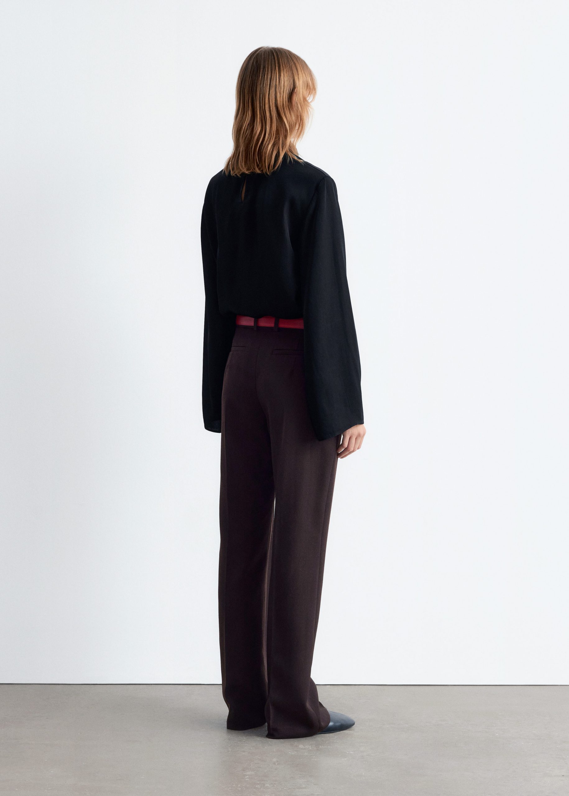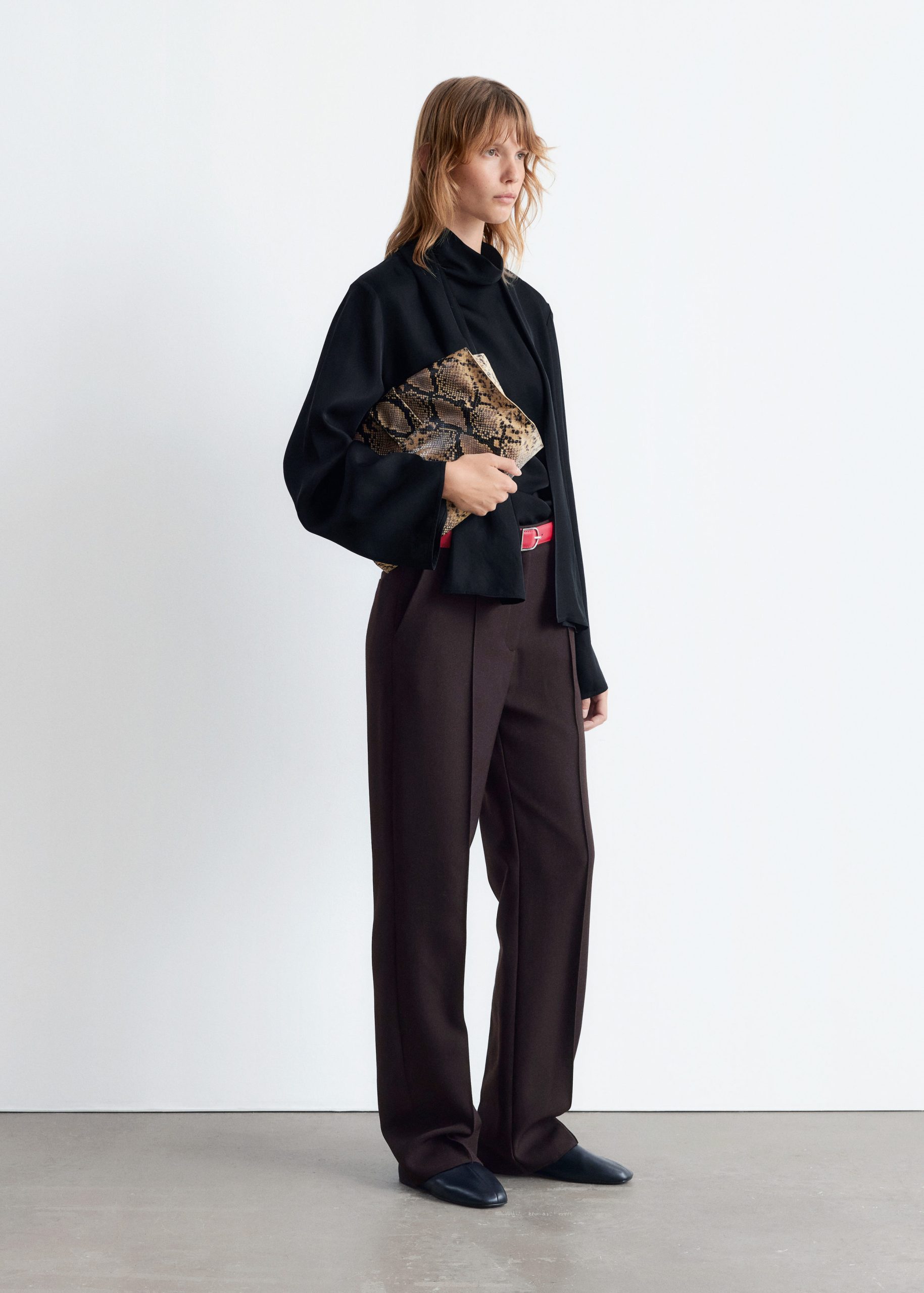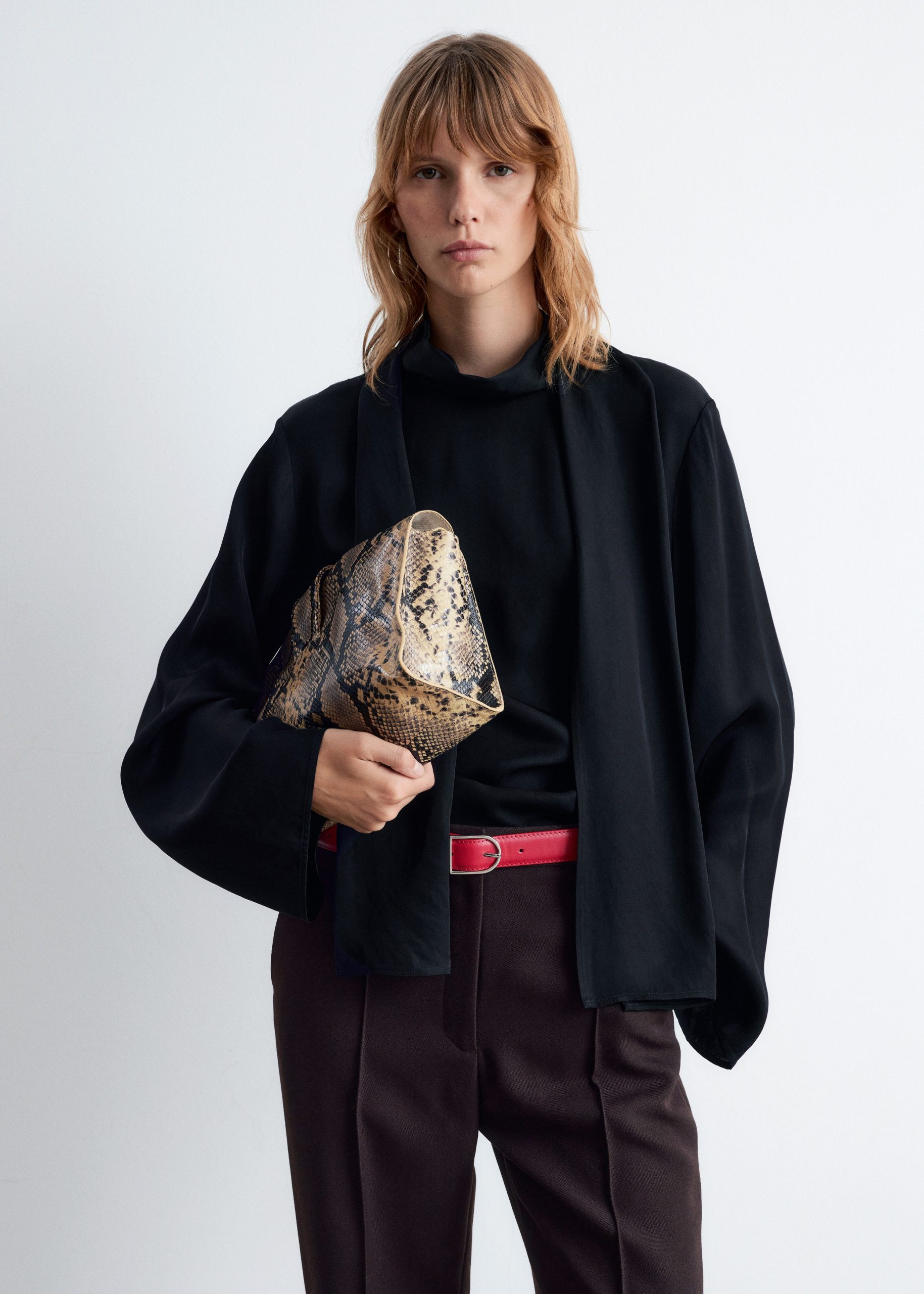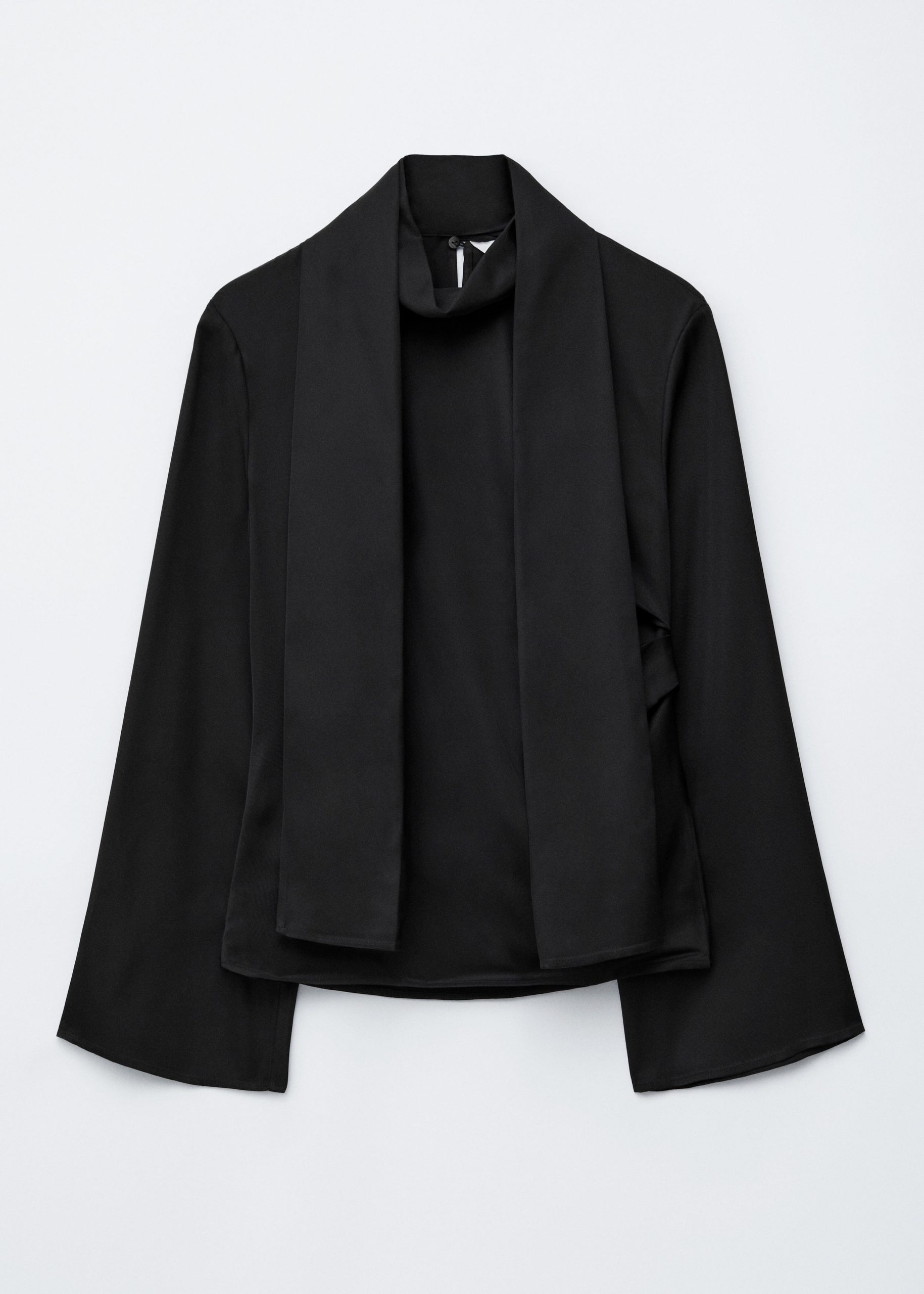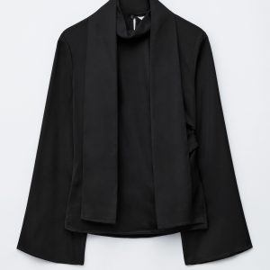 This blouse is crafted from a lightweight twill satin. It features a stand collar with a built-in scarf that can be tied or draped over the shoulder, and gentle folds at the waist. Finished with a concealed side zipper and a tiny slit at the back neck, secured with a button closure.