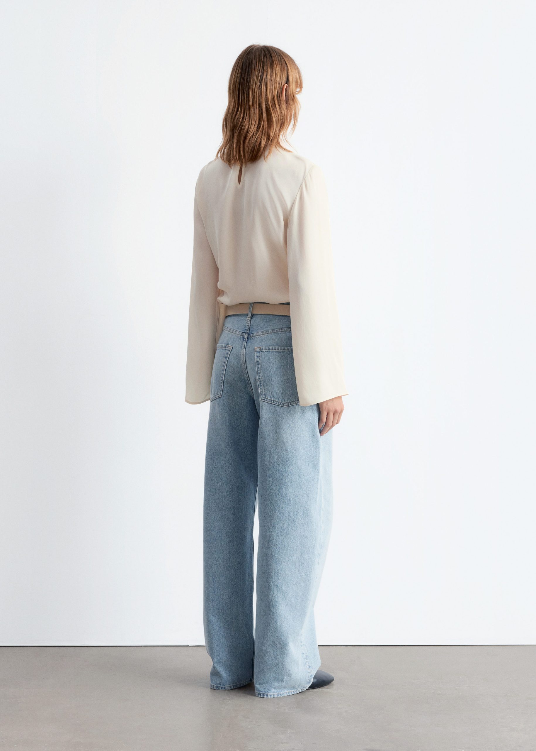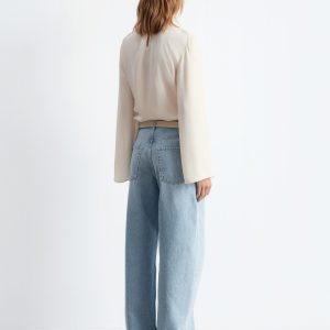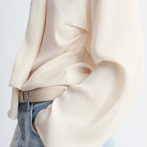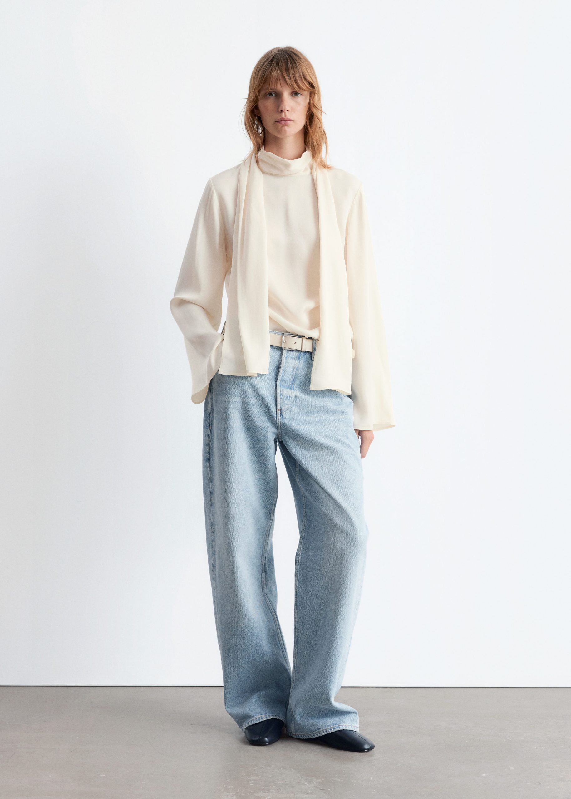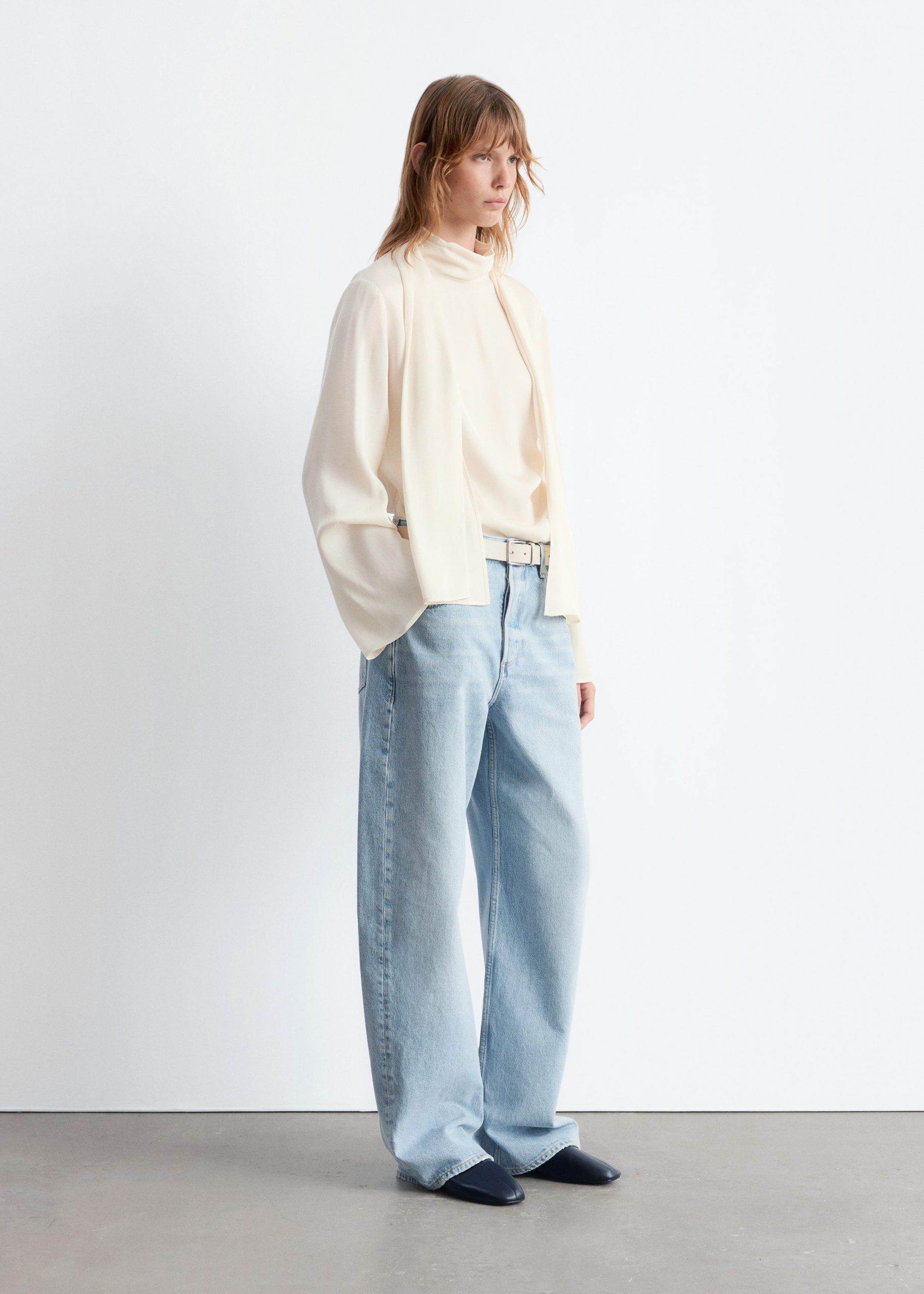 This blouse is crafted from a lightweight twill satin. It features a stand collar with a built-in scarf that can be tied or draped over the shoulder, and gentle folds at the waist. Finished with a concealed side zipper and a tiny slit at the back neck, secured with a button closure.