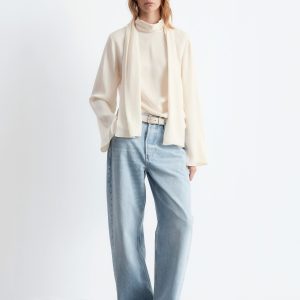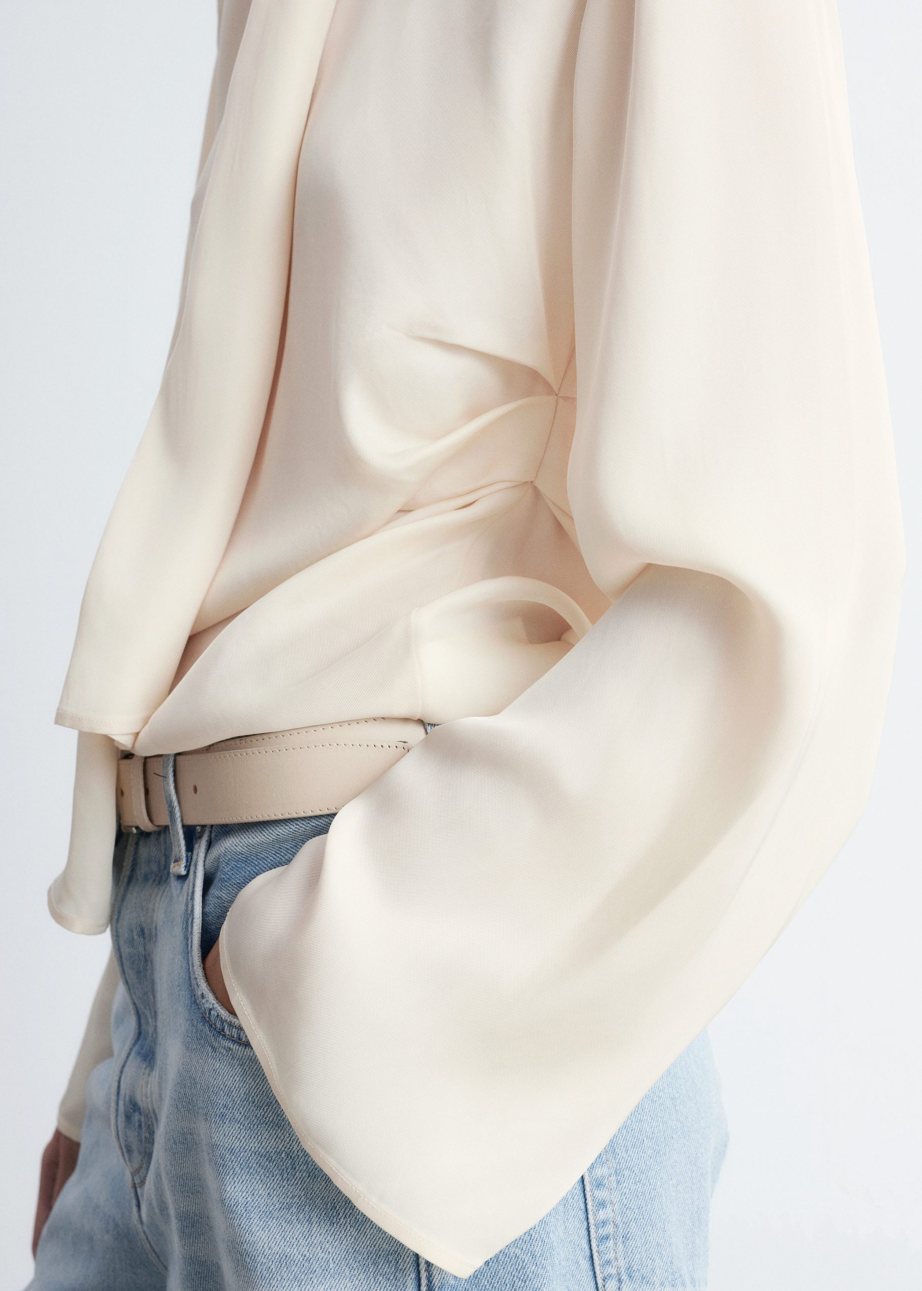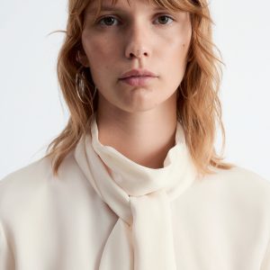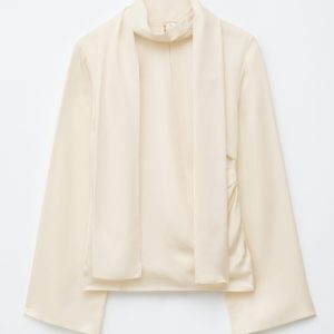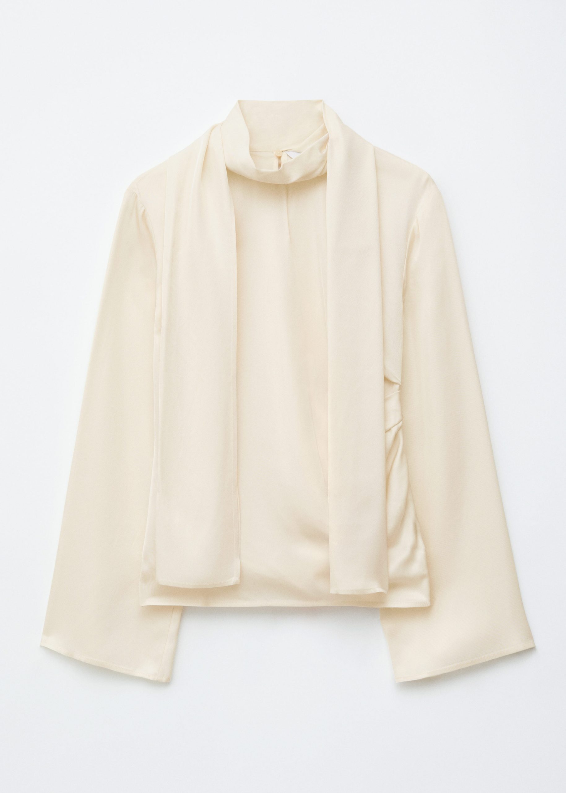 This blouse is crafted from a lightweight twill satin. It features a stand collar with a built-in scarf that can be tied or draped over the shoulder, and gentle folds at the waist. Finished with a concealed side zipper and a tiny slit at the back neck, secured with a button closure.