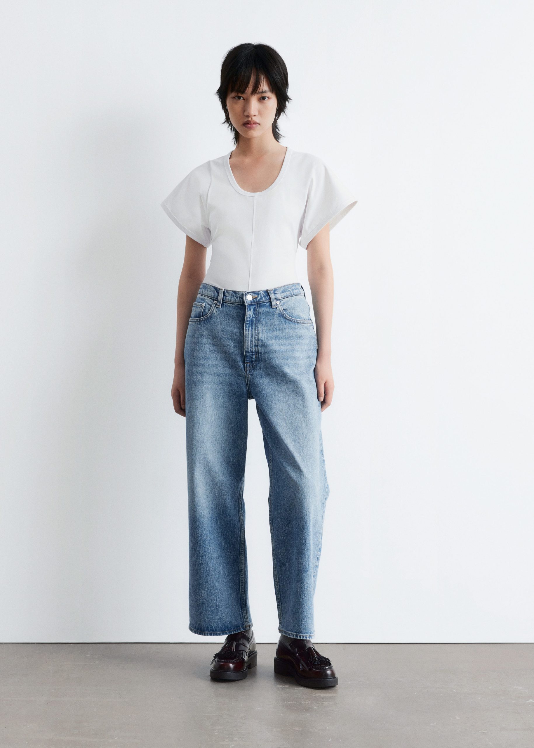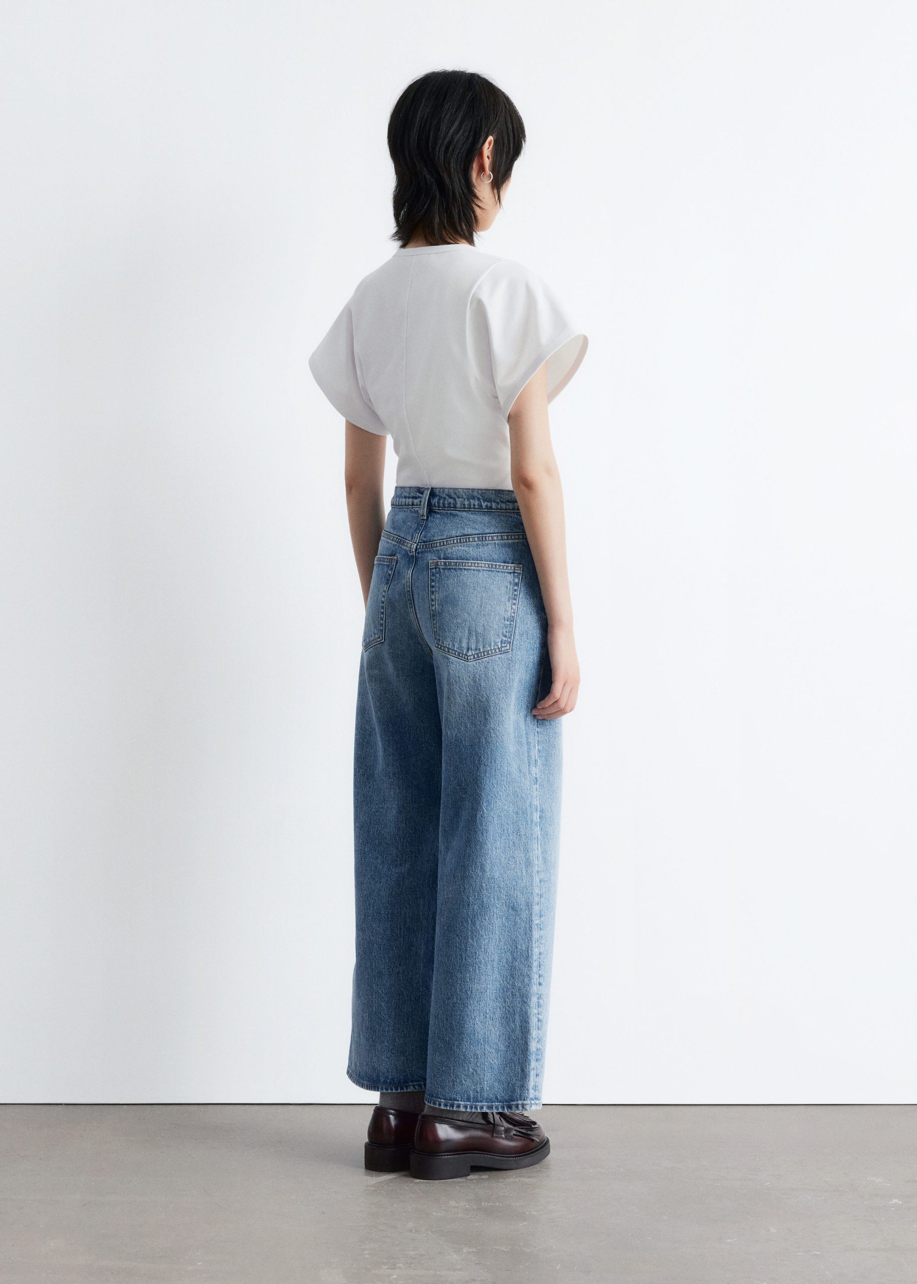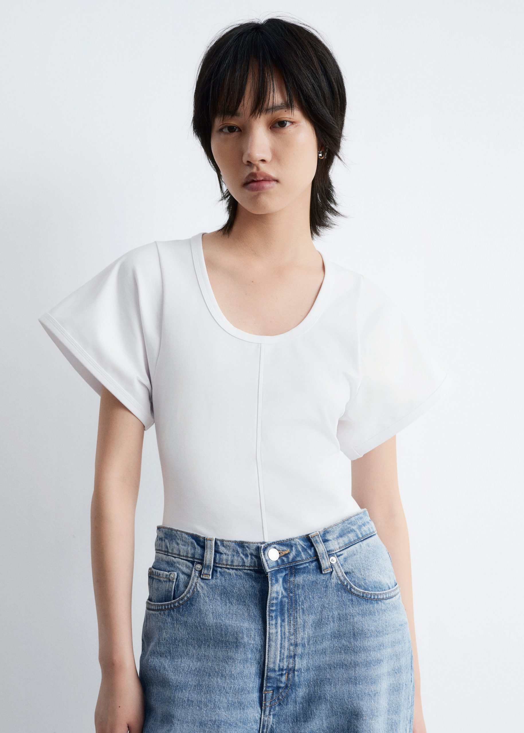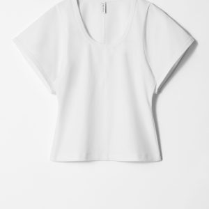 Jersey t-shirt designed with a deep scoop neck, a fitted waist, and short, wide sleeves. Featuring topstitched seams along the front and back for a decorative touch.
