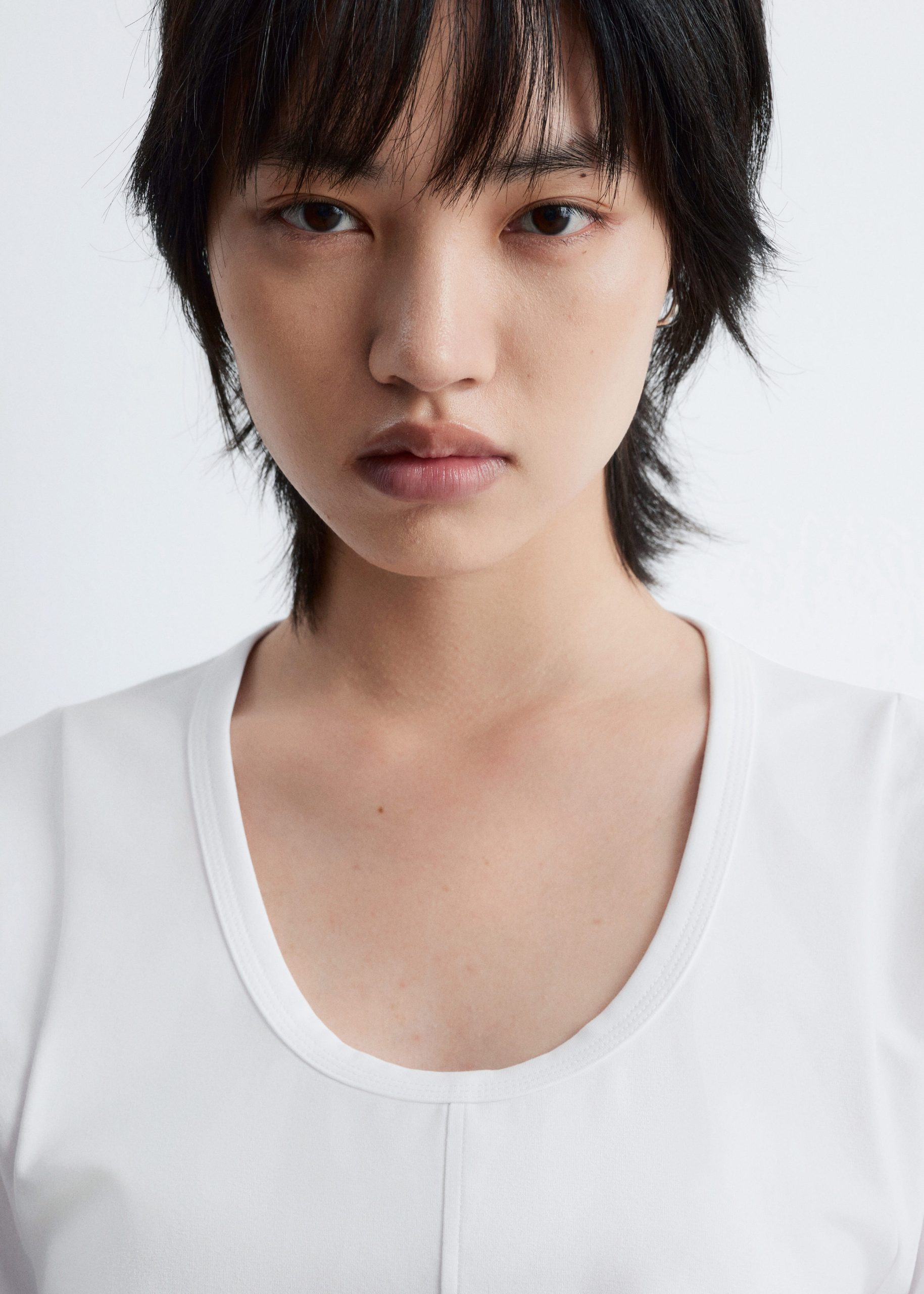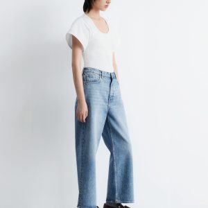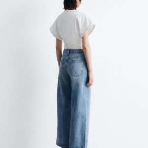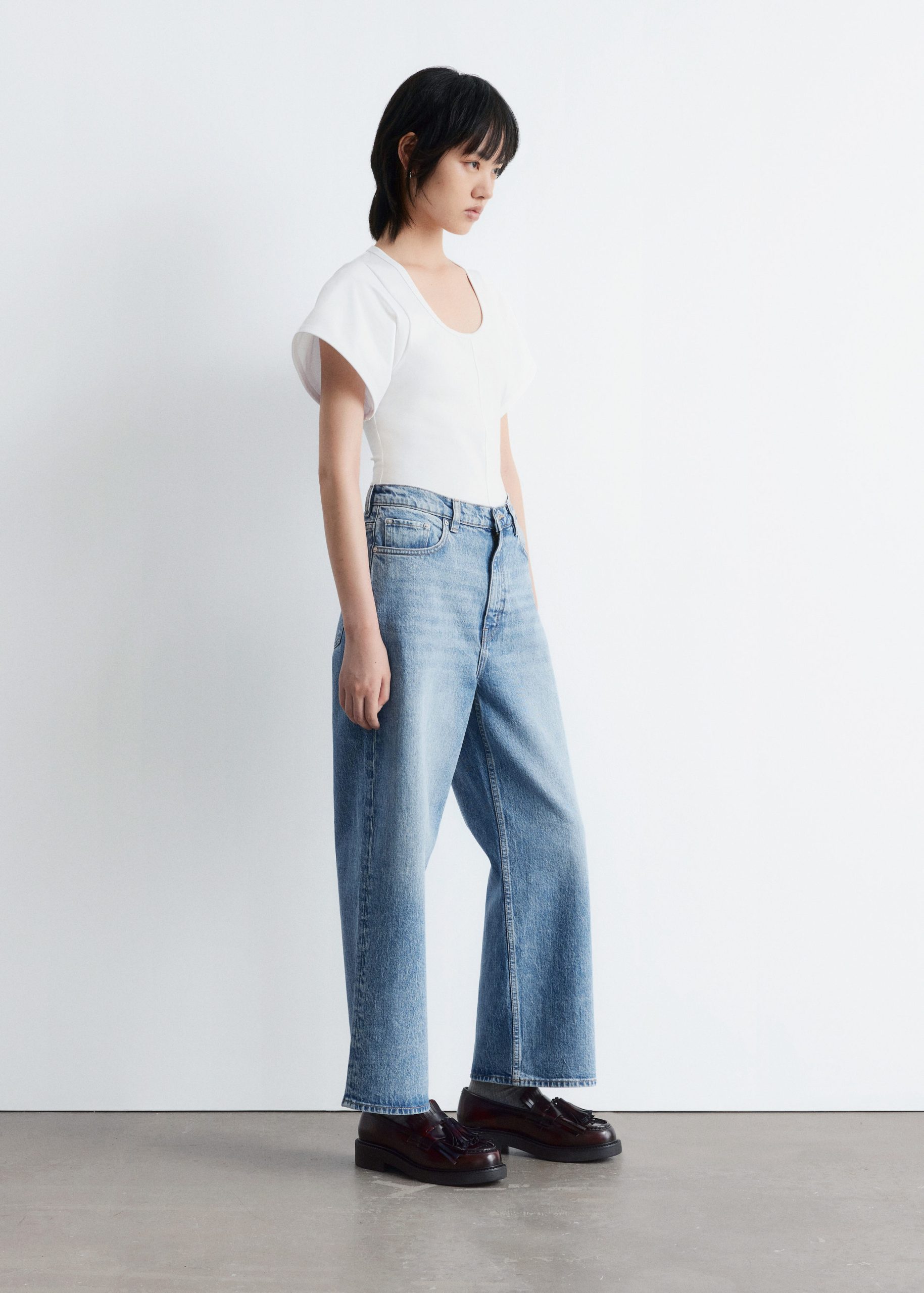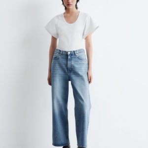 Jersey t-shirt designed with a deep scoop neck, a fitted waist, and short, wide sleeves. Featuring topstitched seams along the front and back for a decorative touch.