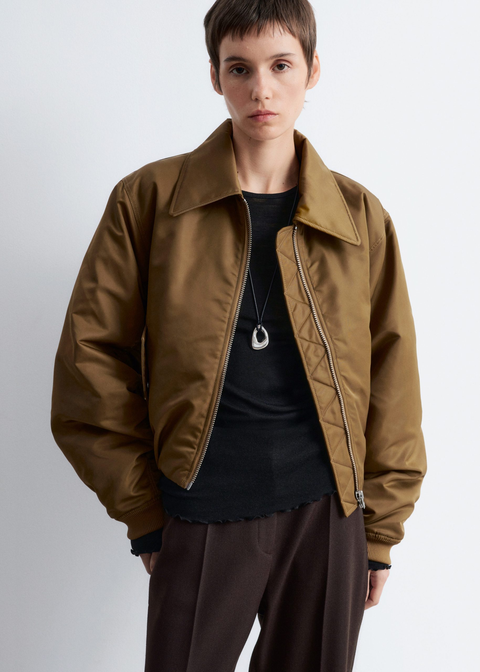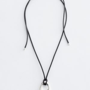 Strung from a cord strand, this long necklace is adorned with a sculptural brass pendant polished to a high shine. The pendant’s sheen contrasts beautifully with the rustic charm of the cord. Finished with an adjustable slider bead for a customizable fit.