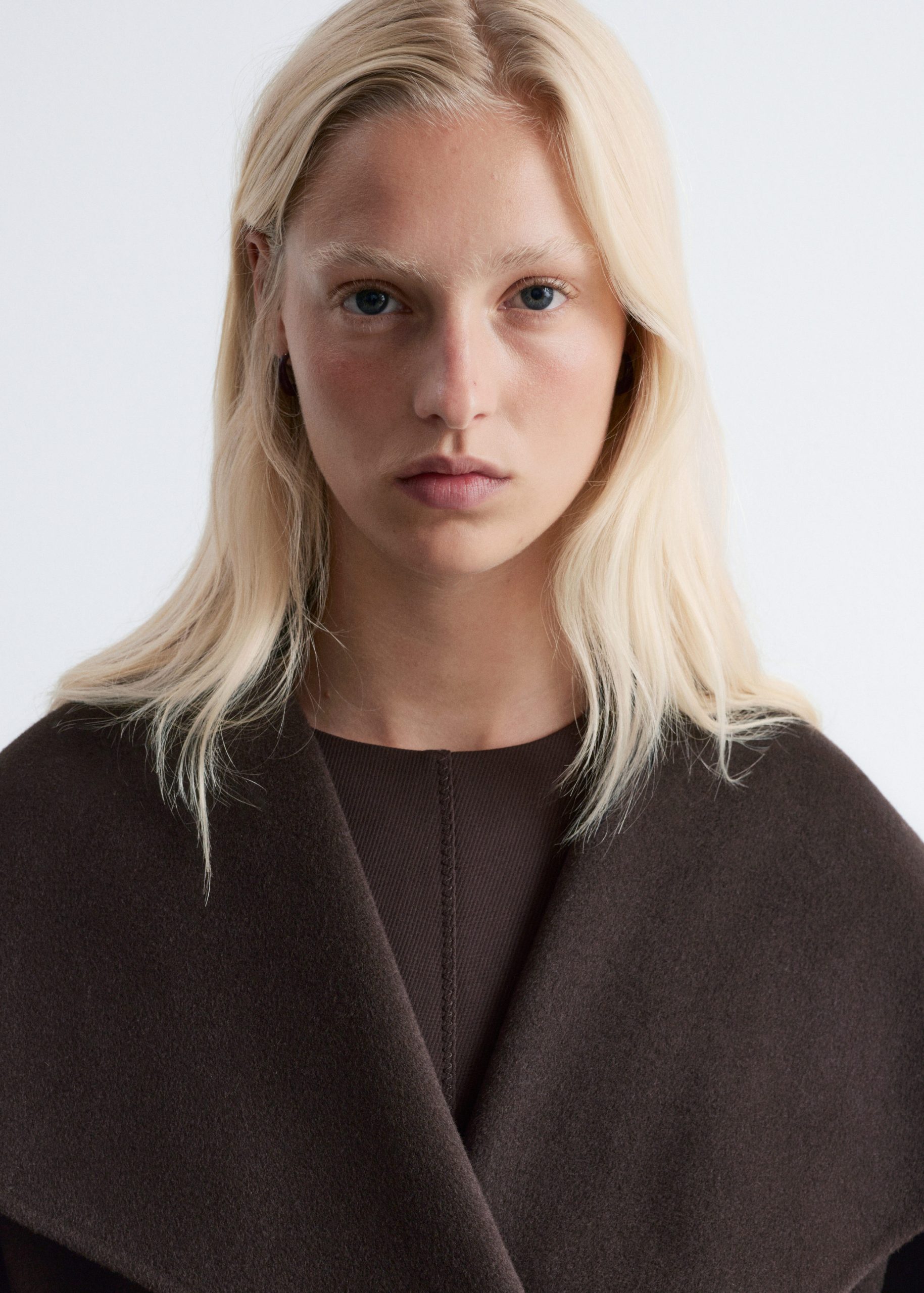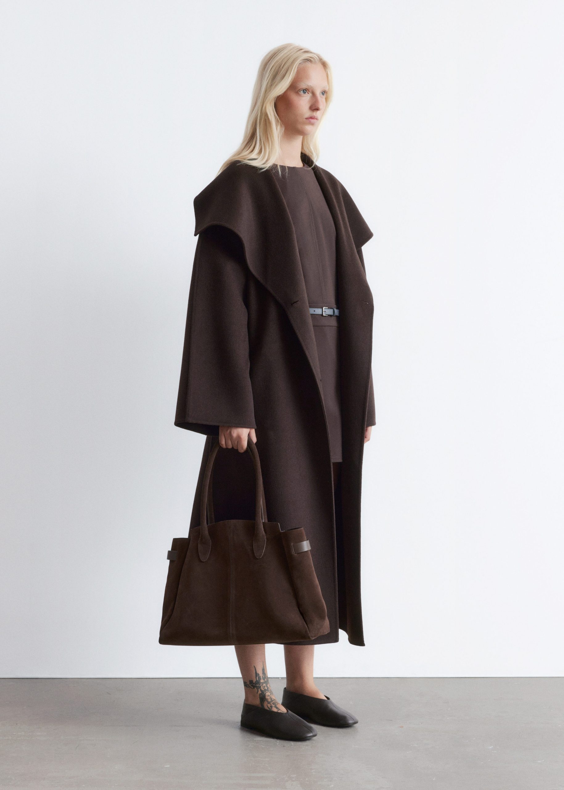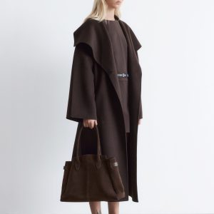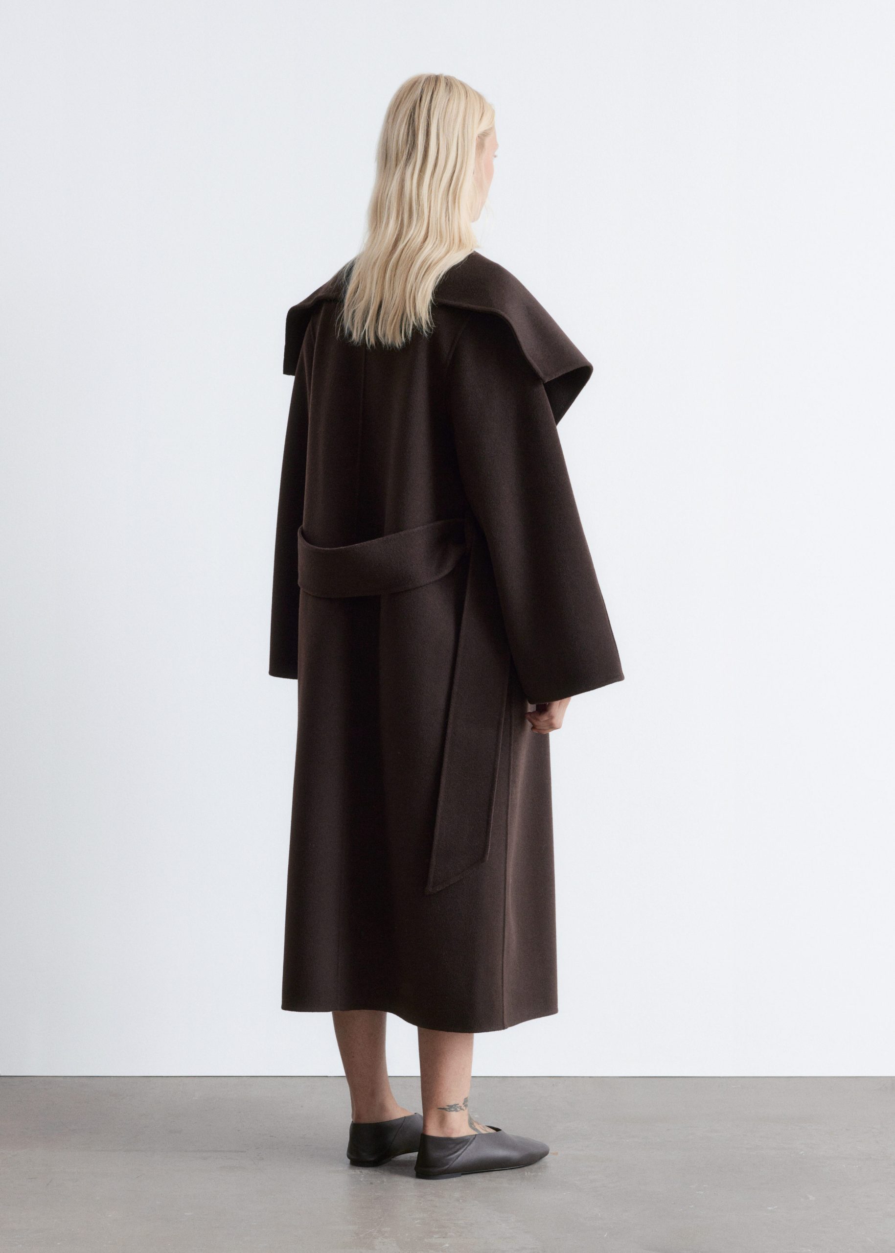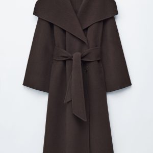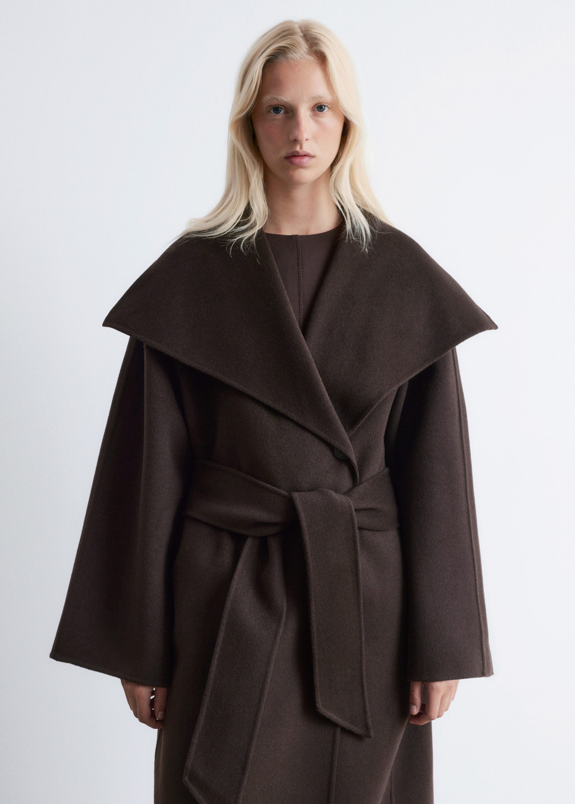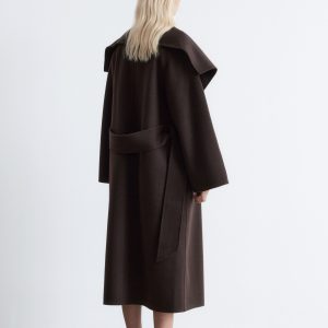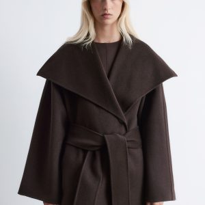 This maxi coat is crafted from a premium wool blend. Cut in a loose silhouette, it features a large shawl collar and a wide tie-belt to cinch the waist. Finished with two button closures at the front. The coat is unlined and detailed with internal bindings for a clean finish.