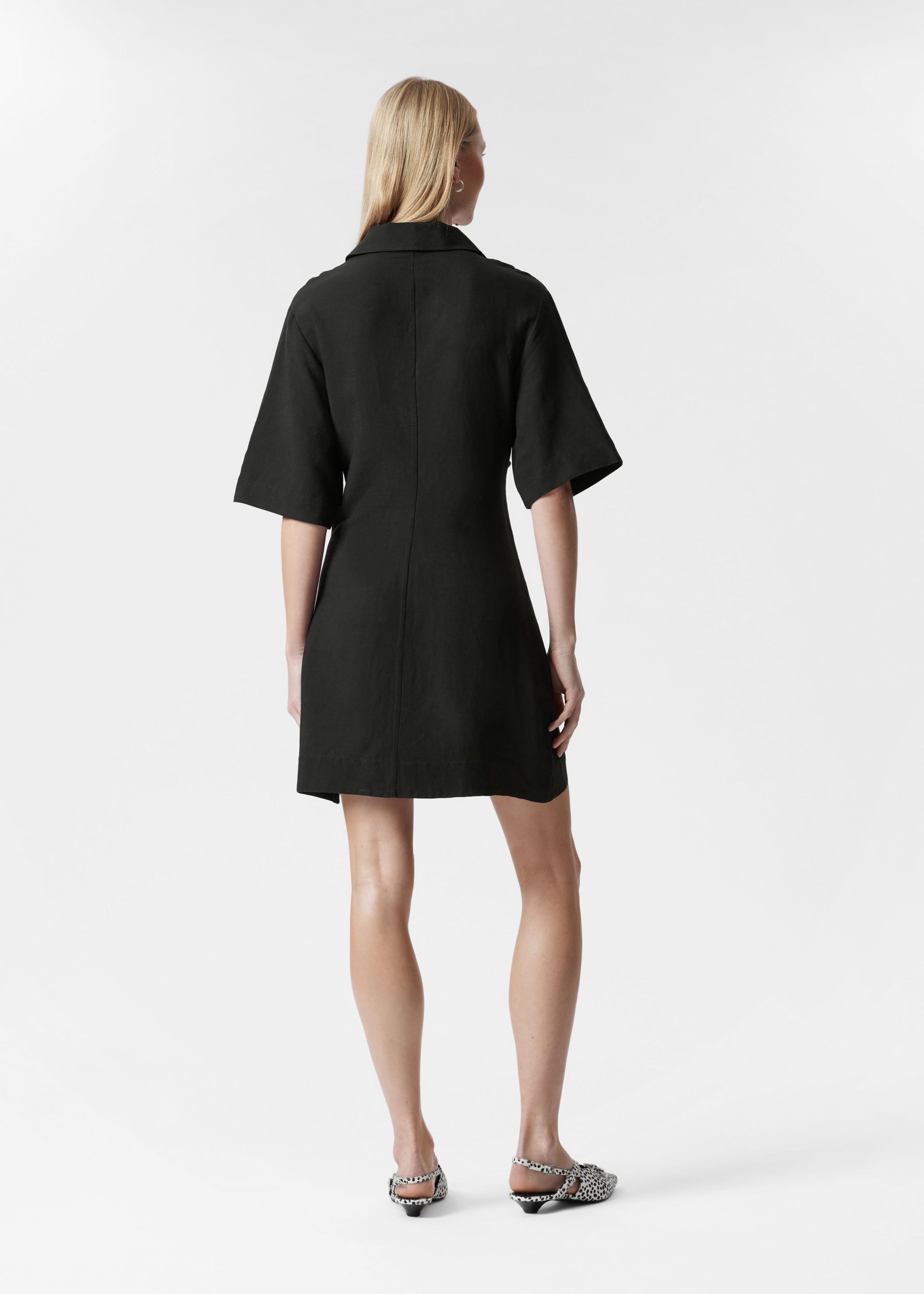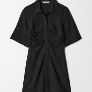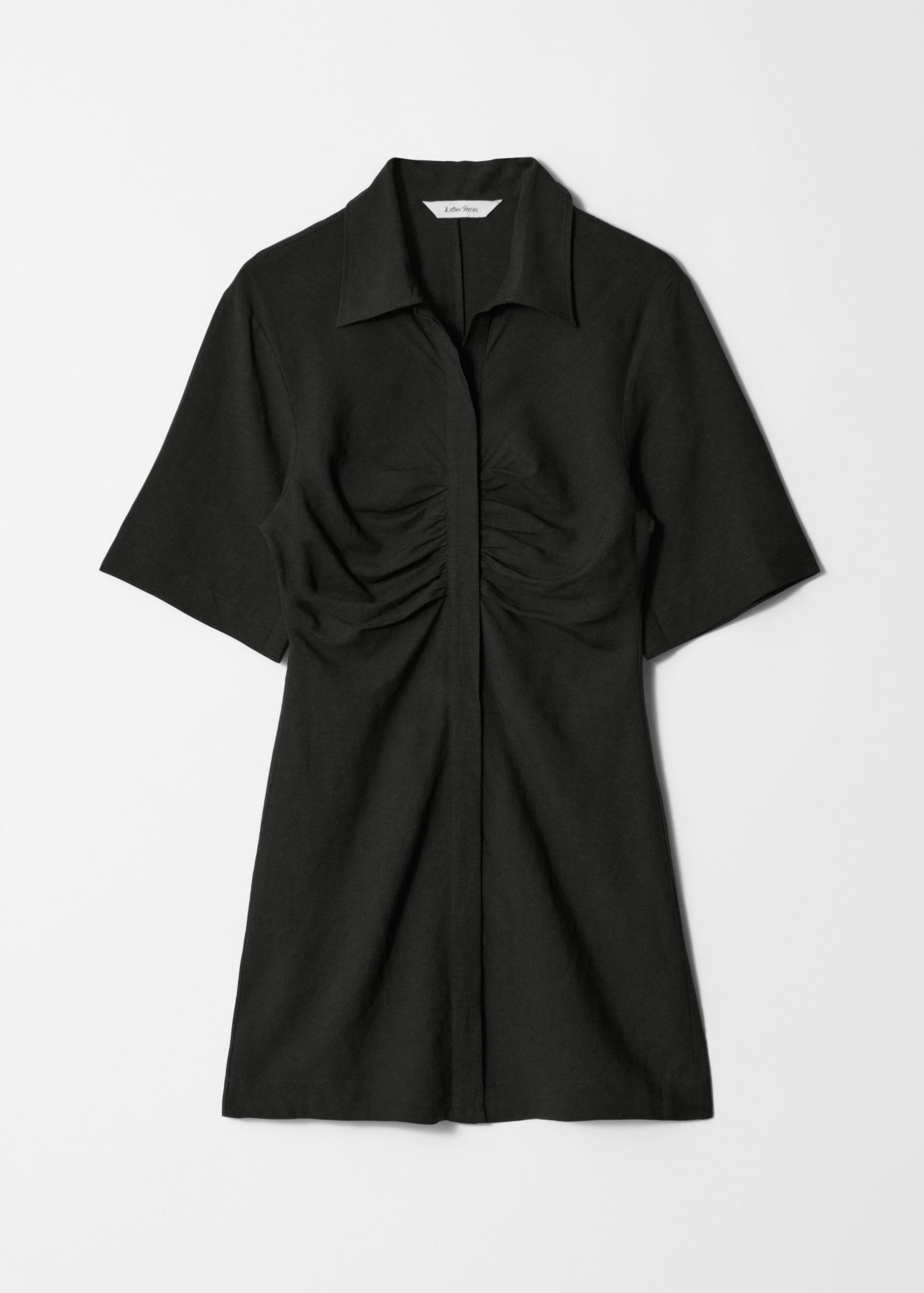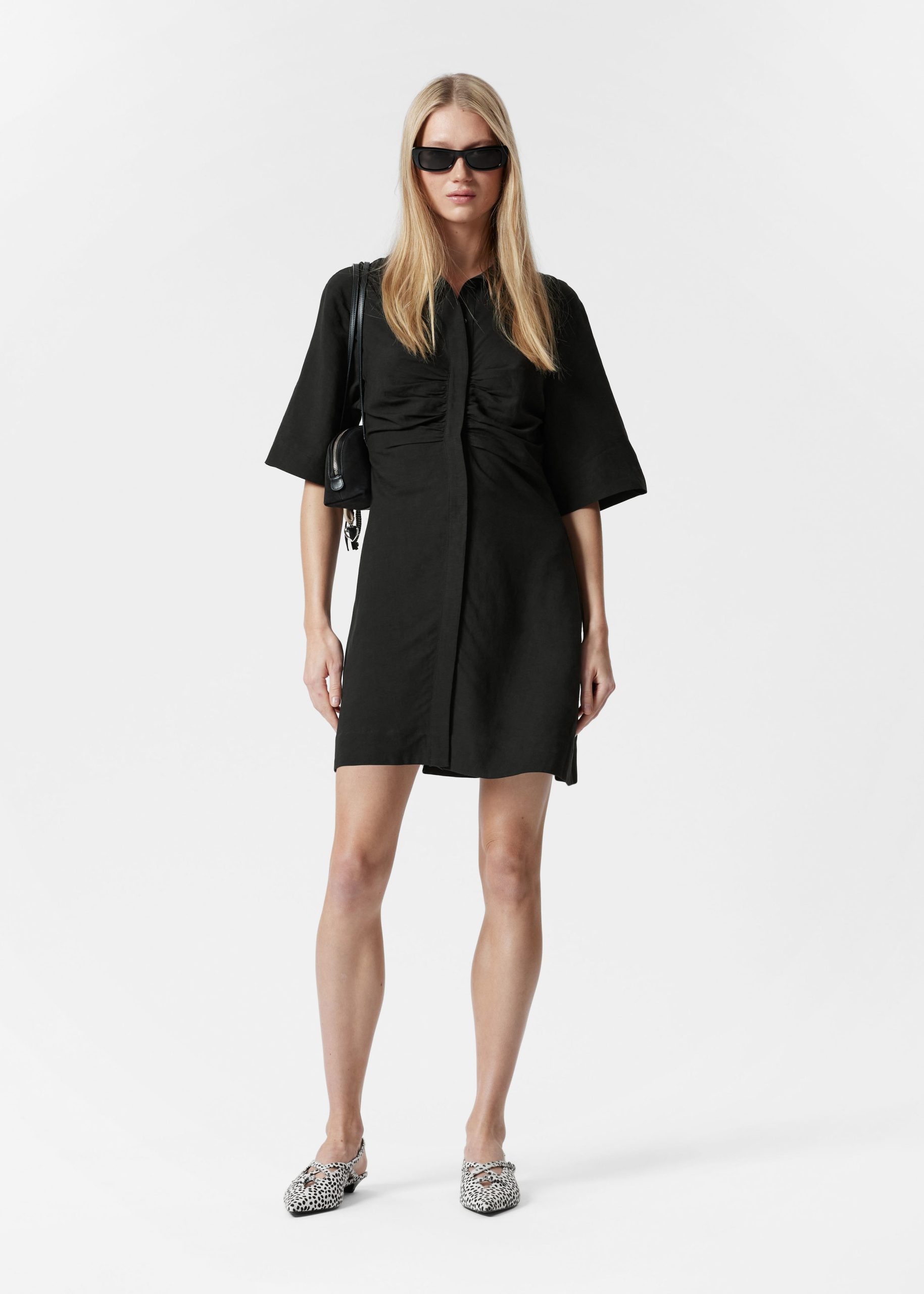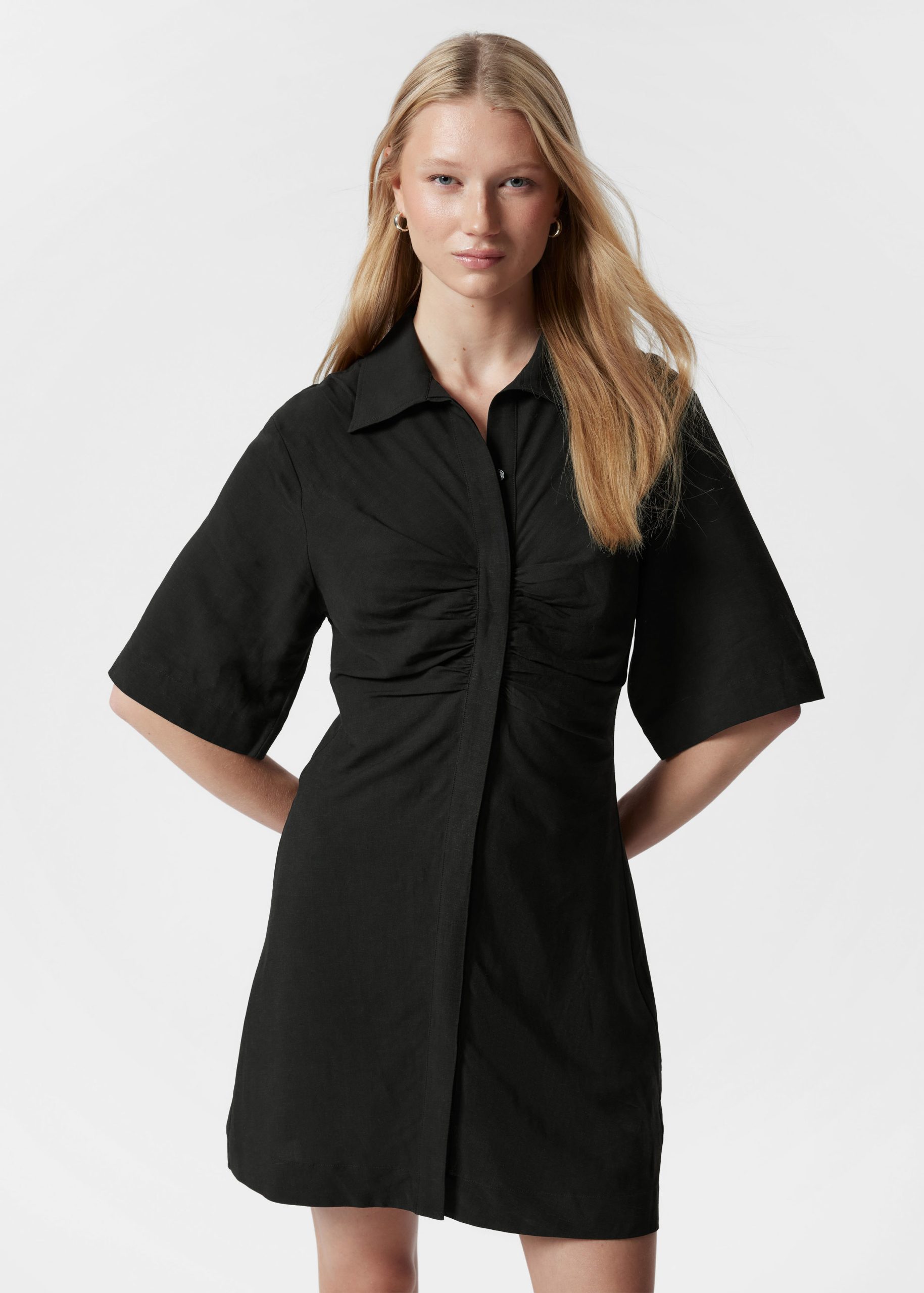 This classic shirt dress is crafted from a lightweight linen blend, making it perfect for balmy summer days. Designed with a fitted silhouette, it features short, wide sleeves and light ruching at the front. Finished with a concealed button placket.Â