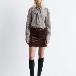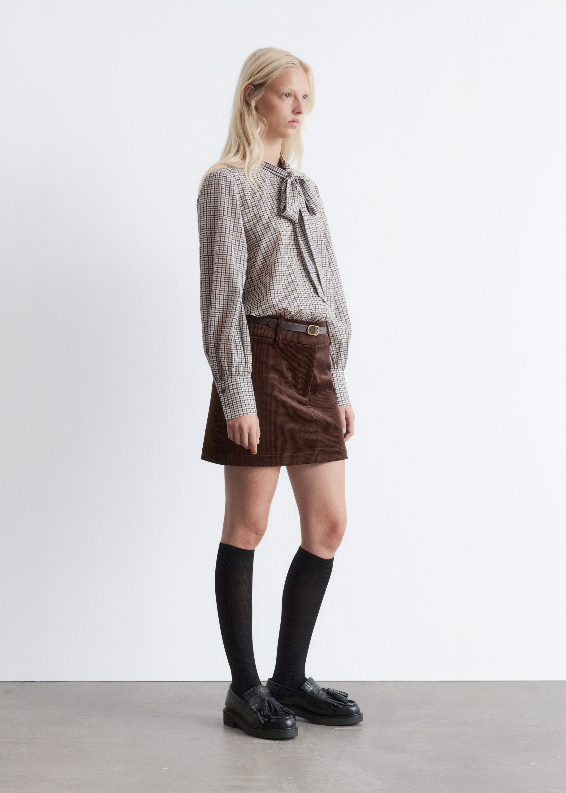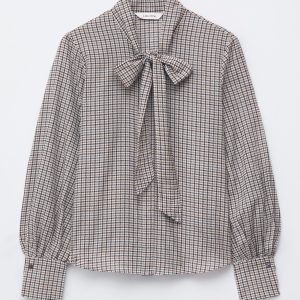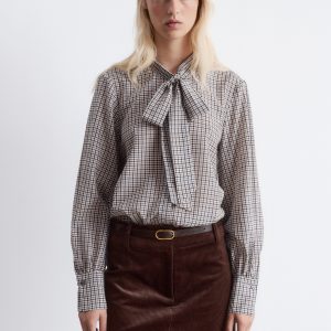 Blouse crafted from a softly draping weave made from a silk and cotton blend, featuring a band collar with a self-tie bow detail. Designed with a front placket traced with concealed buttons, and balloon sleeves with wide, buttoned cuffs.