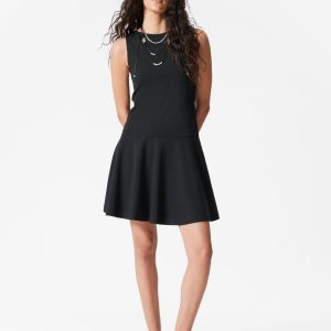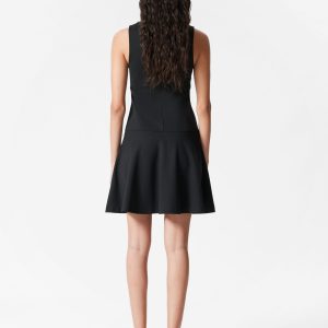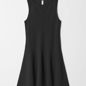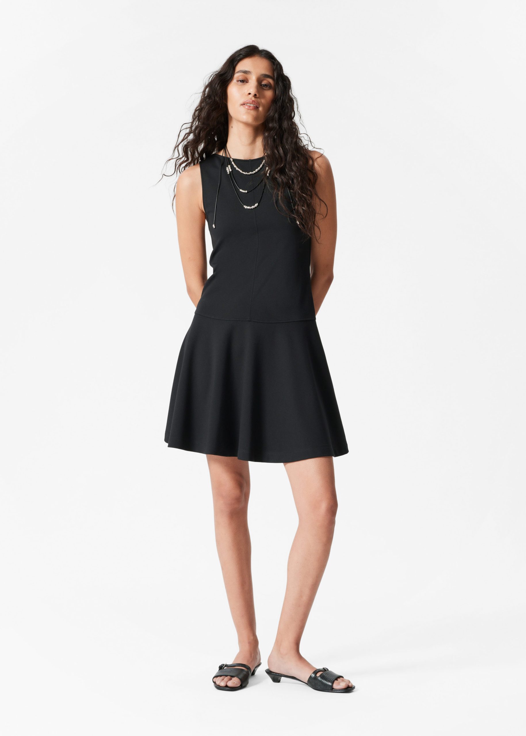 Sleeveless mini dress designed in an A-line silhouette, featuring a dropped waist with a slightly flared skirt. Finished with a boat neckline, and a vertical topstitched seam along the front and back.