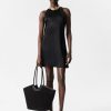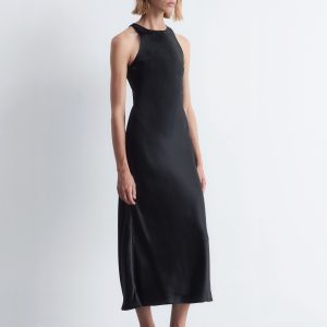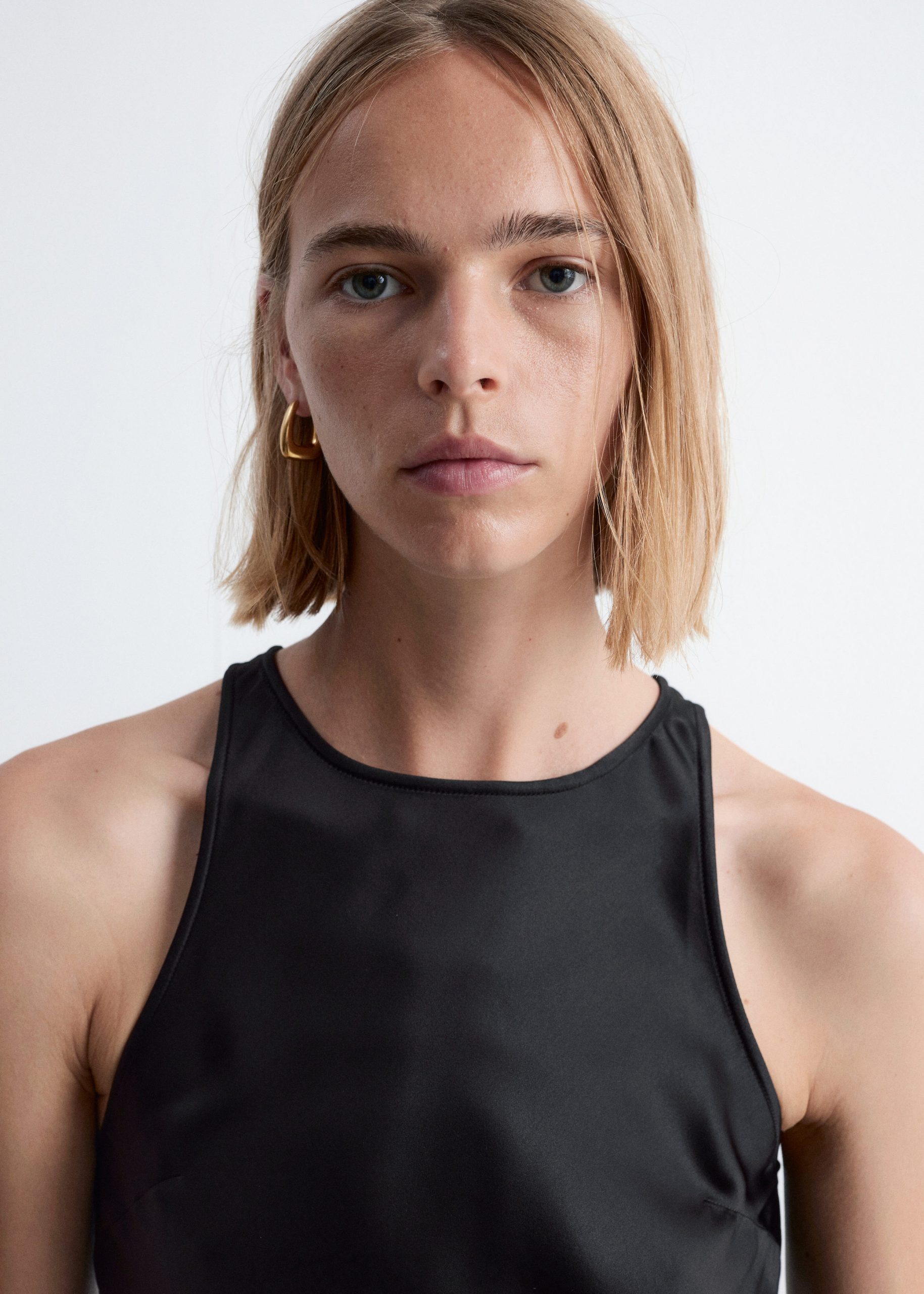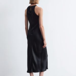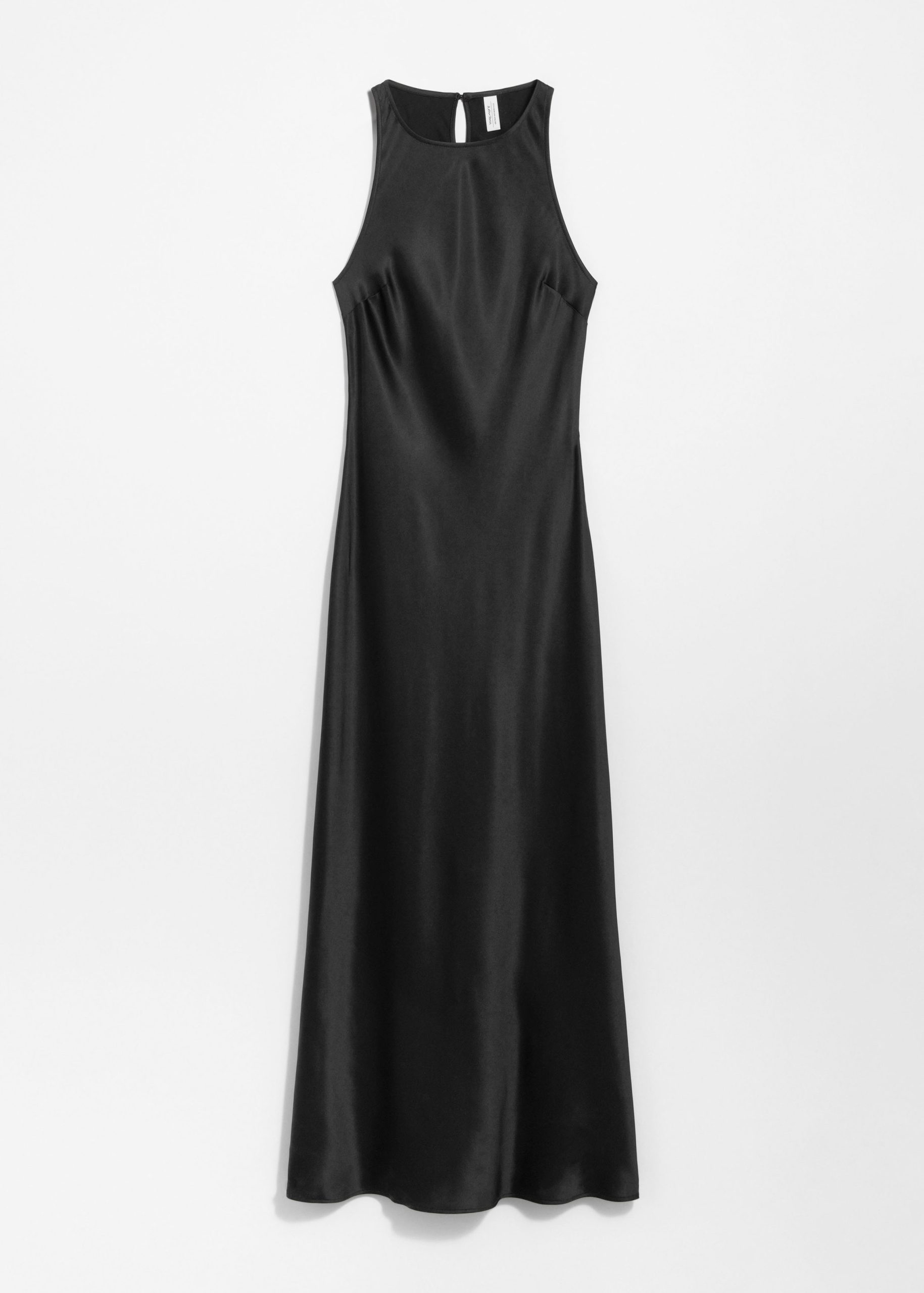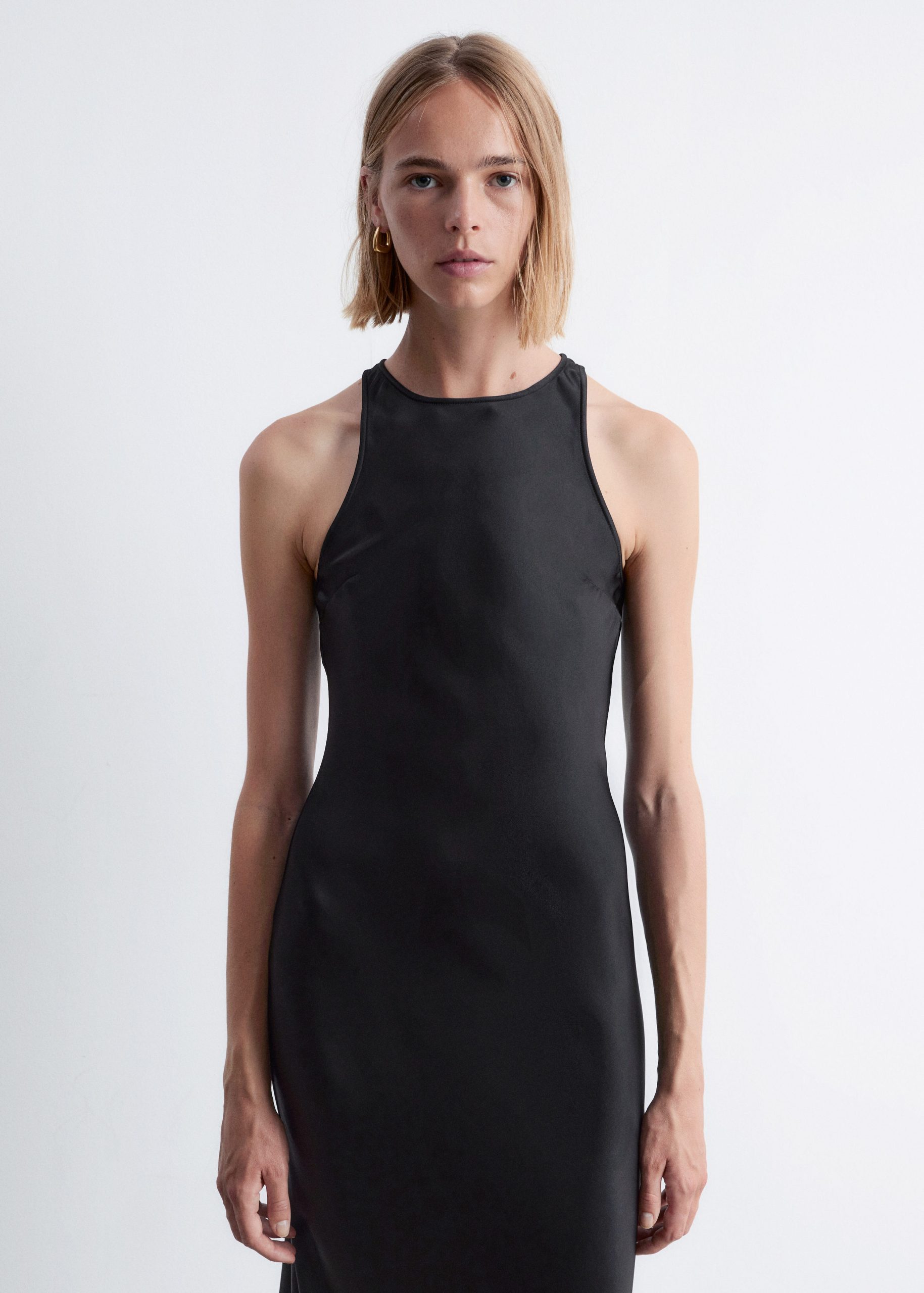 Sleeveless satin dress featuring a glossy, satin finish and a round neckline. Finished with a keyhole closure at the neck.
