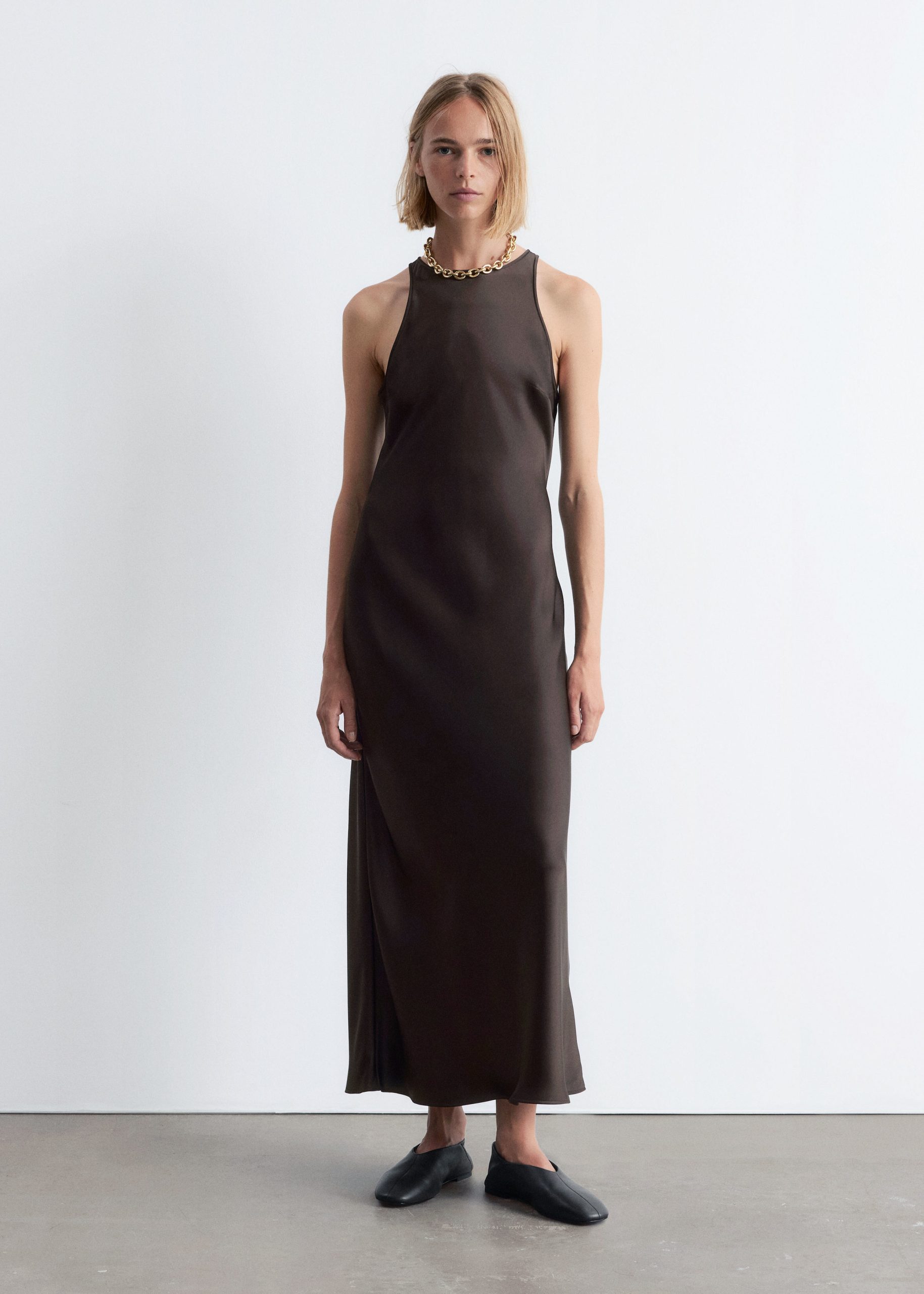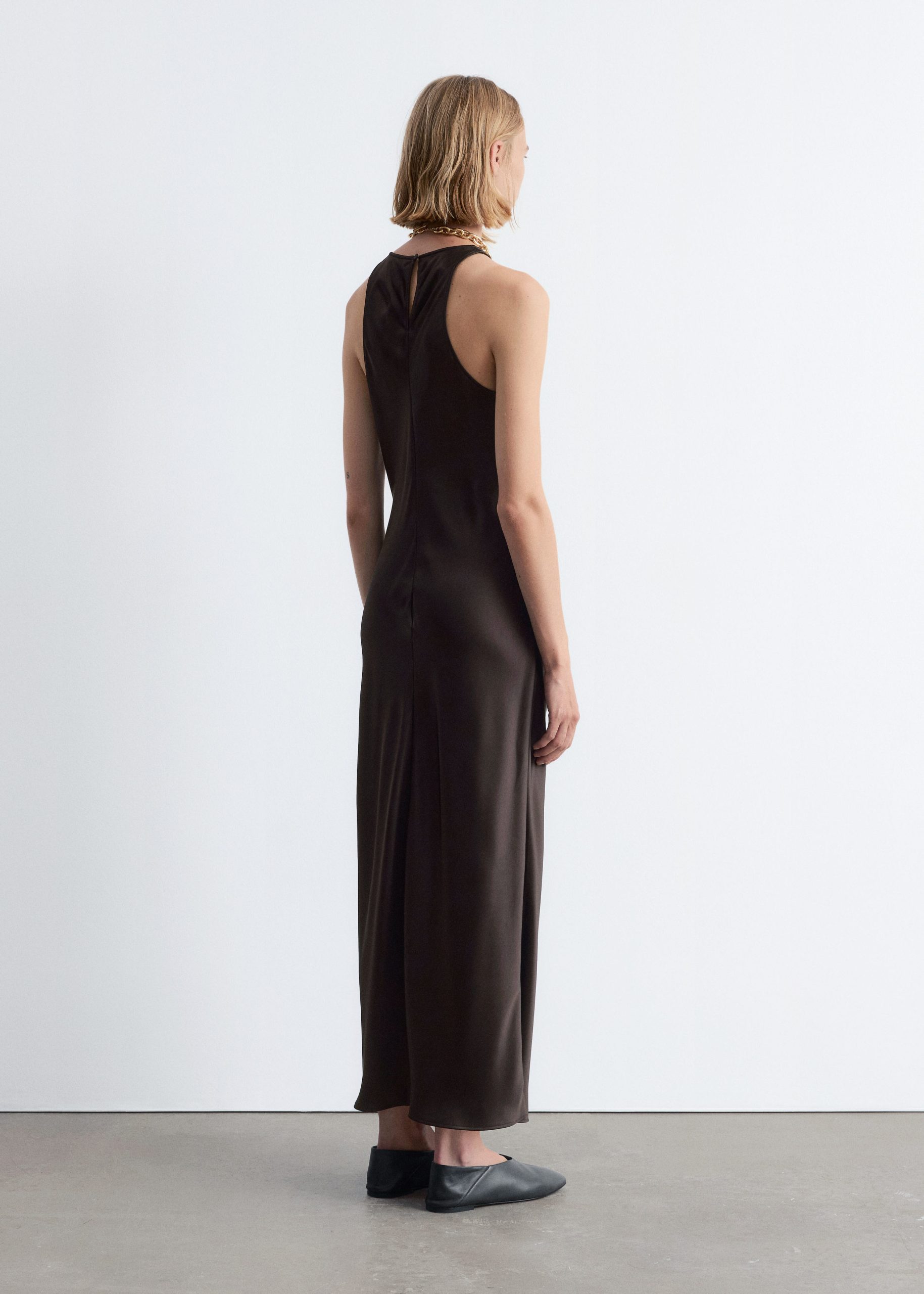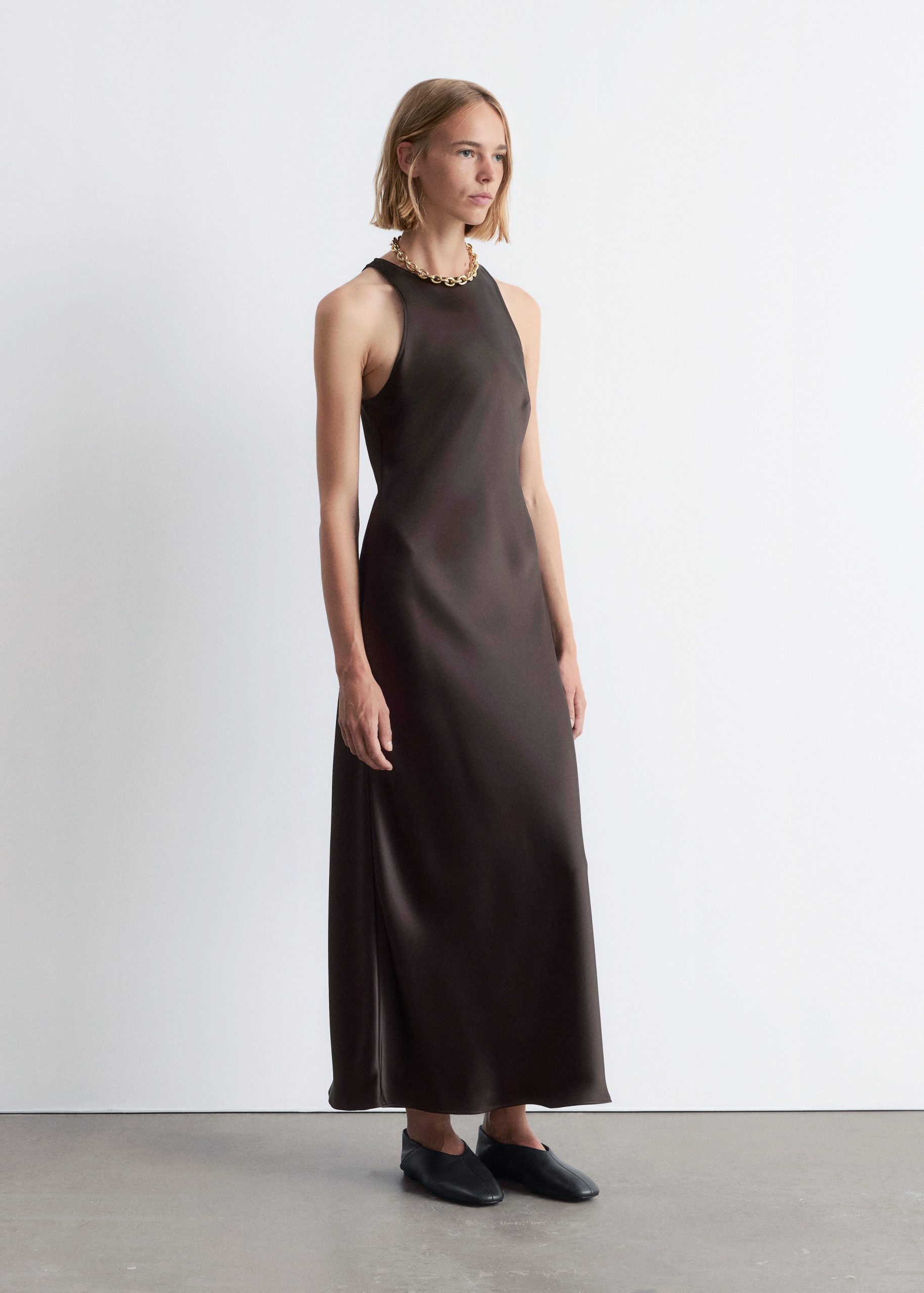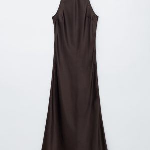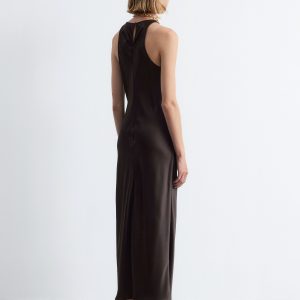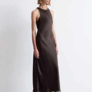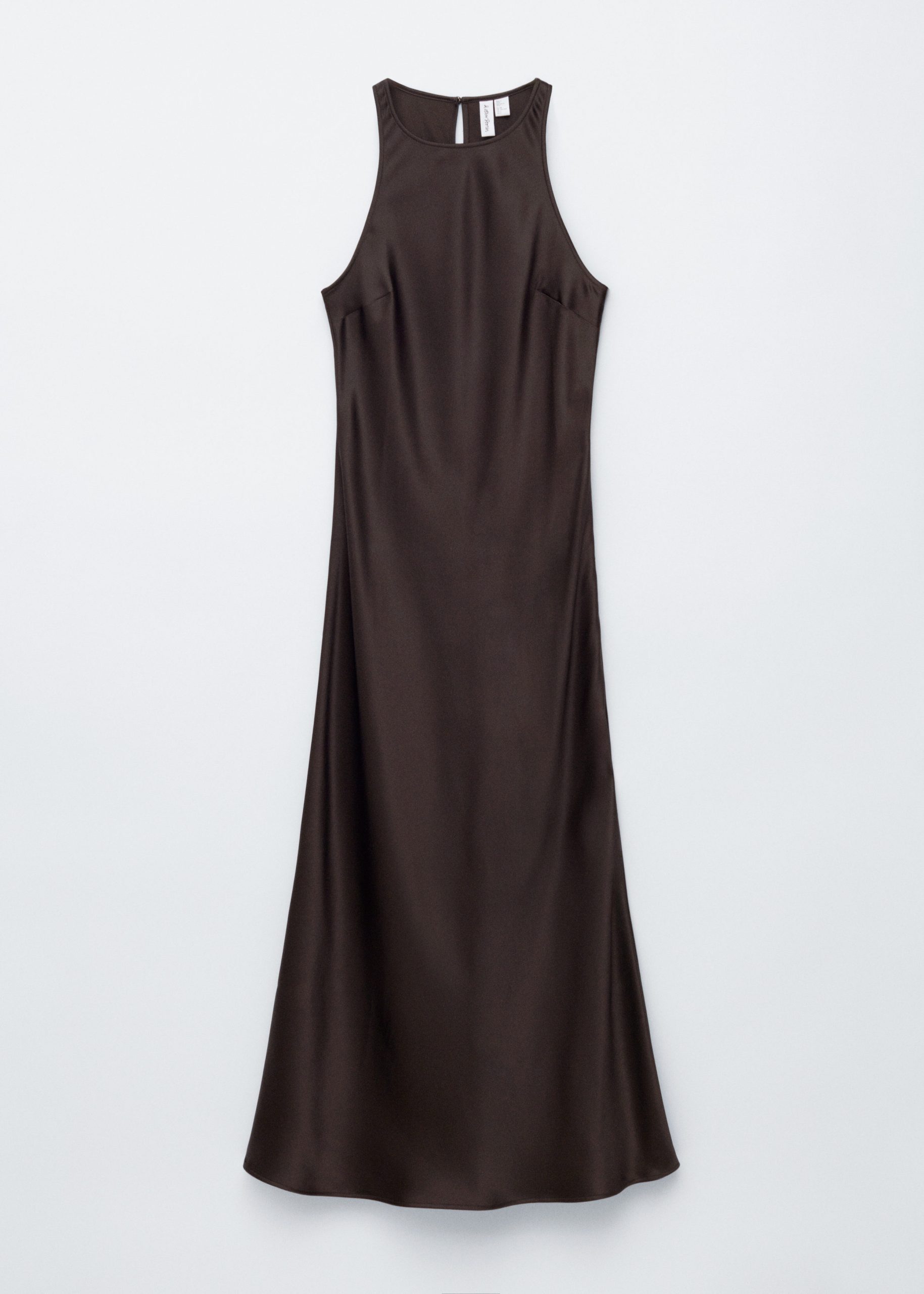 Sleeveless satin dress featuring a glossy, satin finish and a round neckline. Finished with a keyhole closure at the neck.