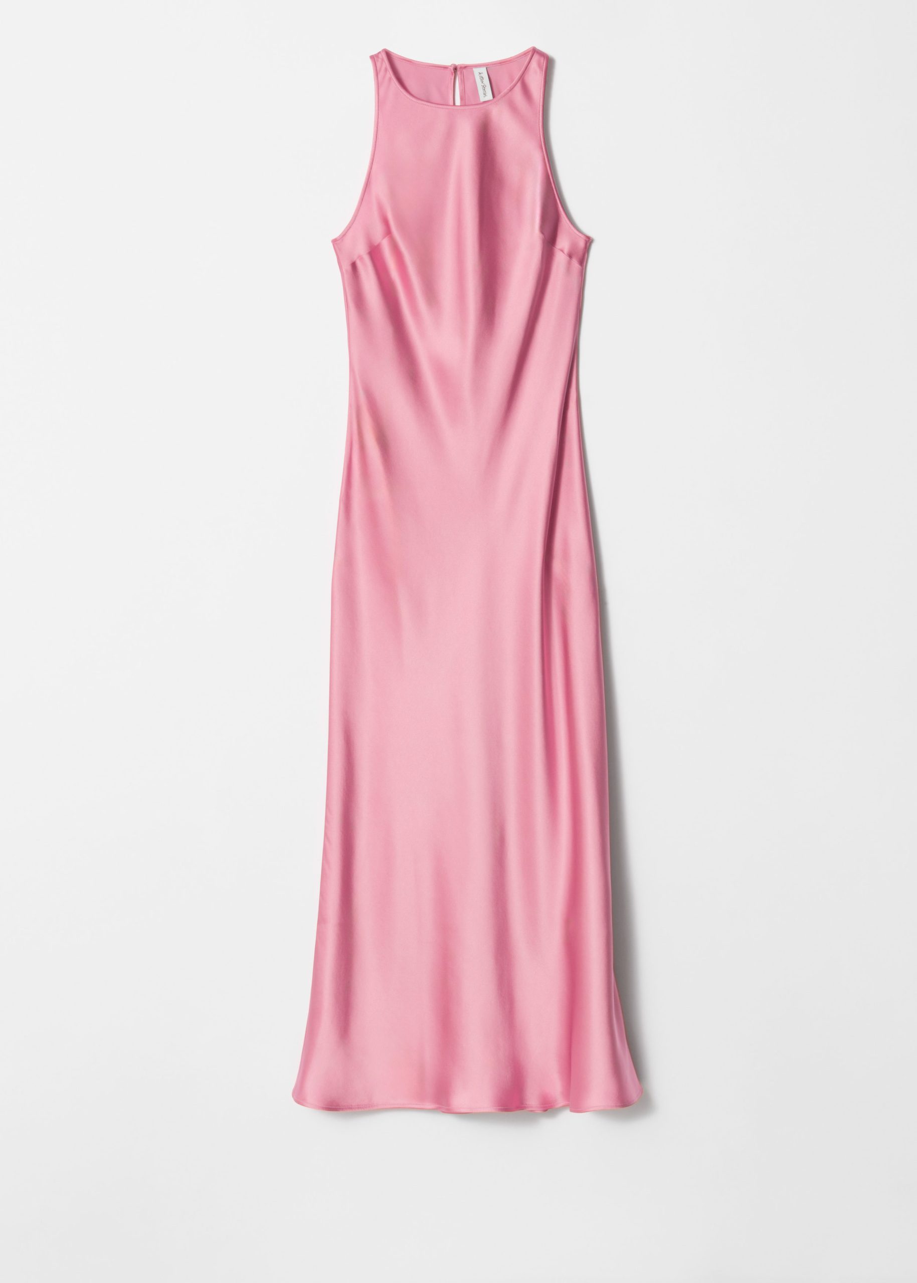 Sleeveless satin dress featuring a glossy, satin finish and a round neckline. Finished with a keyhole closure at the neck.