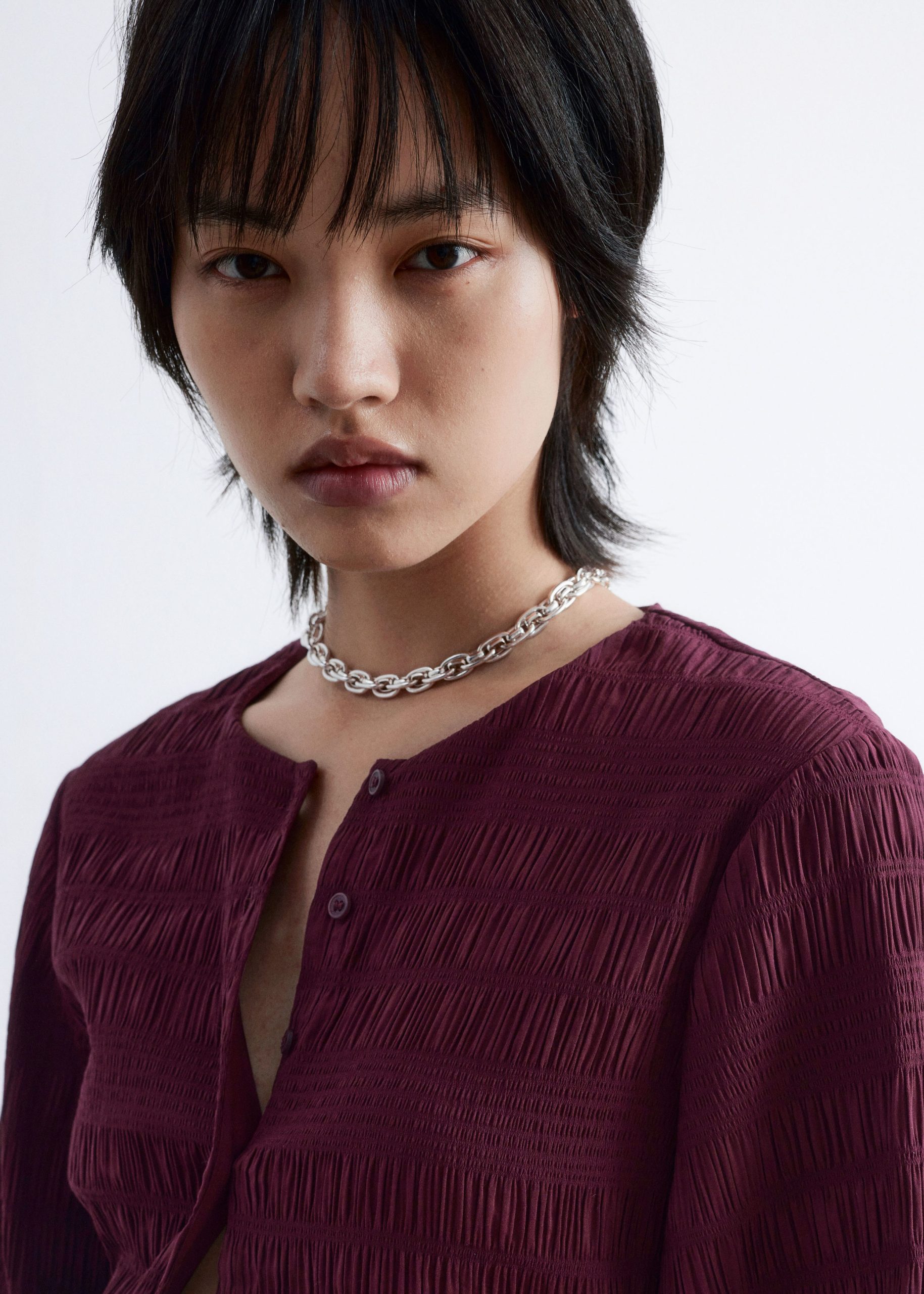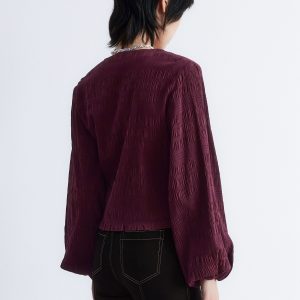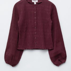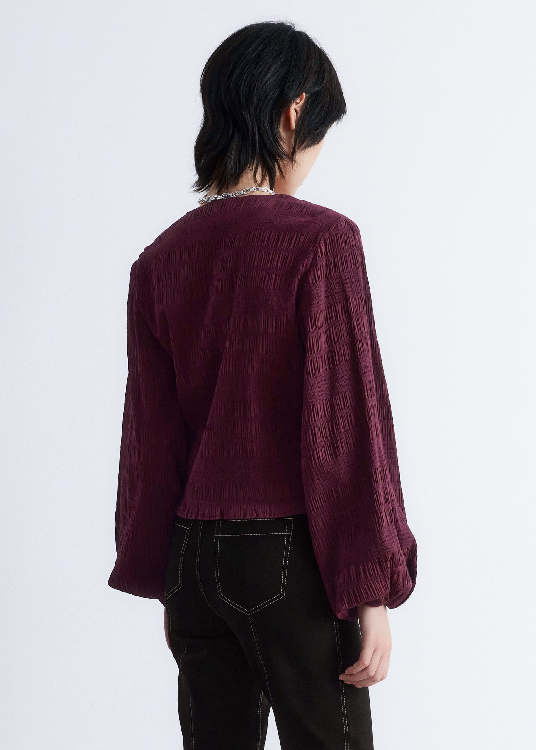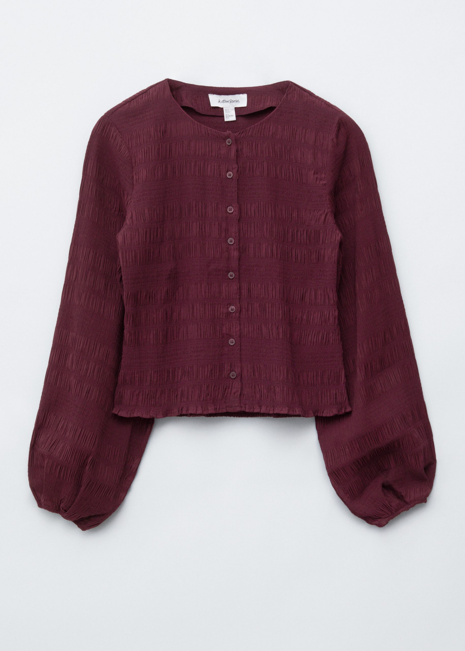 This top is crafted from a lightweight fabric with a smocked pattern, giving it a textured finish. It features a round neckline, voluminous balloon-sleeves with elasticated cuffs, and a button-through front. Wear it as a standalone blouse or layer it over t-shirts and tank tops as a light alternative to a cardigan.