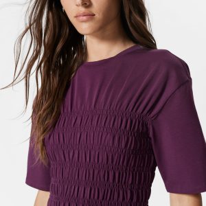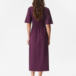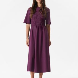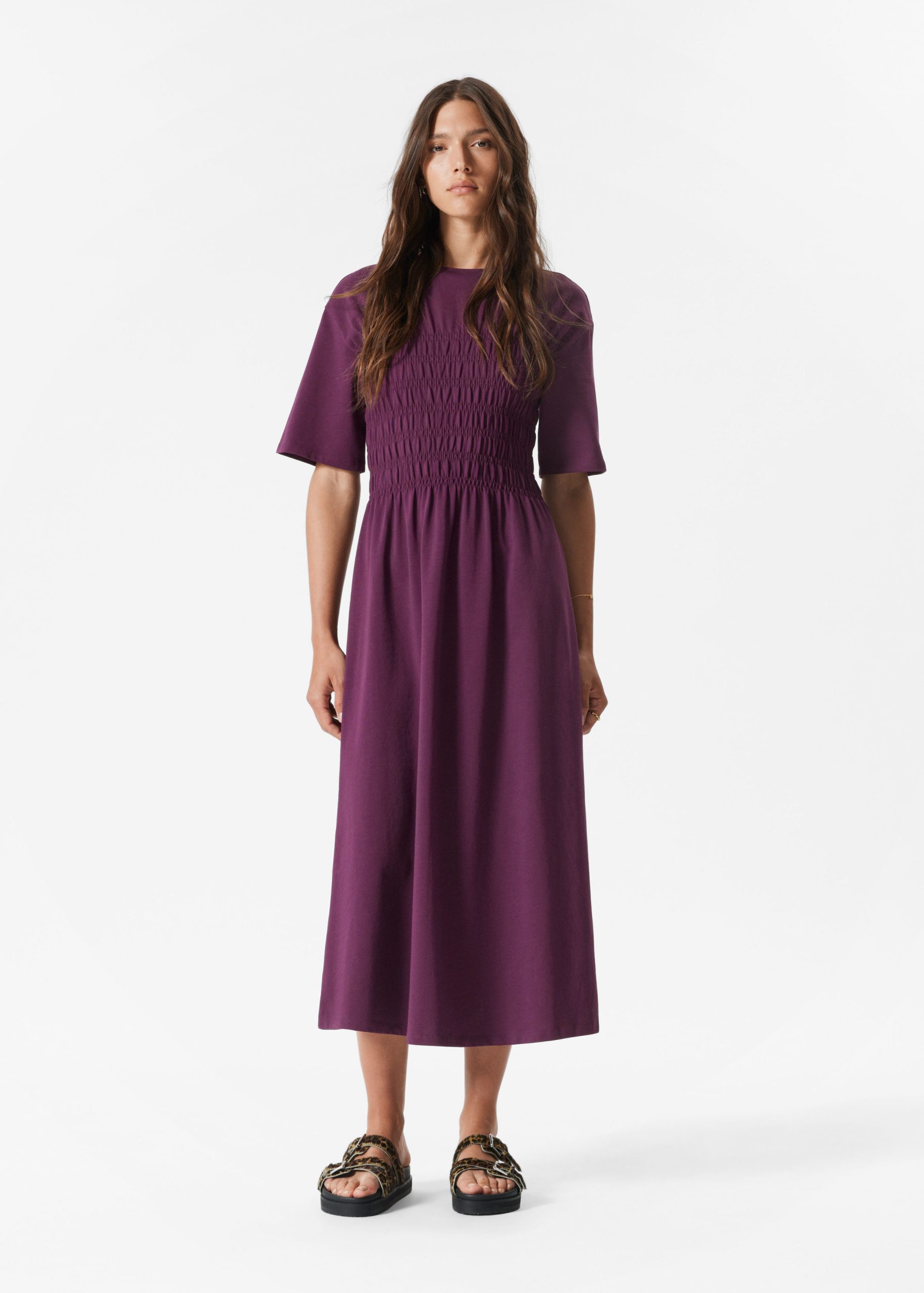 Midi dress crafted from a stretchy cotton jersey fabric. Designed in a relaxed t-shirt silhouette with a classic crewneck and short, wide sleeves that end at the elbow. Featuring a fitted waist with decorative smocking that shapes into a flared skirt with allover draped gathers.
