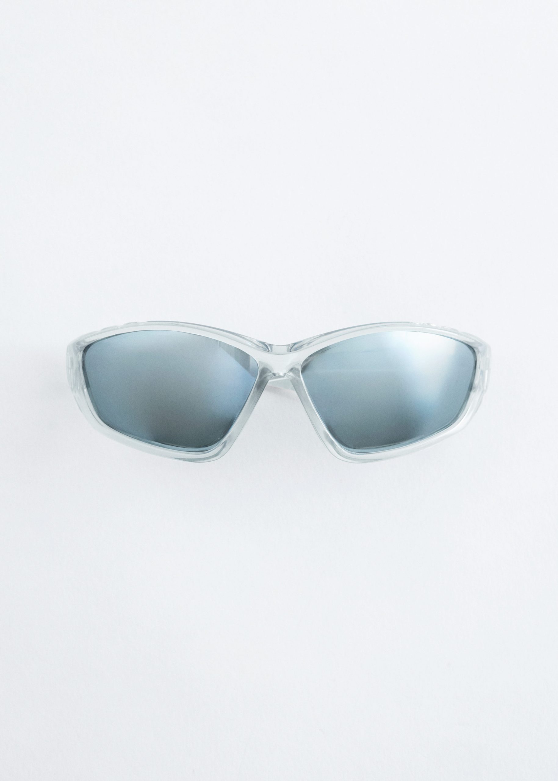 These sunglasses have a sporty feel, with elongated frames, mirrored lenses and temples that taper toward the ends.