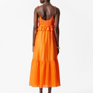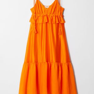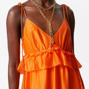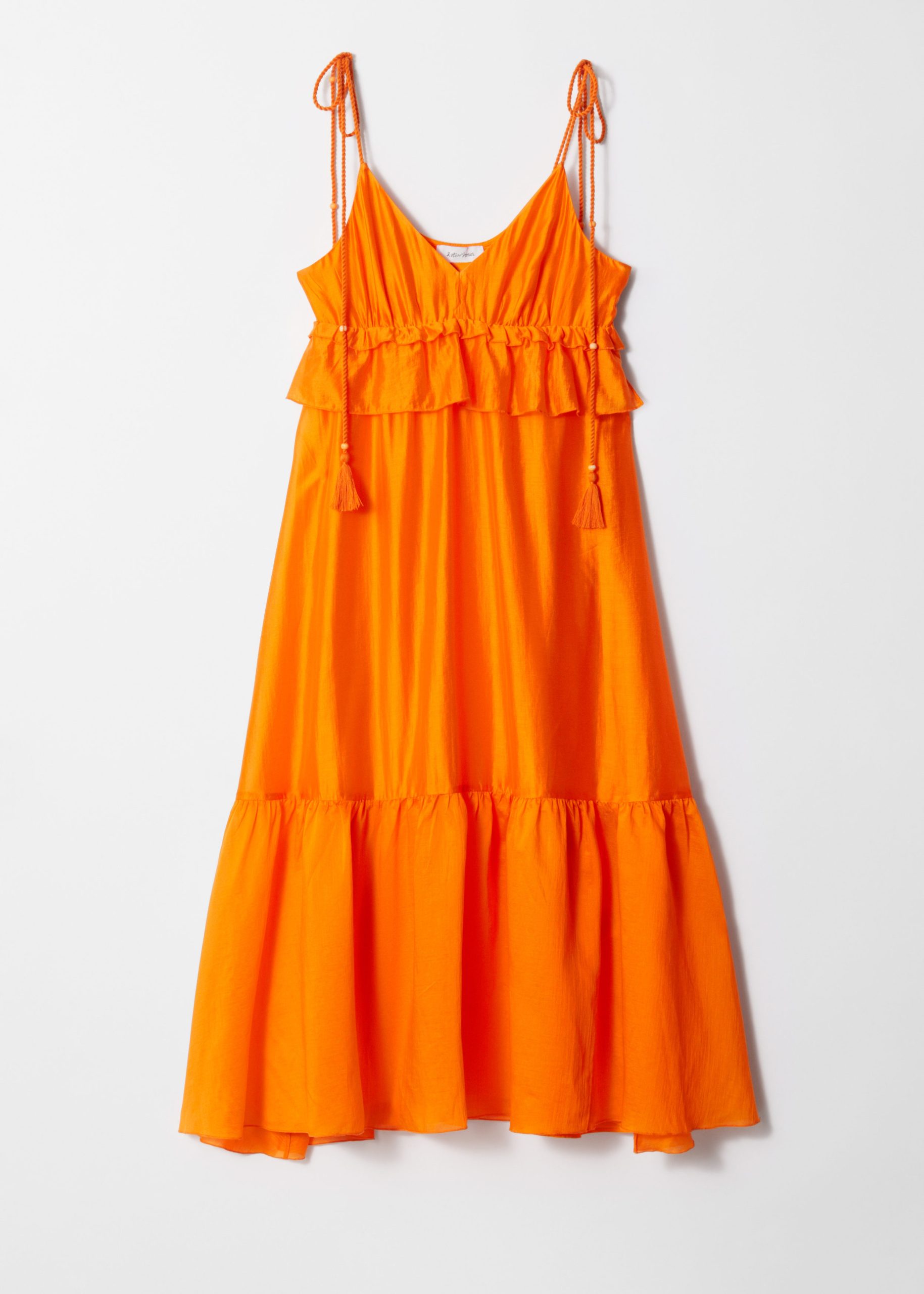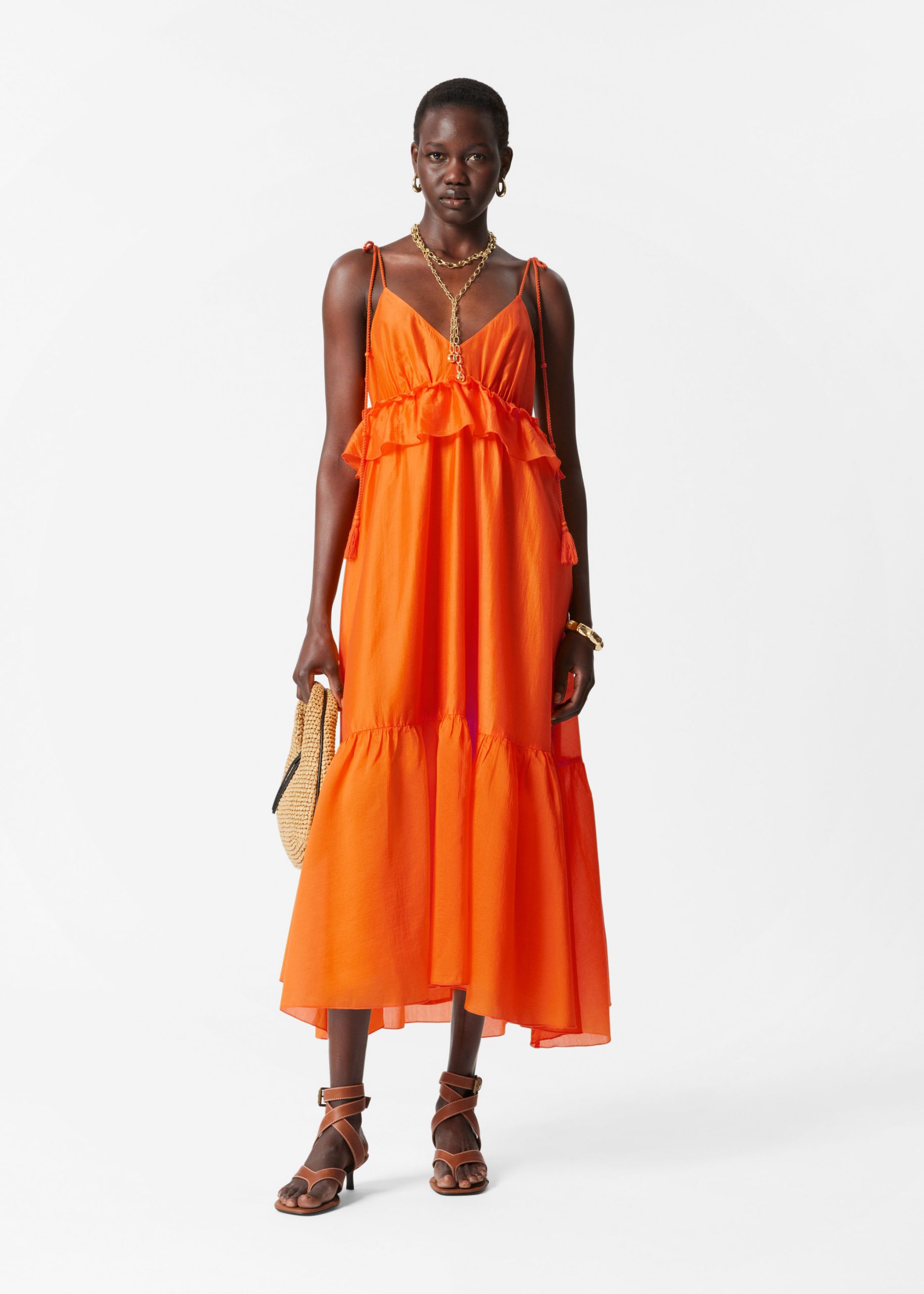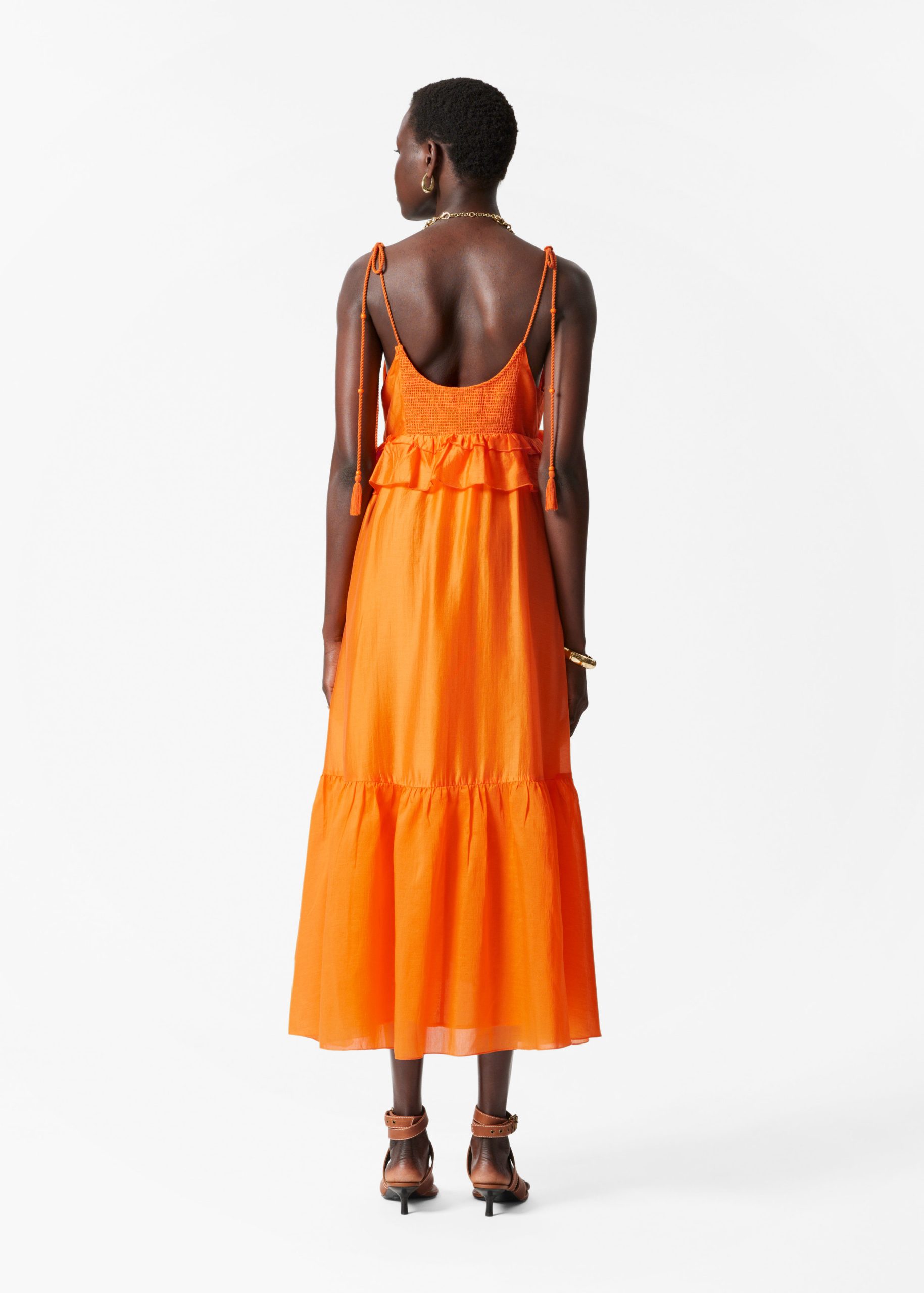 This breezy summer dress features a flowy silhouette with delicate shoulder cord ties and soft ruffle detailing at the bust and hem. Crafted from lightweight voile, it drapes effortlessly for a soft and fluid fit, while a smocked, elastic back adds comfort and subtle structure. Finished with playful tassel accents, it’s the perfect piece for warm-weather days and sun-soaked escapes.
