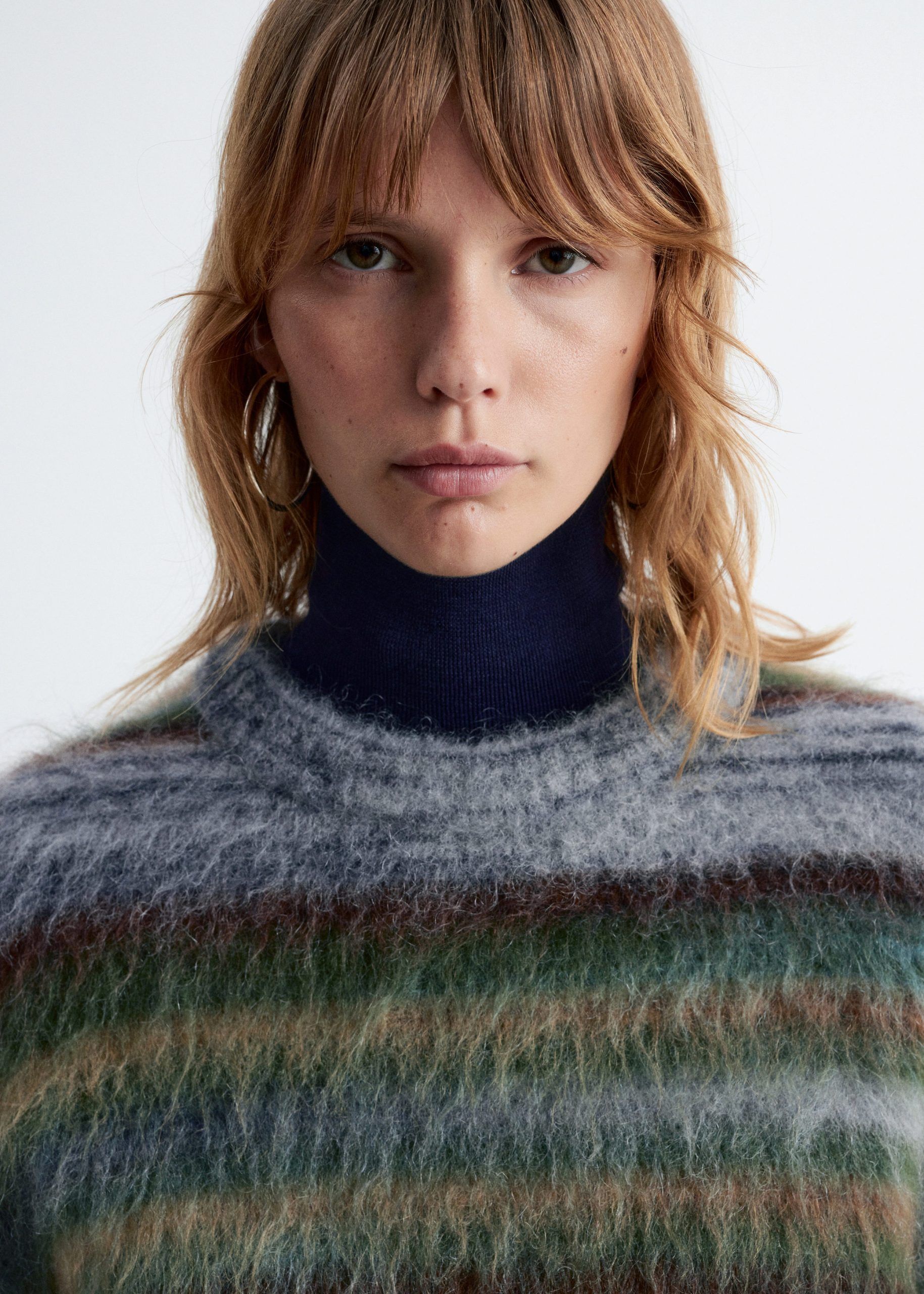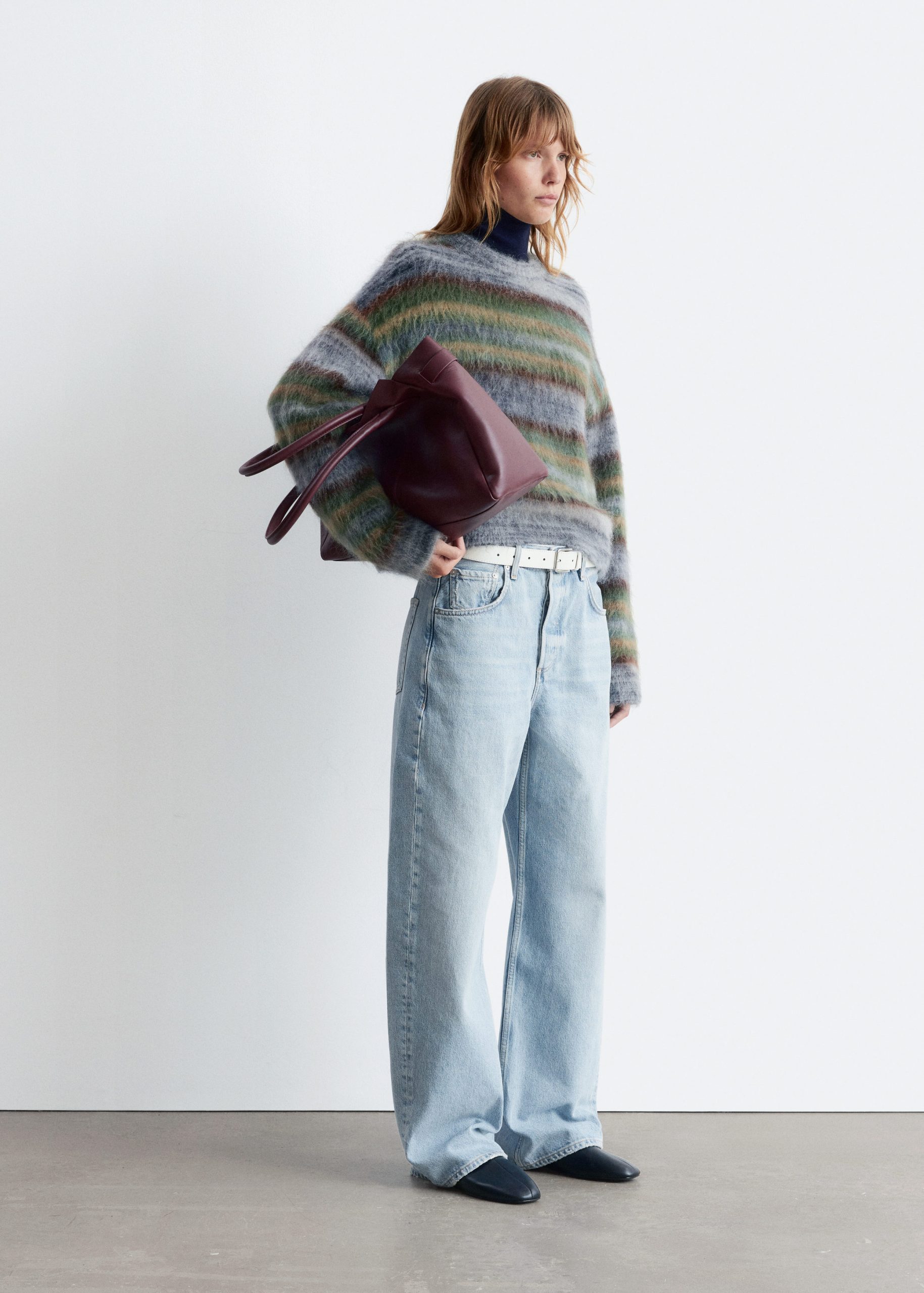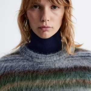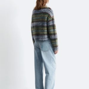Knitted from a mohair and wool blend with a brushed, tacile finish, this sweater features a round neckline, ribbed trims, and all-over horizontal stripes in contrasting colours.