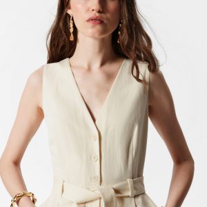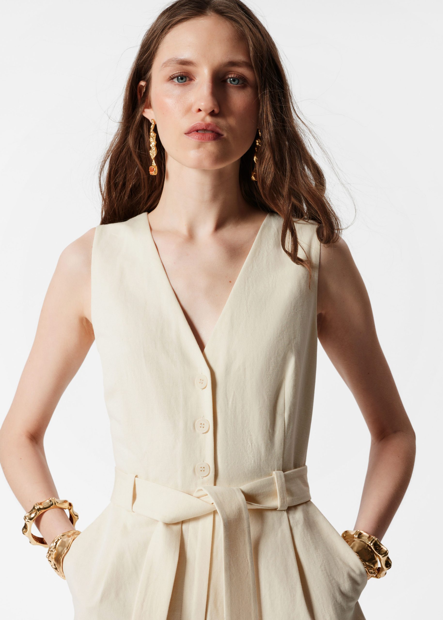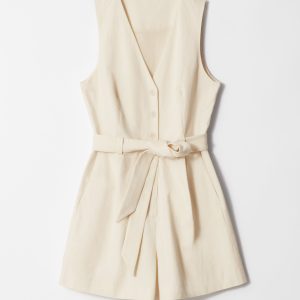 Designed for the warmer city months, this sleeveless playsuit is crafted from 100% pure cotton, offering a lightweight and breathable feel. Cut in a tailored suit-inspired silhouette, it features a classic v-neckline and a tonal fabric belt at the waist. Completed with buttons down the front, a concealed zipper, and dual welt pockets at the back.Â