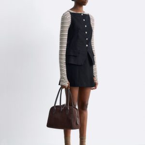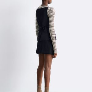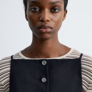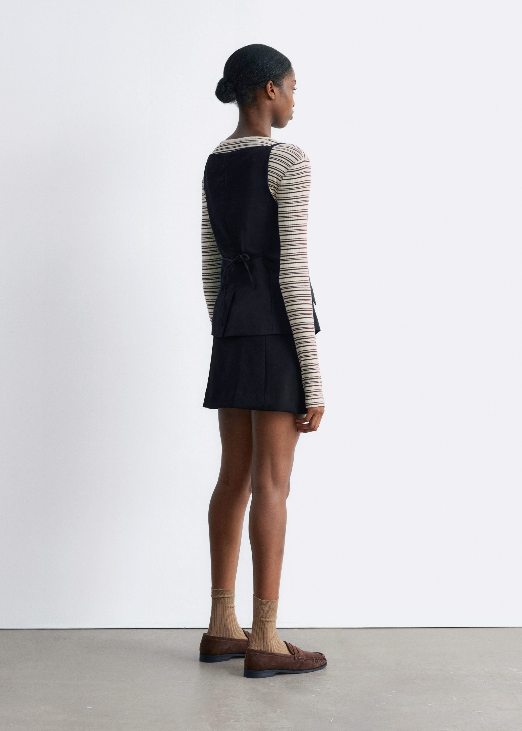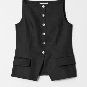Tailored vest top featuring thin straps, a square neckline, and decorative duo flap pockets. Traced with six button closures, and a self-tie detail at the back.