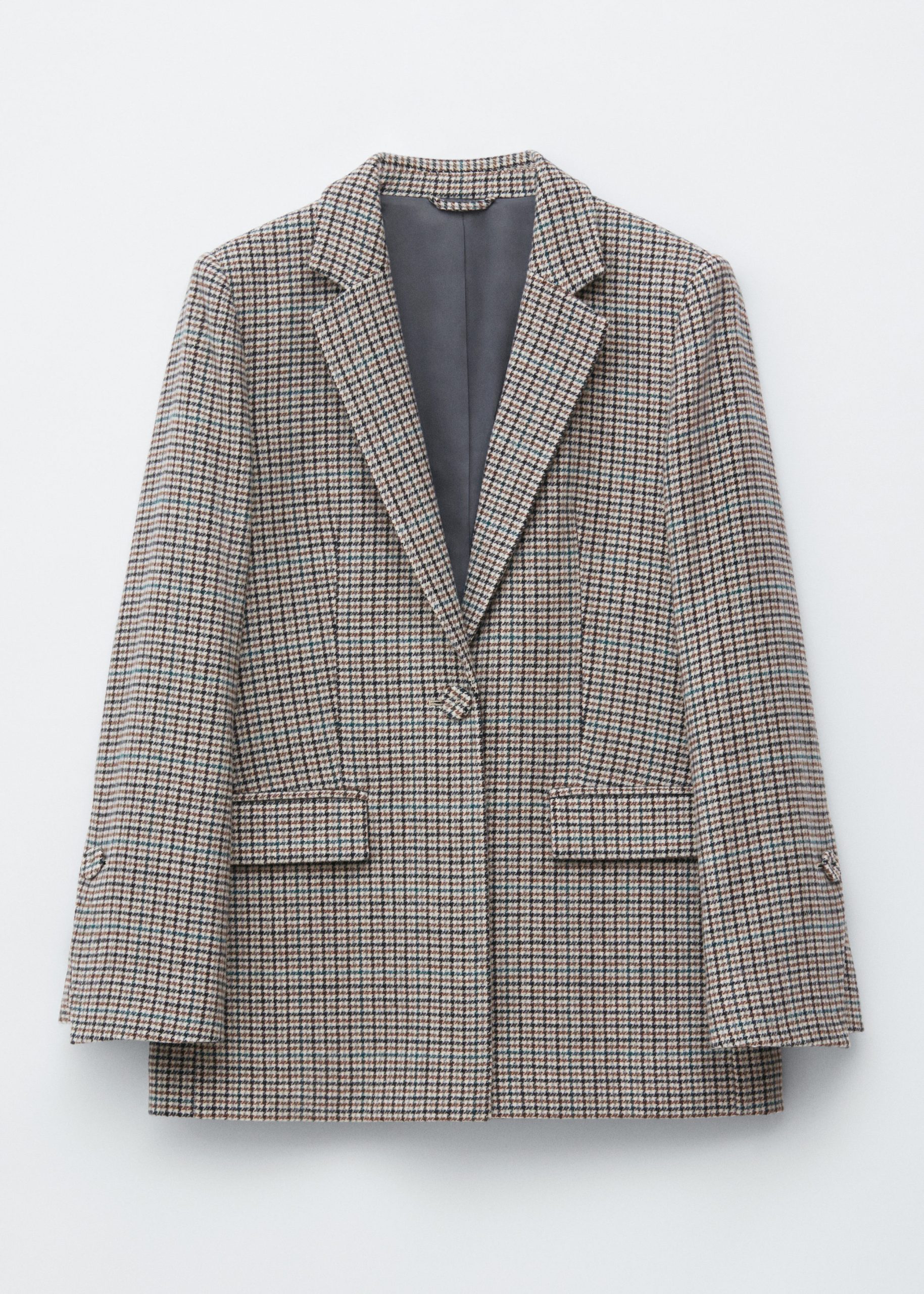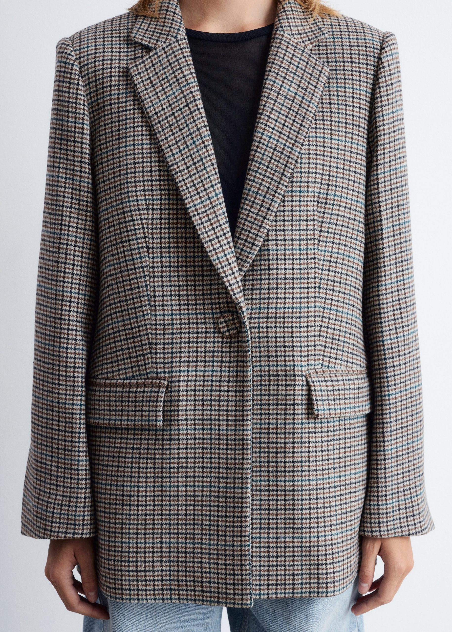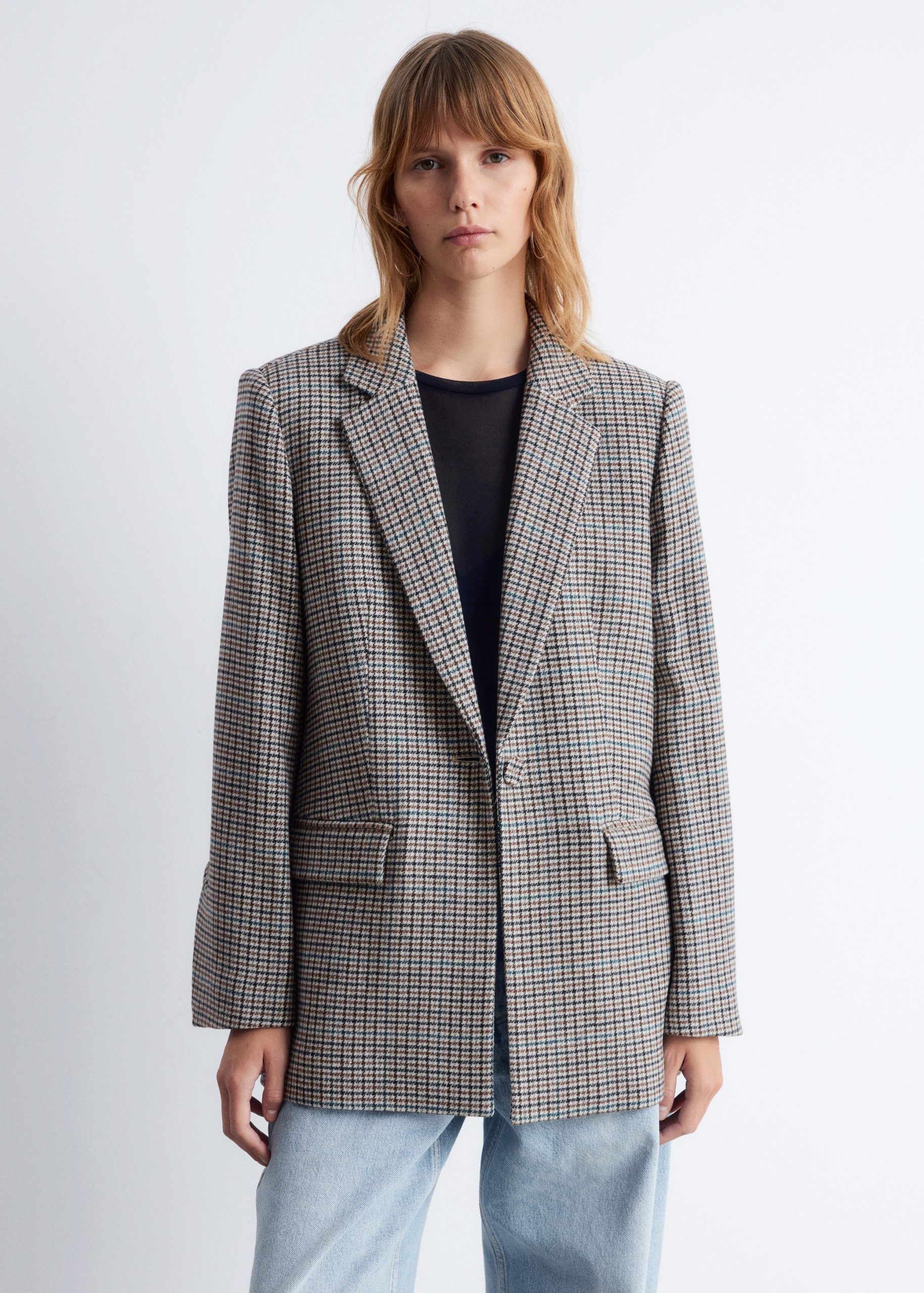 This blazer is crafted from a wool blend and cut in a clean, straight silhouette. It features notch lapels, structured shoulder pads, dual flap pockets at the front, and a single button closure. Finished with a subtle back vent, and buttoned cuffs with delicate slits.