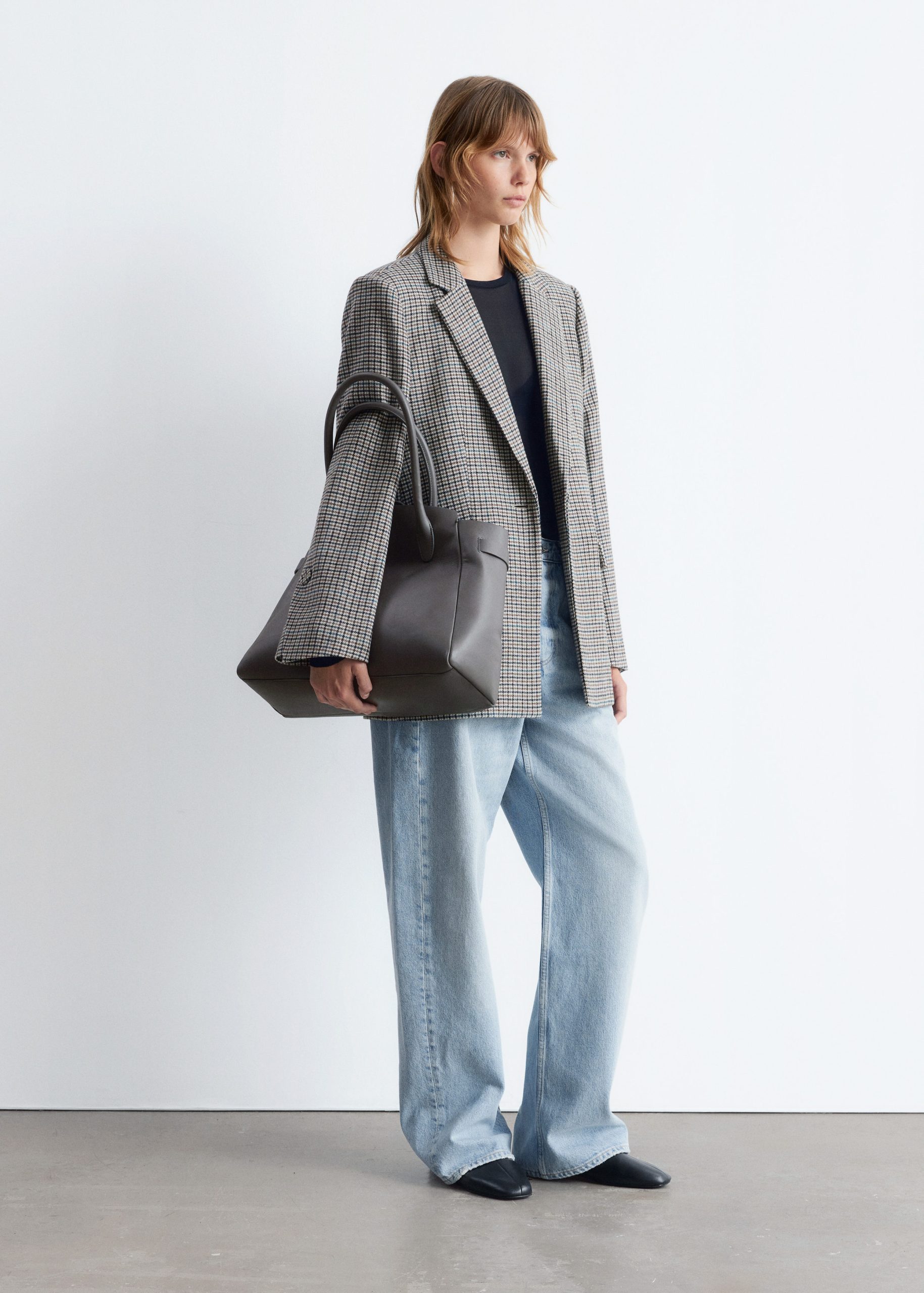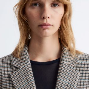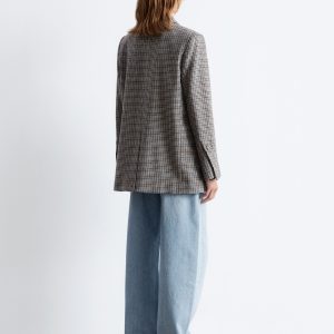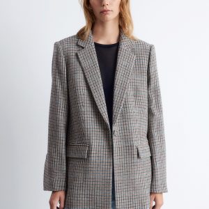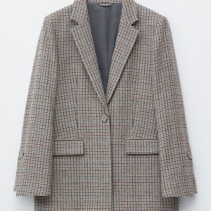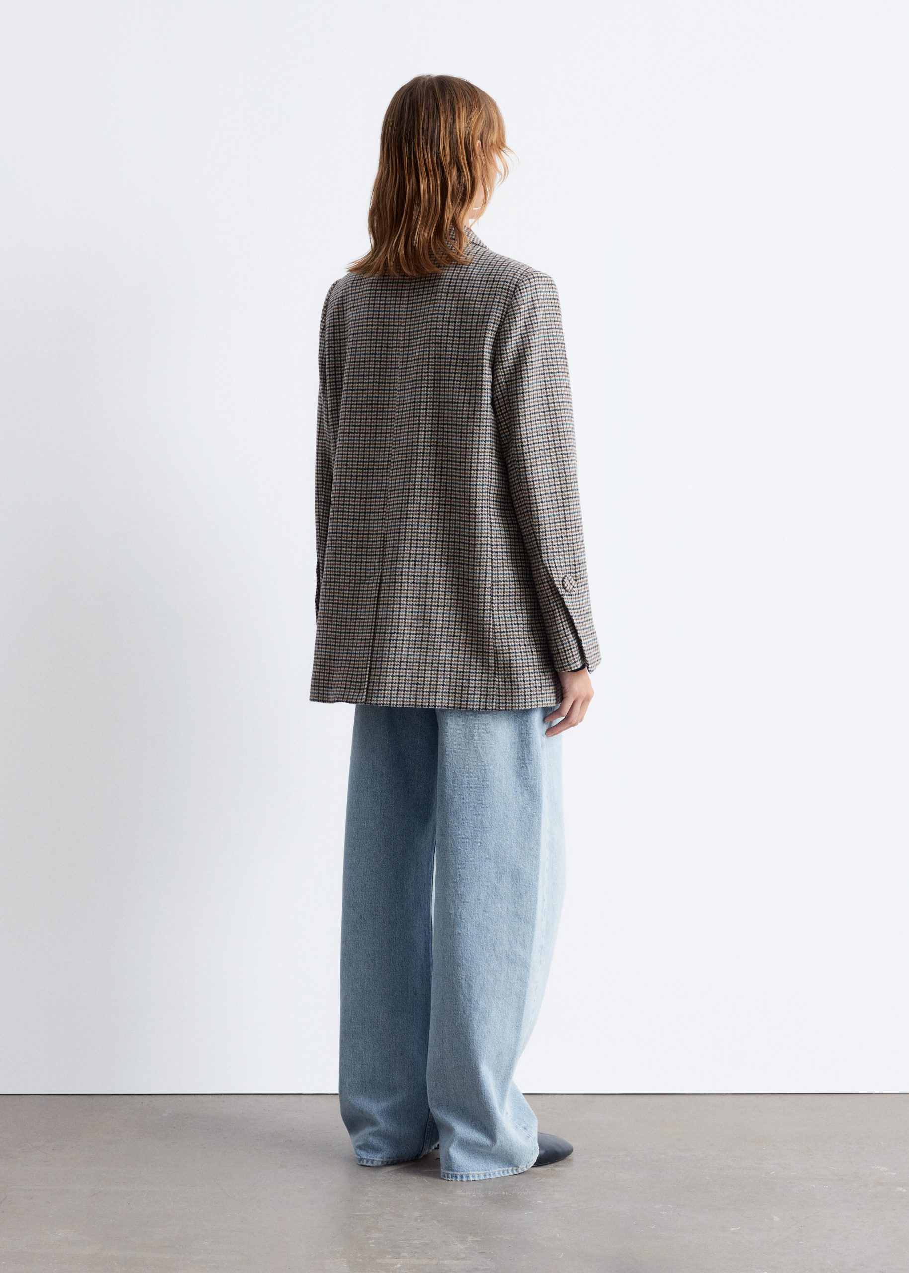 This blazer is crafted from a wool blend and cut in a clean, straight silhouette. It features notch lapels, structured shoulder pads, dual flap pockets at the front, and a single button closure. Finished with a subtle back vent, and buttoned cuffs with delicate slits.