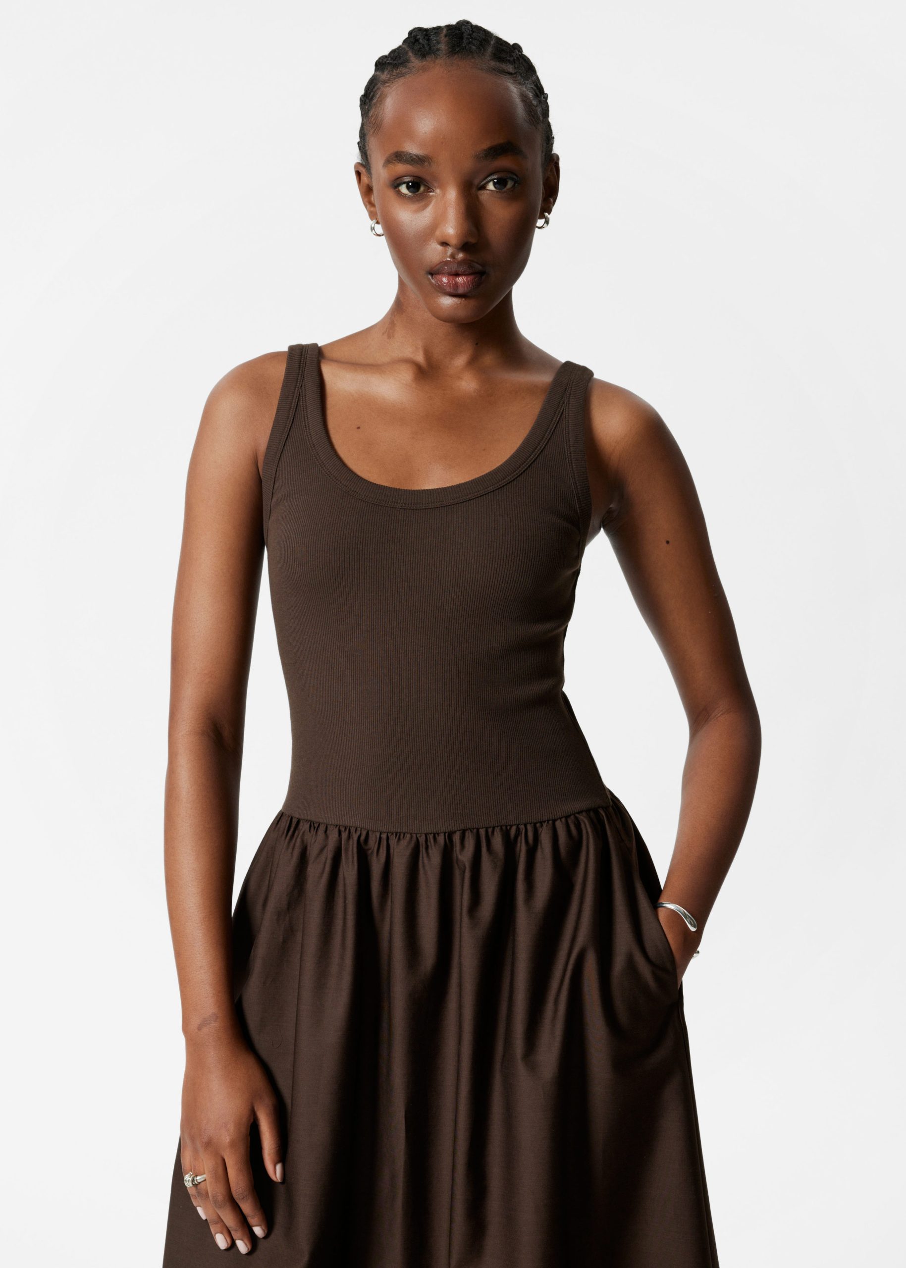 Jersey tank midi dress that gently flares at the waistline.