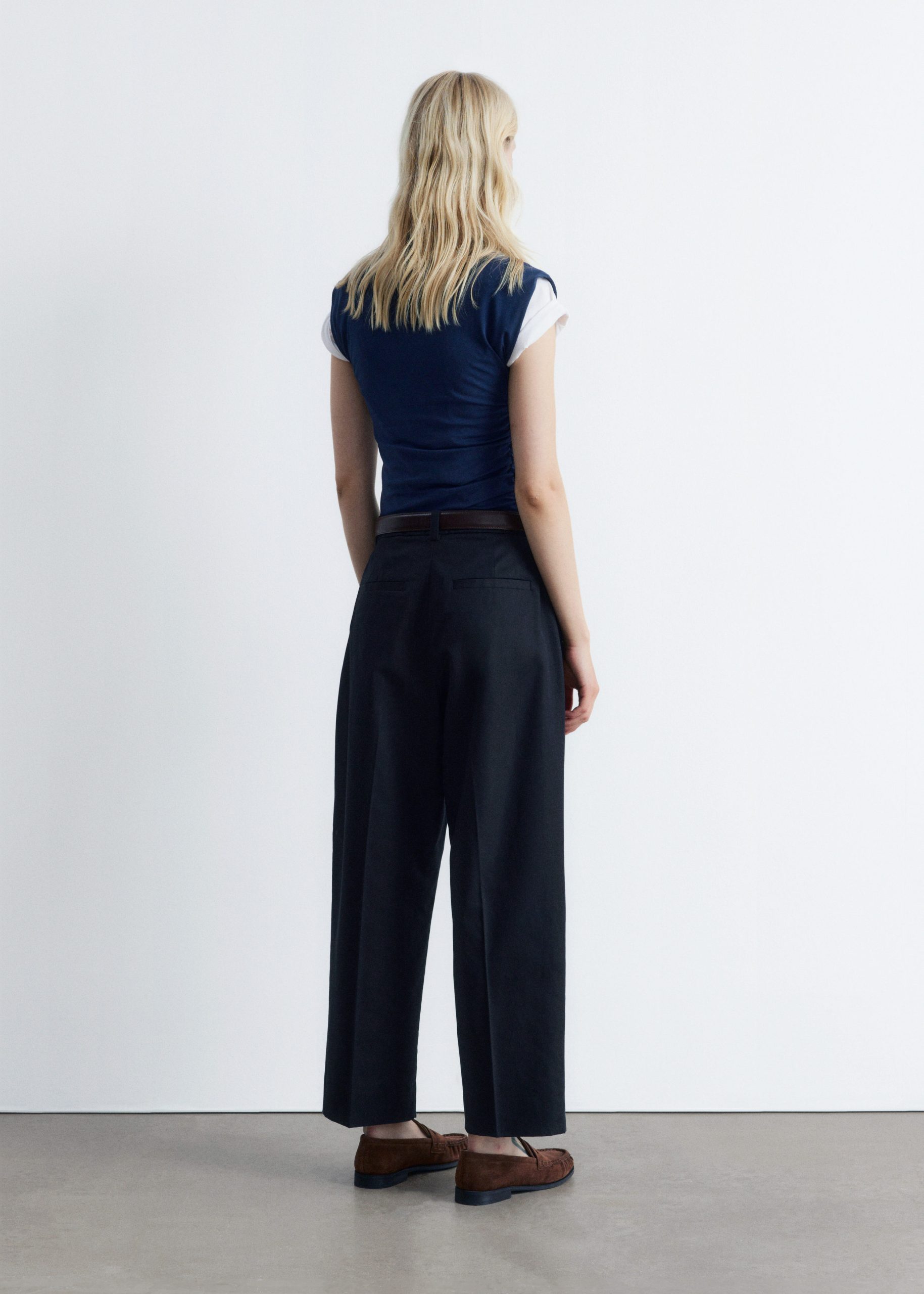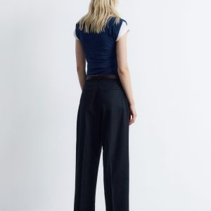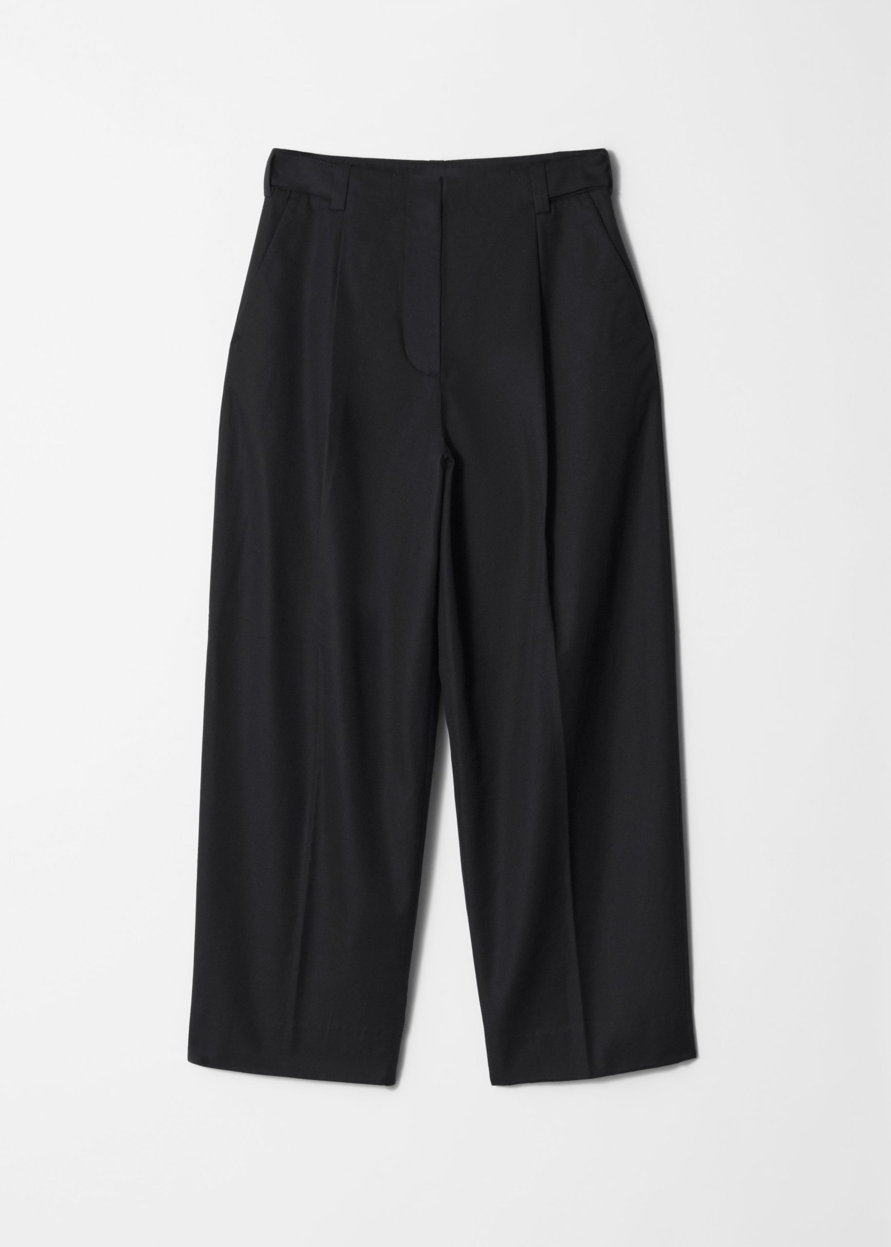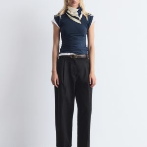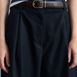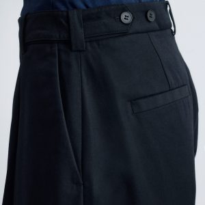 These trousers are crafted from a lightweight cotton-blend. Cut at ankle length, they feature tapered legs accented by sharp press-creases for a clean, tailored look. Finished with a zipper with hook-and-bar closure, dual welt pockets at the back, and a built-in belt with buttoned tabs.