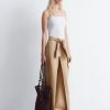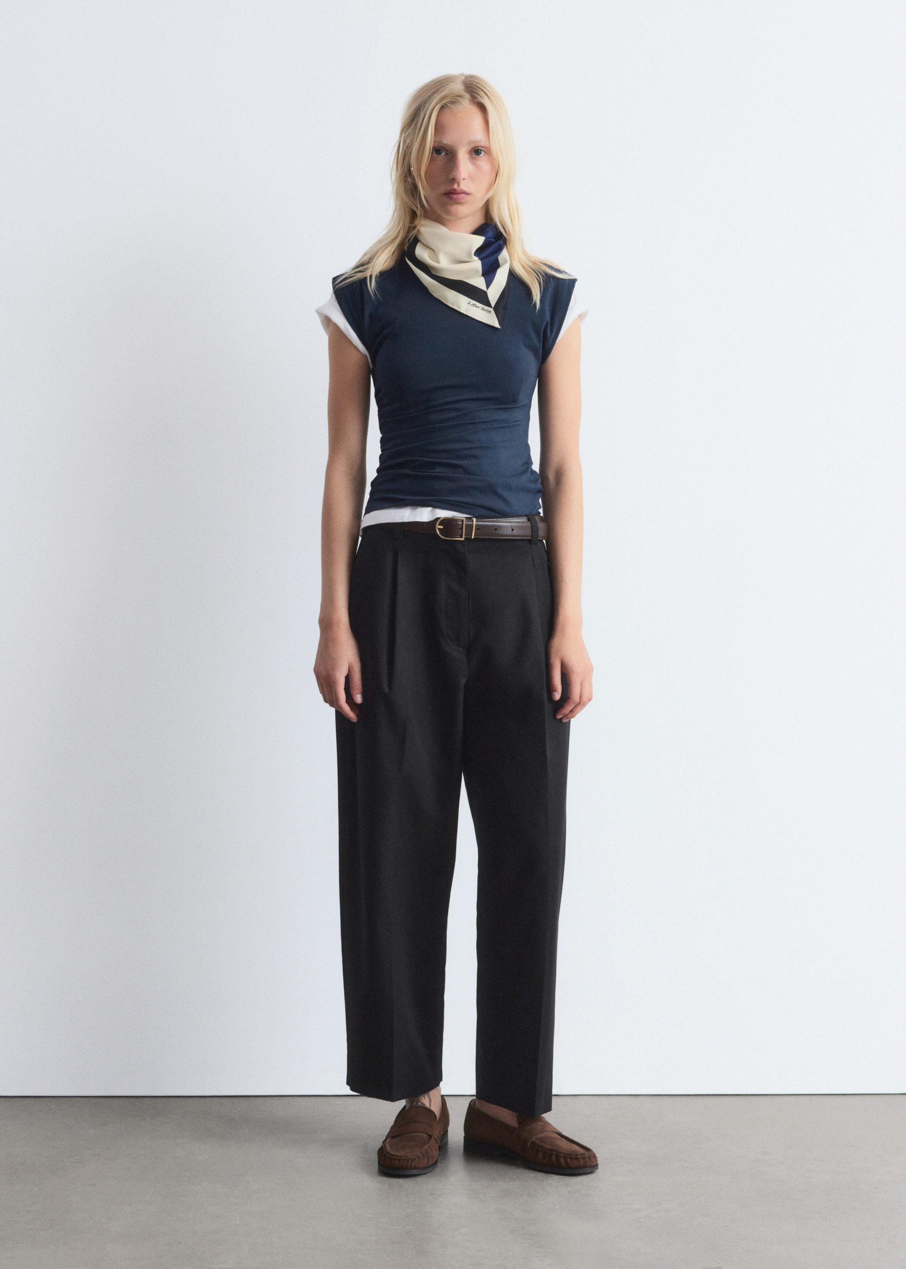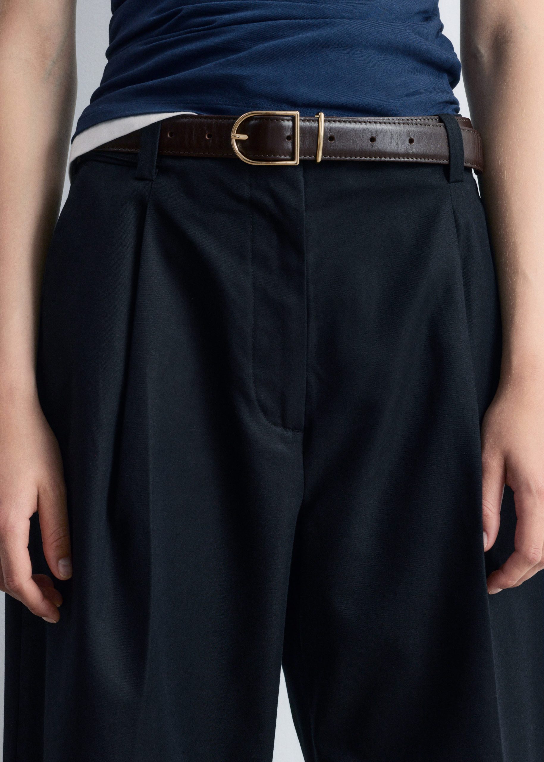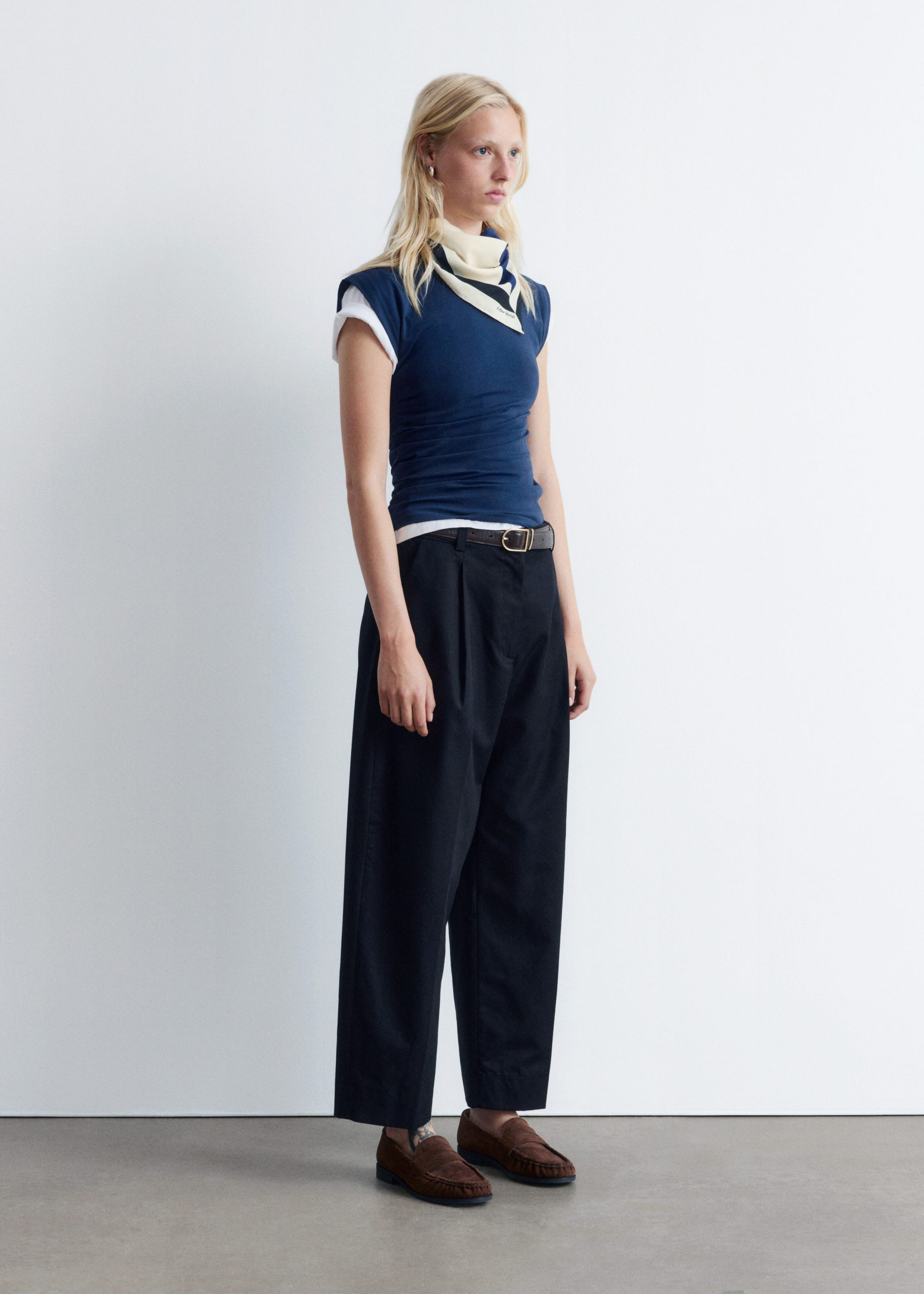 These trousers are crafted from a lightweight cotton-blend. Cut at ankle length, they feature tapered legs accented by sharp press-creases for a clean, tailored look. Finished with a zipper with hook-and-bar closure, dual welt pockets at the back, and a built-in belt with buttoned tabs.