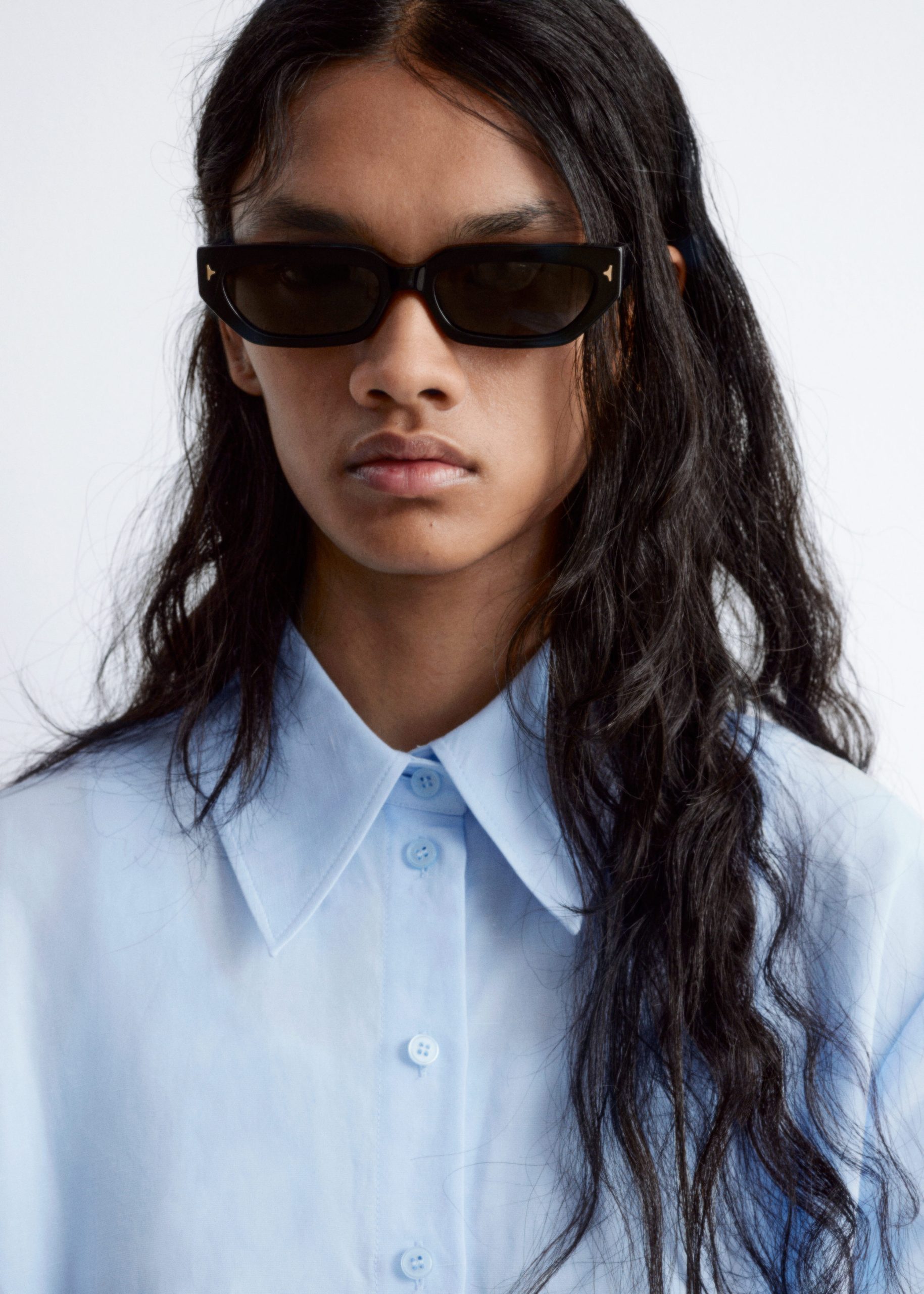 Long-sleeve shirt designed with a classic turn-down collar and a tapered waist with detailed pleats. Featuring a front placket traced with buttons.