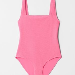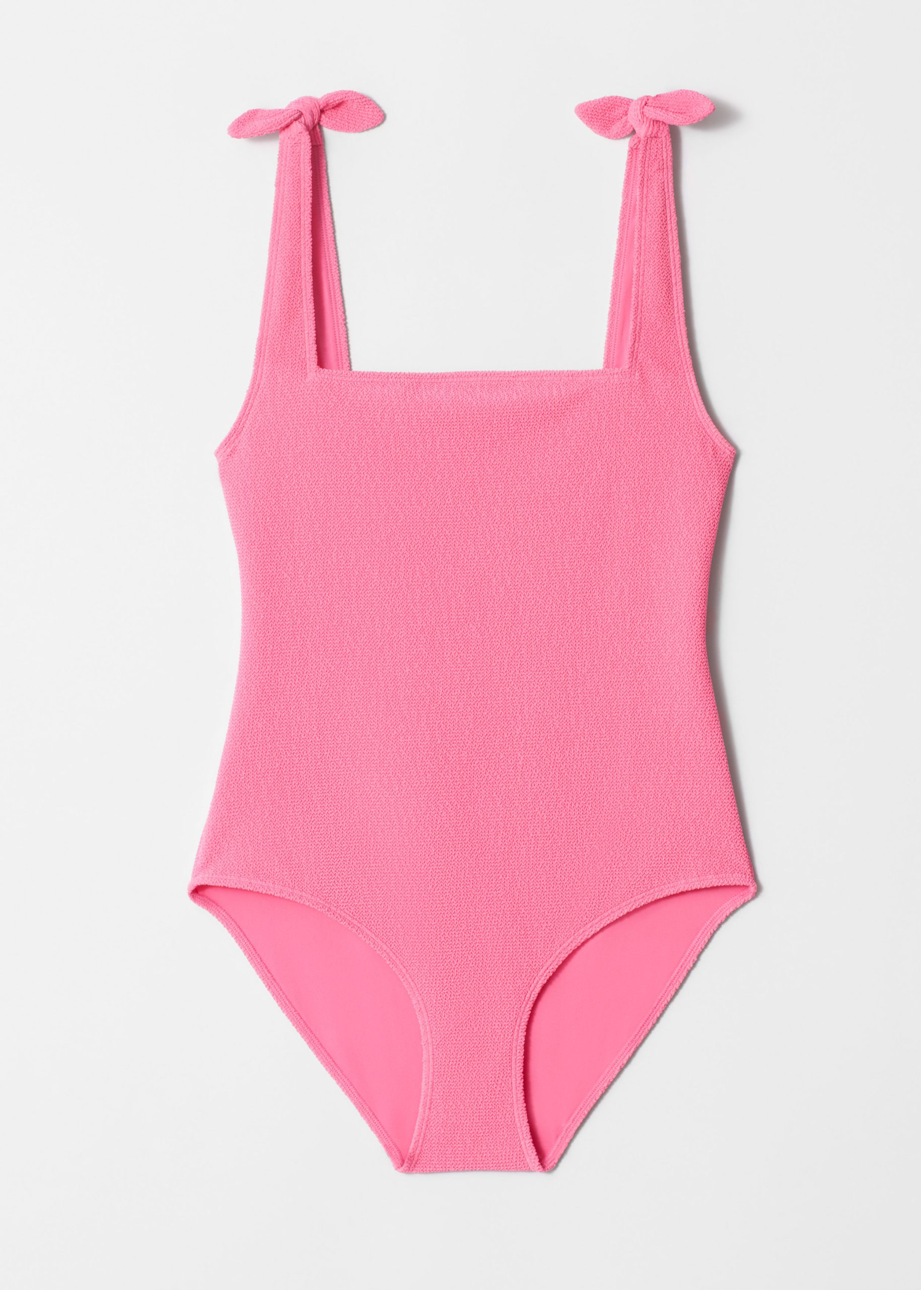 Textured one-piece swimsuit featuring decorative bow ties at the shoulders and a squared neckline.