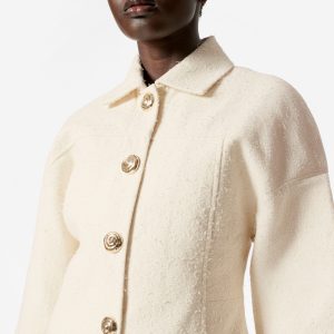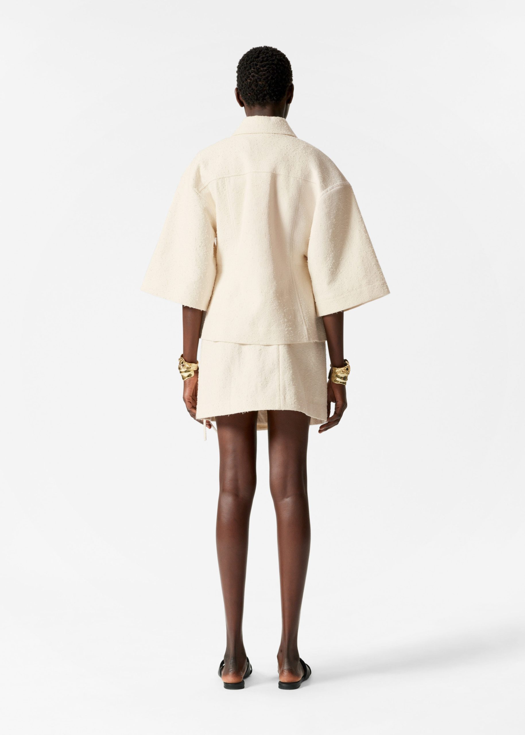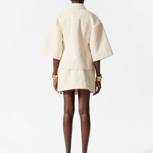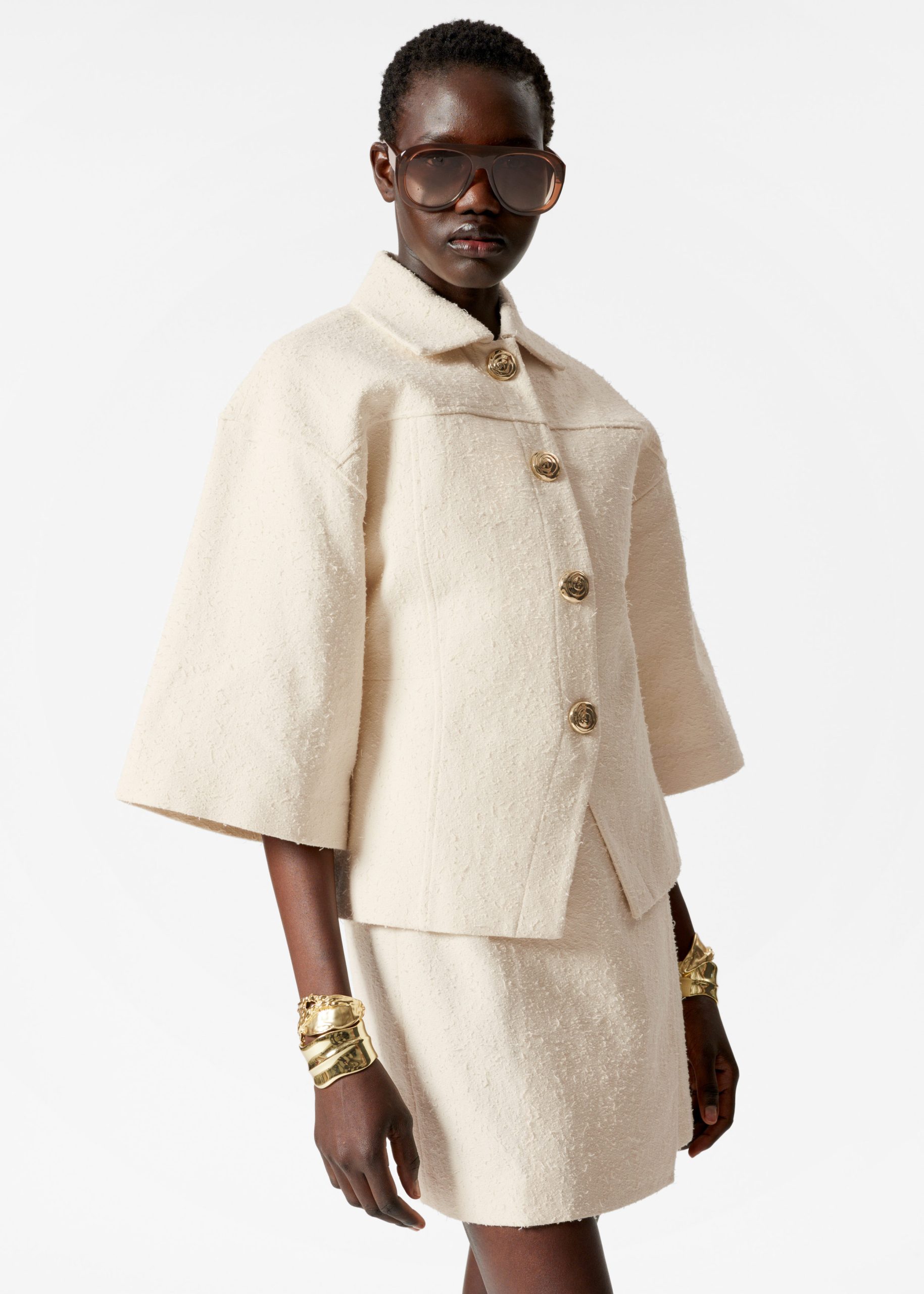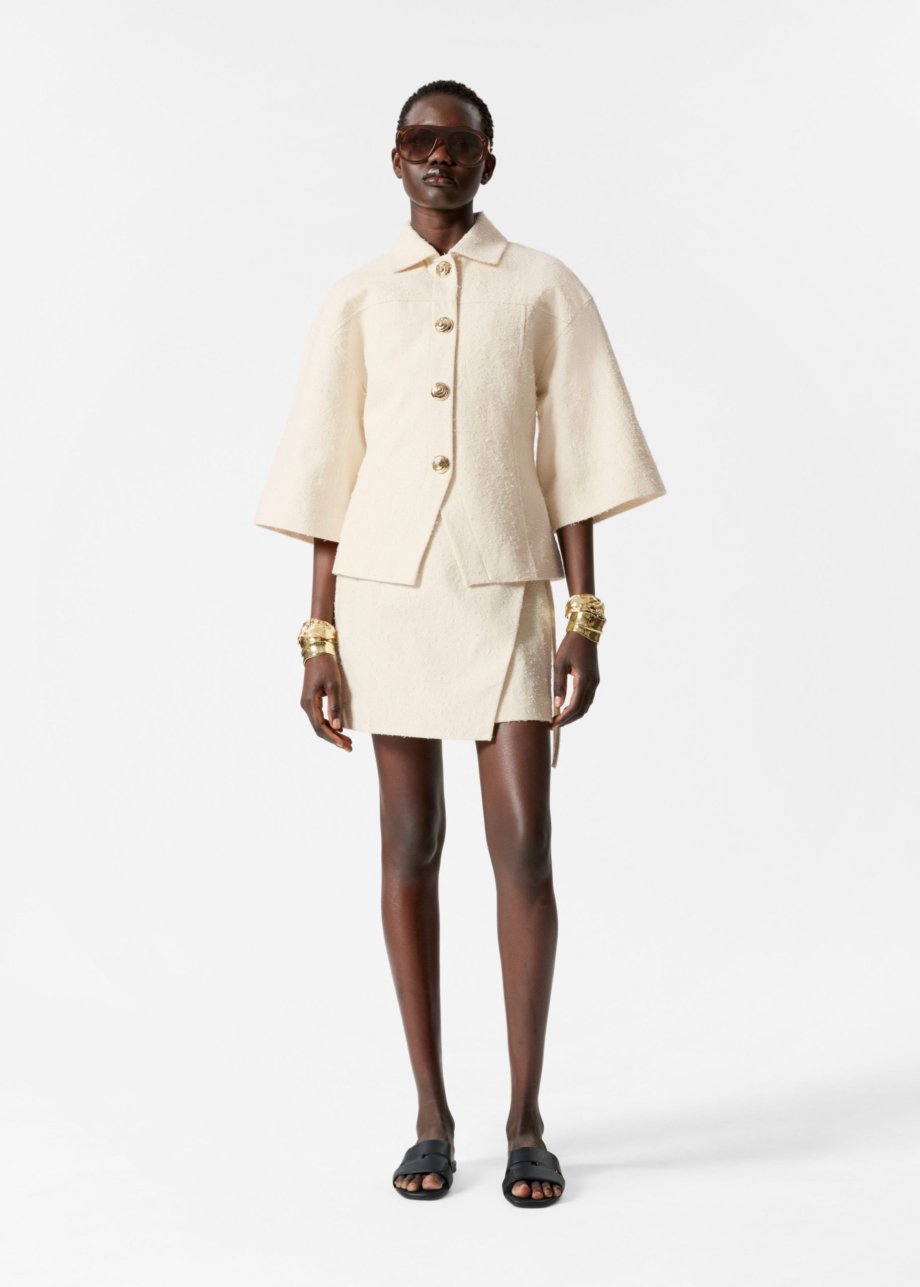 This jacket can function as a statement top or an indoor shirt jacket, making it a versatile piece in your wardrobe. Crafted from a sturdy cotton blend, featuring a brushed, textured finish and detailed with topstitched seams. It’s cut in a structured silhouette with a cinched waist and wide, three-quarter sleeves, and traced with large gold-plated buttons down the front. Pair with the matching mini skirt for an elevated co-ord look.