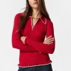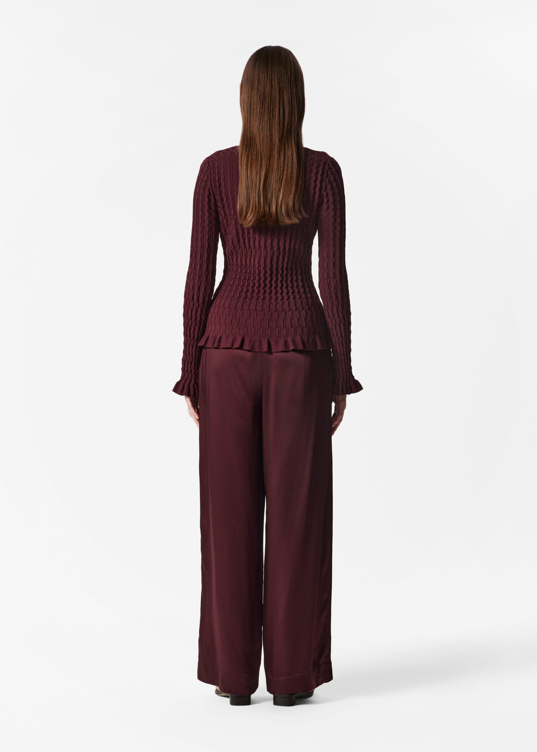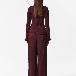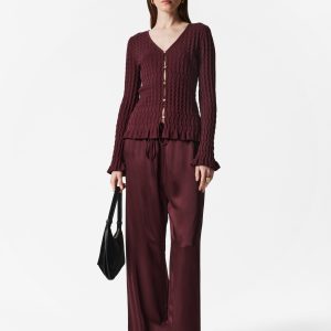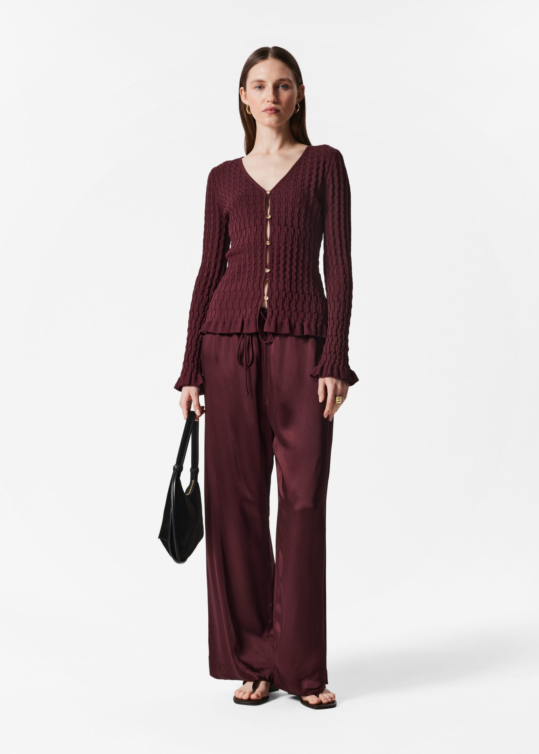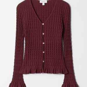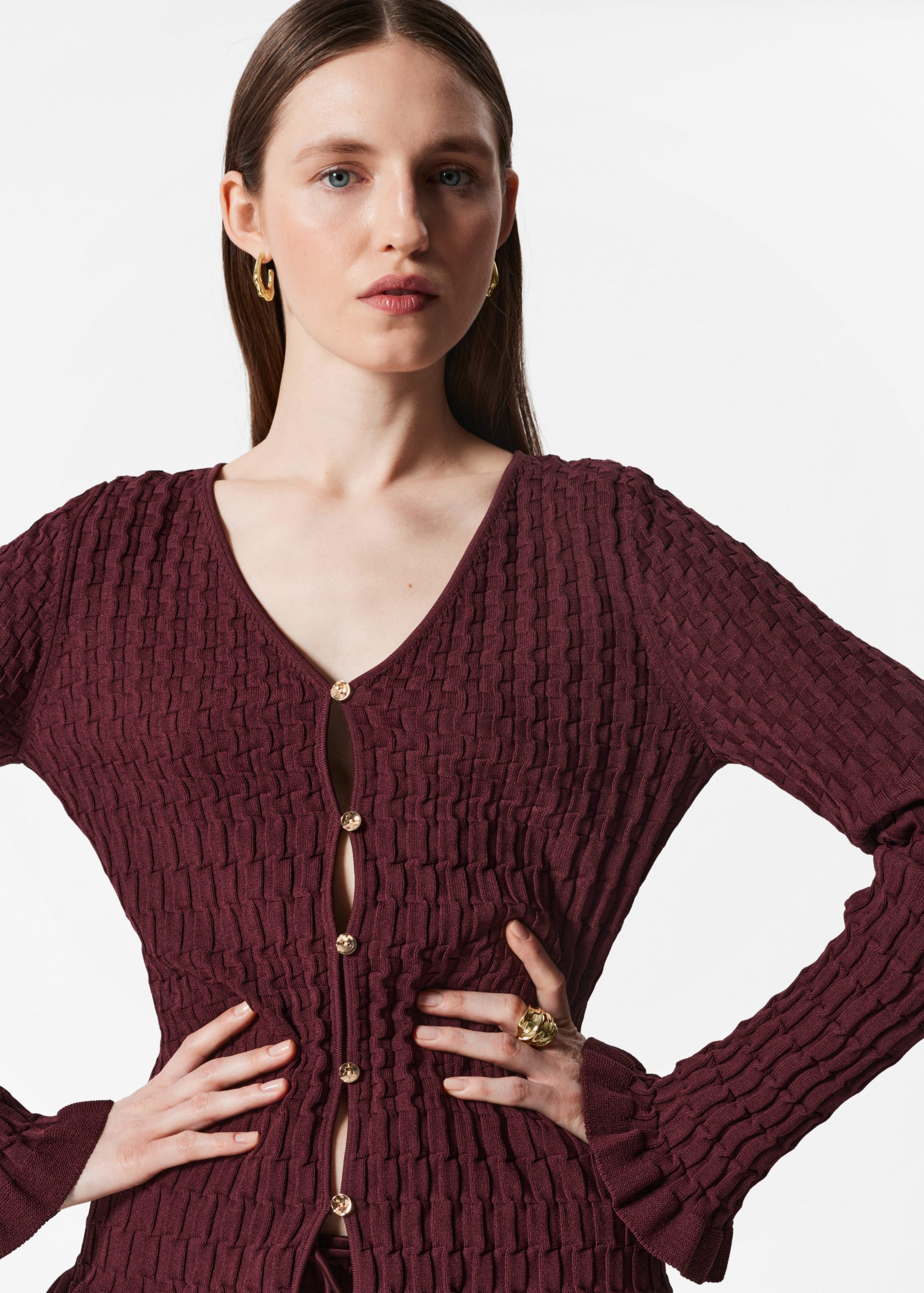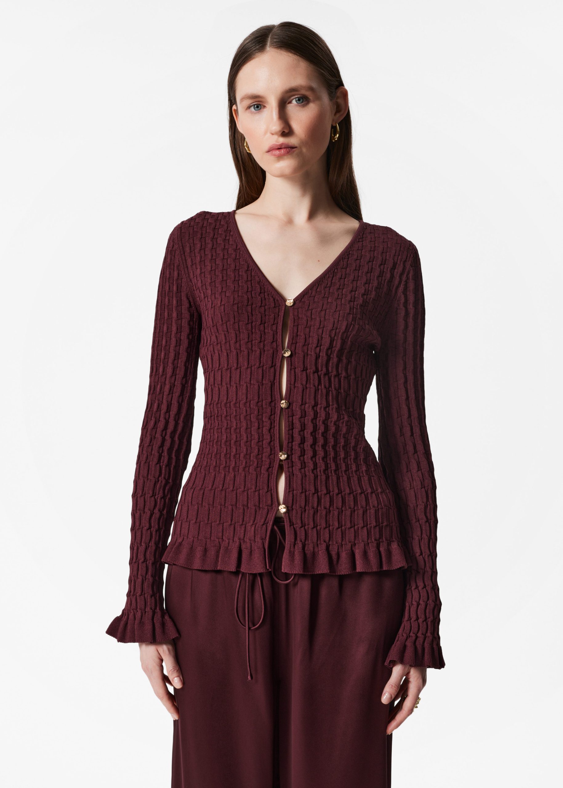 This cardigan is knitted in a structured, basketweave texture. Designed in a fitted silhouette, it features a v-neckline, long fluted sleeves, and flounced edges. A row of gold-toned buttons runs down the front, creating subtle open spaces between closures that offer a glimpse of skin. Wear it as a standalone top or layered over a tank.Â
