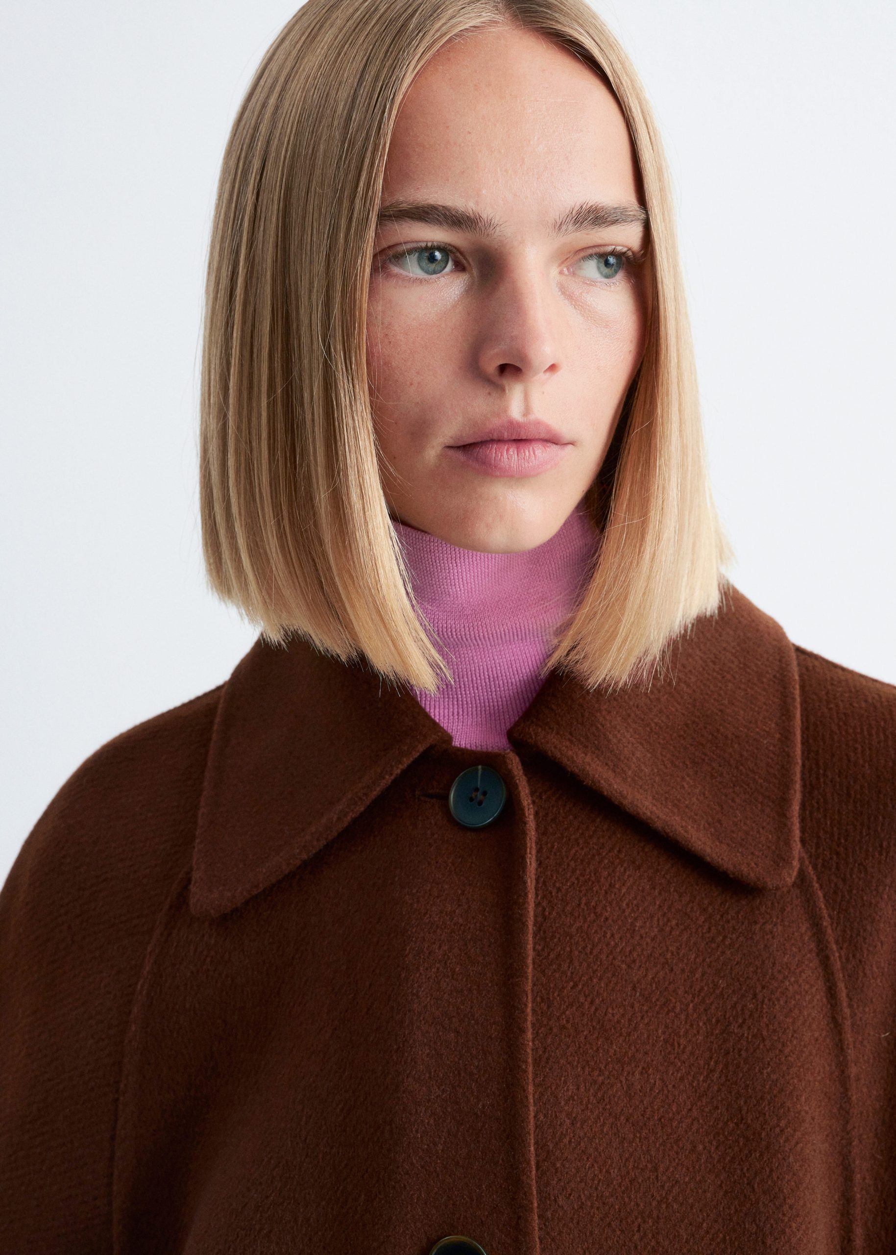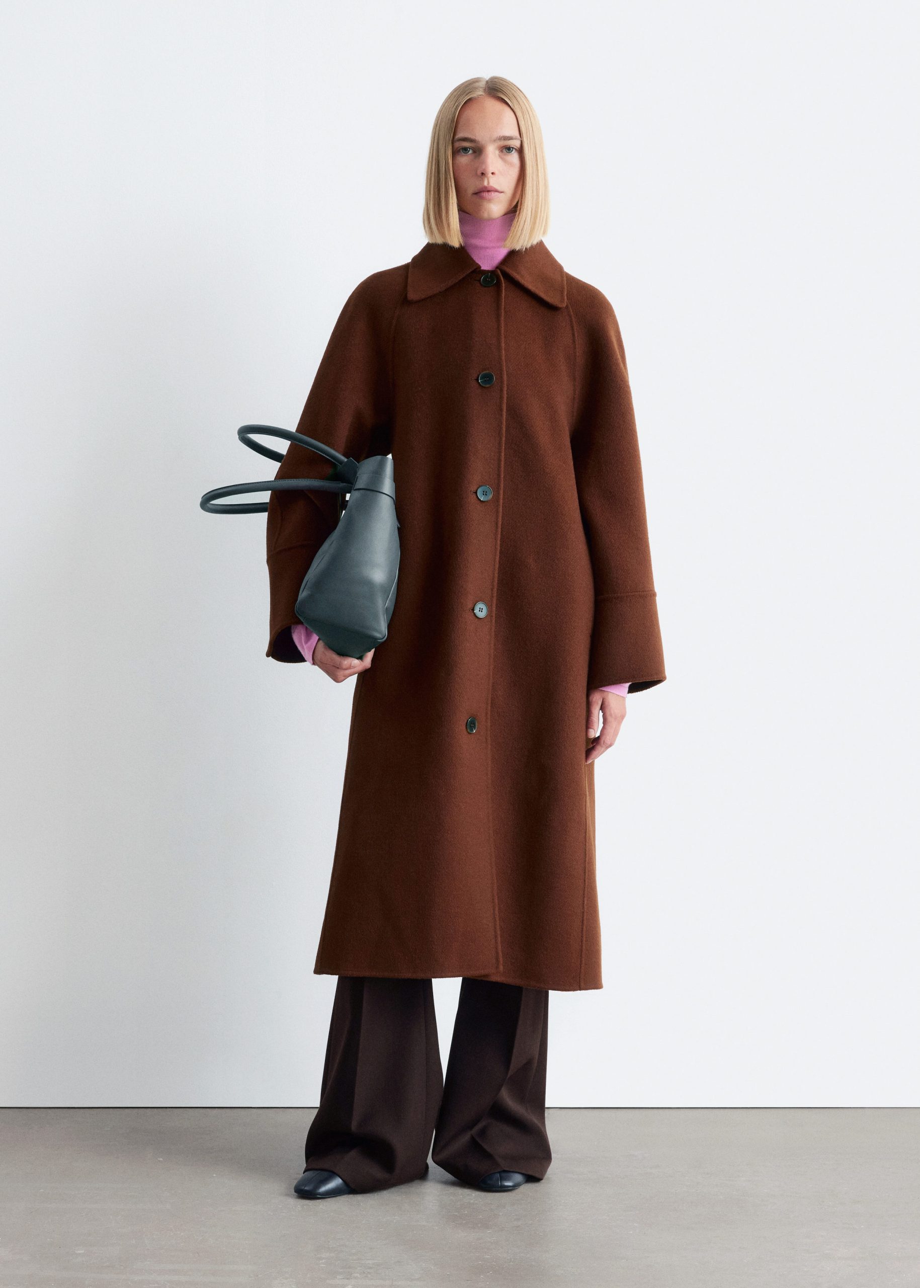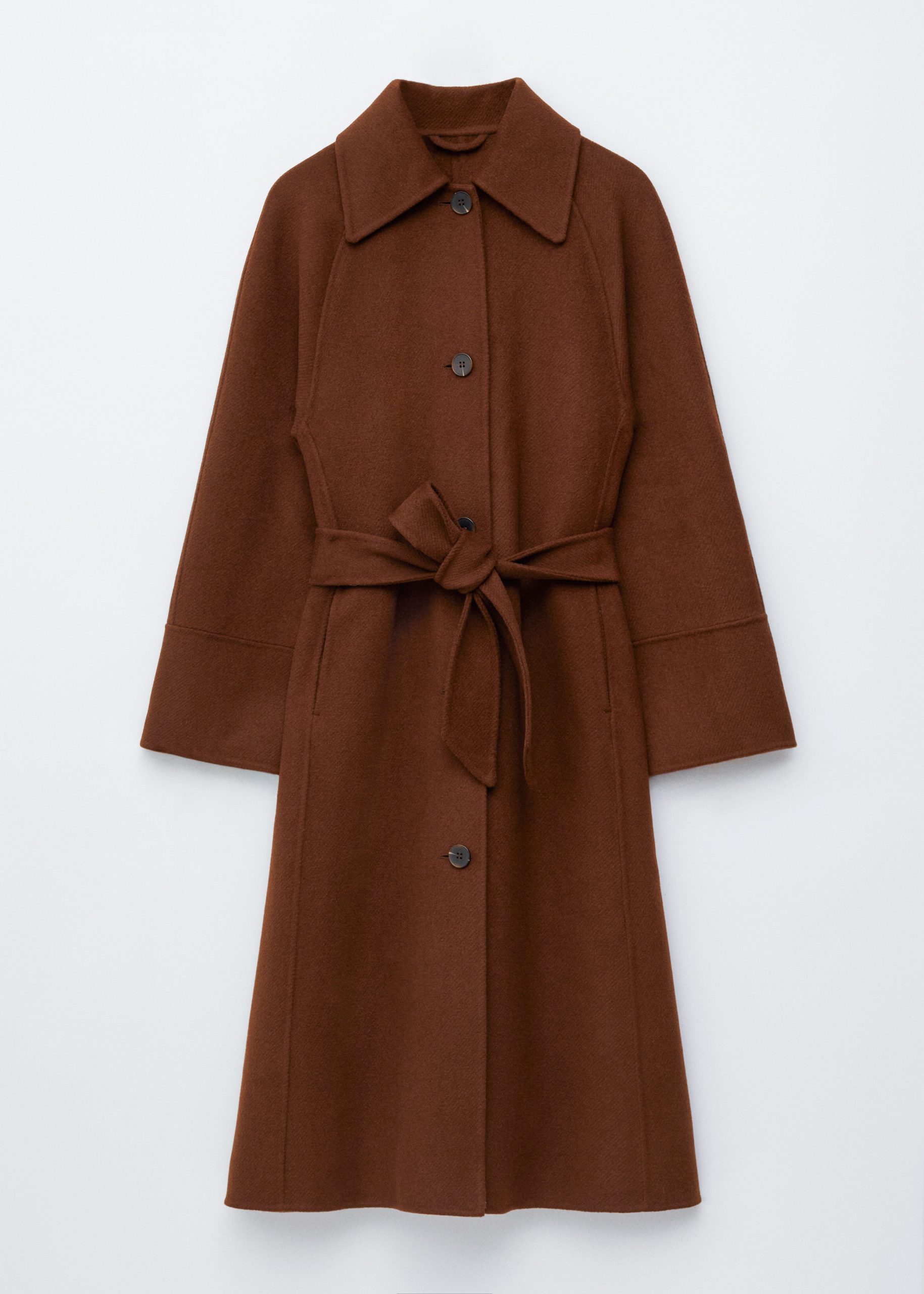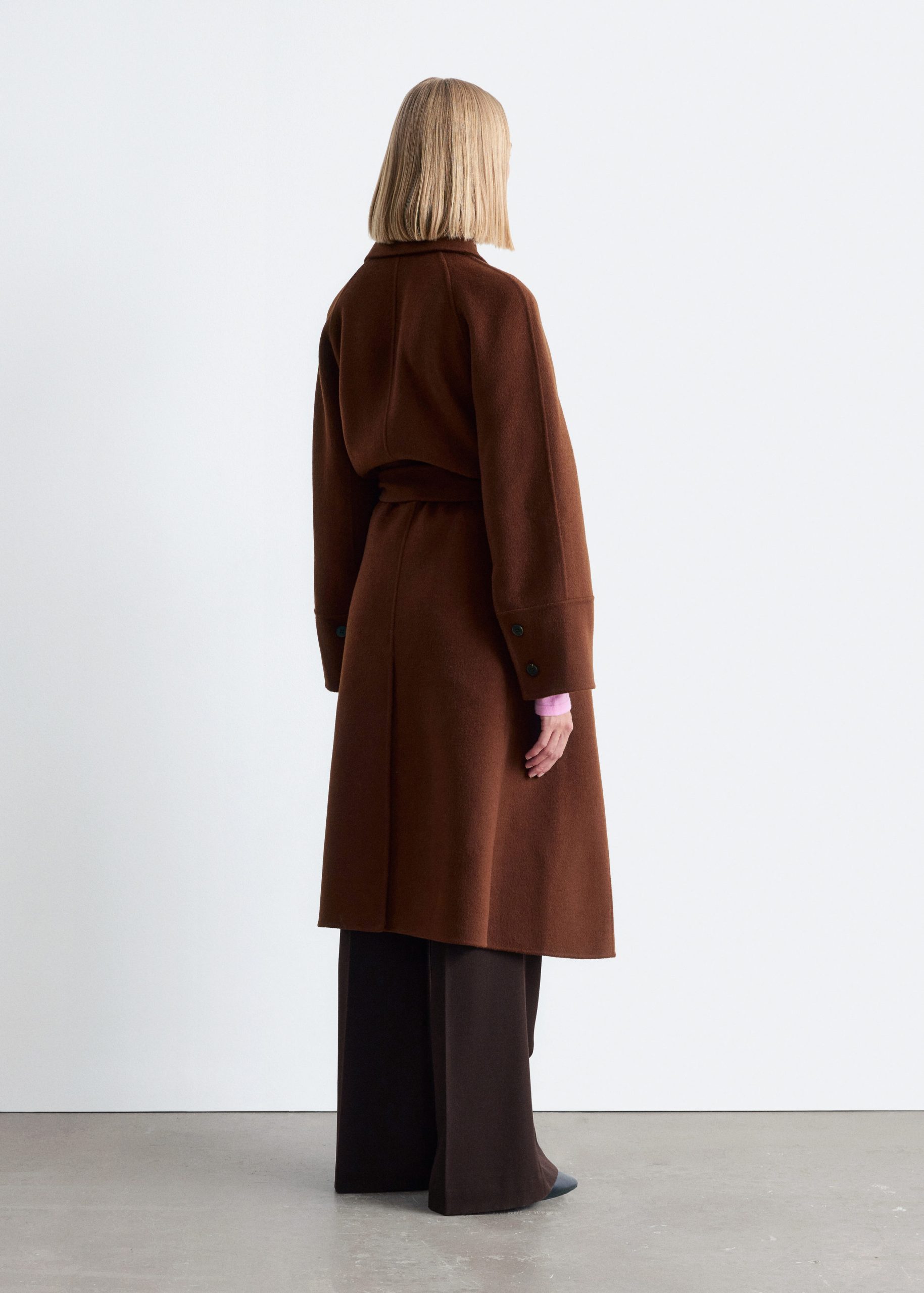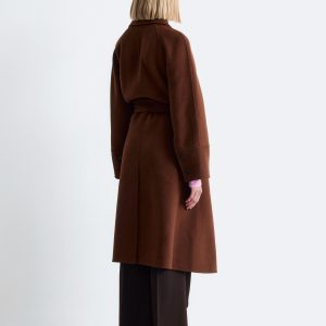 This coat is crafted from a double-faced wool blend. Designed with a loose silhouette that falls to the knee, it features a classic collar and a tie belt to cinch the waist. Finished with buttons down the front and a vent at the back hem. The coat is unlined and detailed with internal bindings for a clean finish.